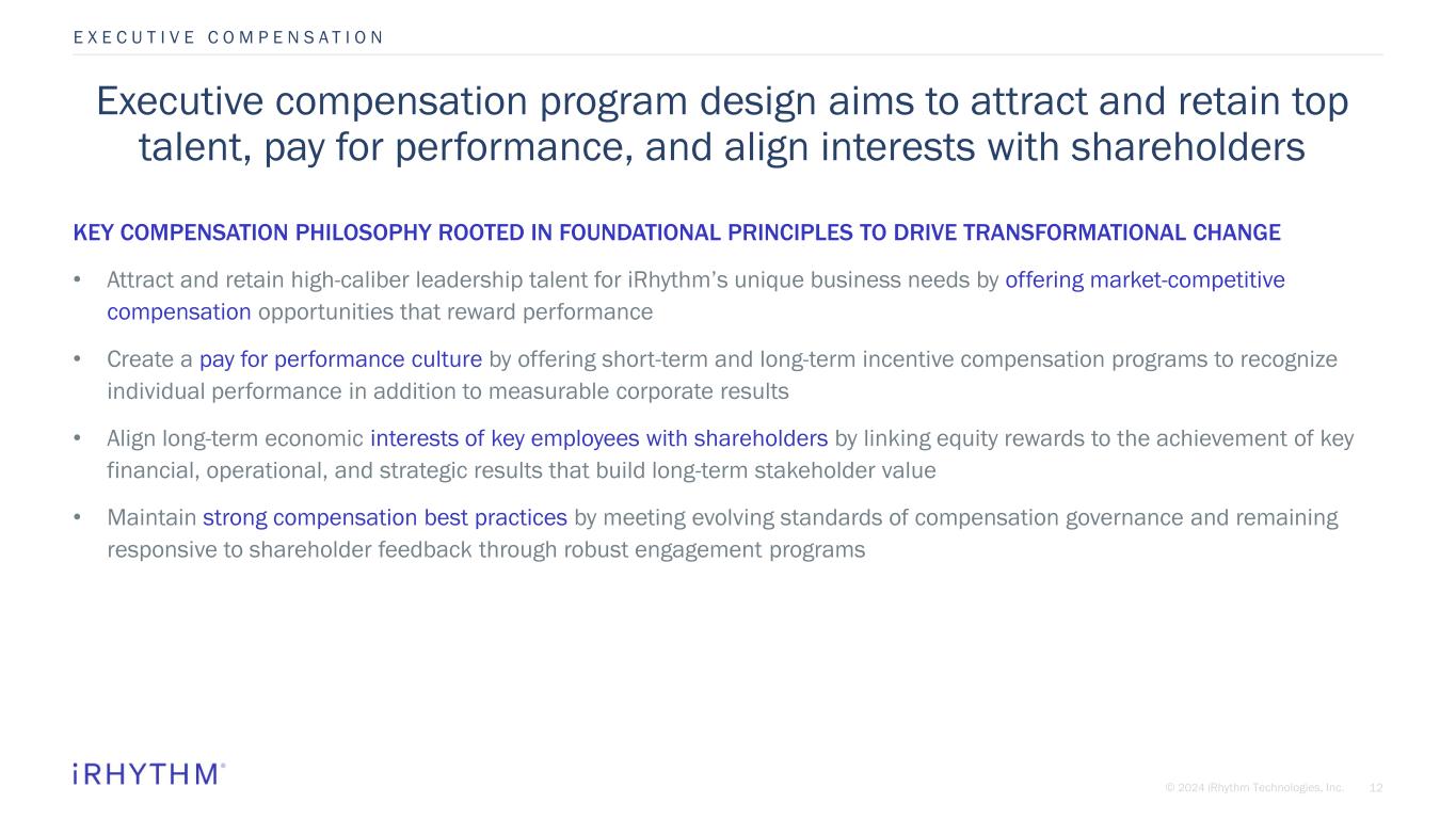 11© 2024 iRhythm Technologies, Inc. QUENTIN BLACKFORD President, CEO, & Director SARA BENDER SVP, Chief of Staff & Corporate Strategy MERVIN SMITH EVP, Business Operations JULIE RODDA SVP, Head of People & Culture Strong leadership appointments are leading transformational improvements at iRhythm PATRICK MURPHY Chief Business Officer & Chief Legal Officer CHAD PATTERSON Chief Commercial Officer MARC ROSENBAUM SVP, Chief Accounting Officer SUMI SHRISHRIMAL EVP, Chief Risk Officer MINTU TURAKHIA, MD MS Chief Medical Officer, Chief Scientific Officer & EVP, Product Innovation DAN WILSON Chief Financial Officer E X E C U T I V E C O M P E N S A T I O N New hire within last three years
