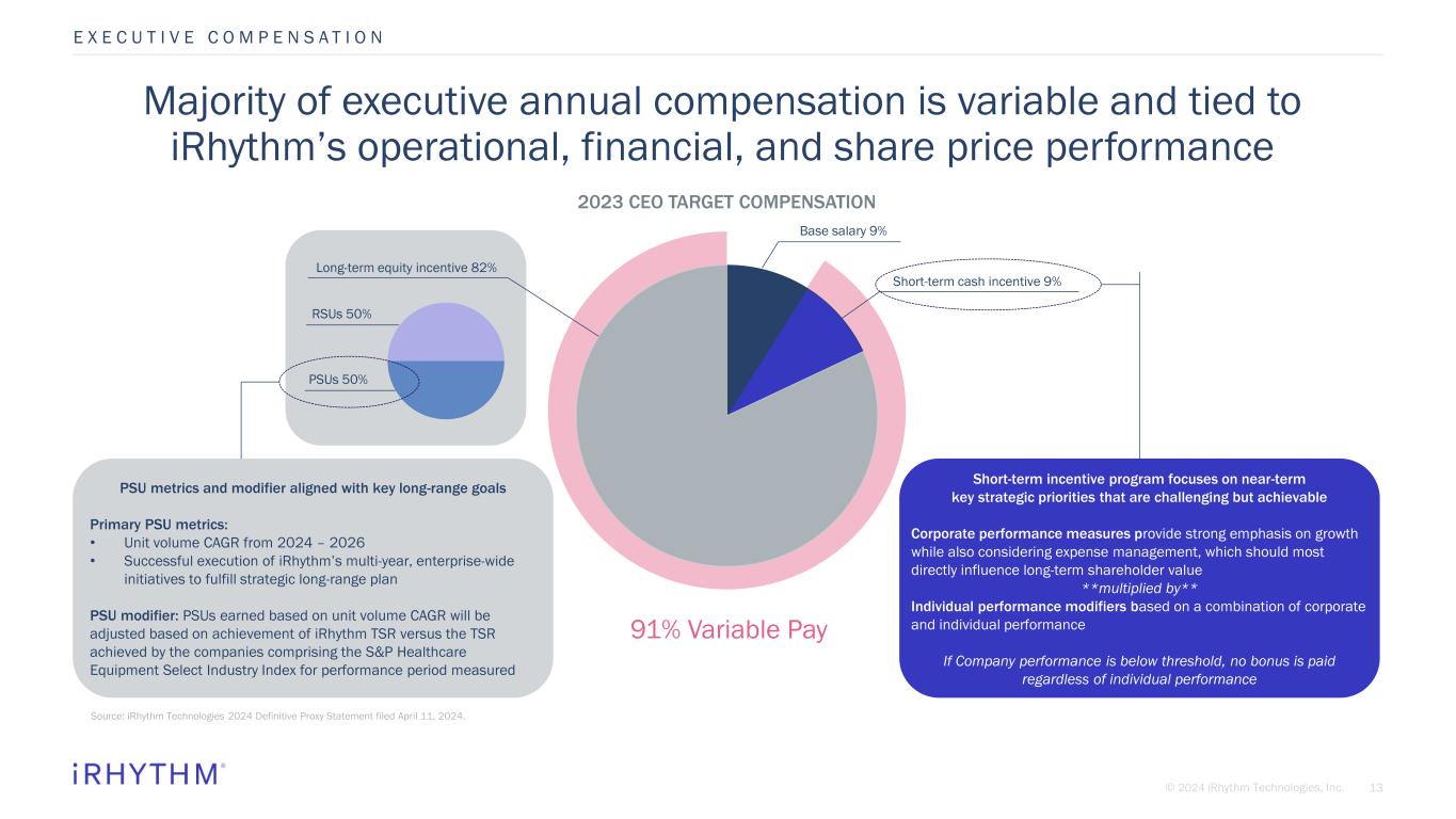12© 2024 iRhythm Technologies, Inc. Executive compensation program design aims to attract and retain top talent, pay for performance, and align interests with shareholders KEY COMPENSATION PHILOSOPHY ROOTED IN FOUNDATIONAL PRINCIPLES TO DRIVE TRANSFORMATIONAL CHANGE • Attract and retain high-caliber leadership talent for iRhythm’s unique business needs by offering market-competitive compensation opportunities that reward performance • Create a pay for performance culture by offering short-term and long-term incentive compensation programs to recognize individual performance in addition to measurable corporate results • Align long-term economic interests of key employees with shareholders by linking equity rewards to the achievement of key financial, operational, and strategic results that build long-term stakeholder value • Maintain strong compensation best practices by meeting evolving standards of compensation governance and remaining responsive to shareholder feedback through robust engagement programs E X E C U T I V E C O M P E N S A T I O N
