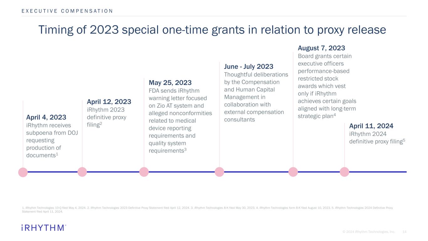 13© 2024 iRhythm Technologies, Inc. 2023 CEO TARGET COMPENSATION Base salary 9% Majority of executive annual compensation is variable and tied to iRhythm’s operational, financial, and share price performance E X E C U T I V E C O M P E N S A T I O N Short-term cash incentive 9% Long-term equity incentive 82% RSUs 50% PSUs 50% PSU metrics and modifier aligned with key long-range goals Primary PSU metrics: • Unit volume CAGR from 2024 – 2026 • Successful execution of iRhythm’s multi-year, enterprise-wide initiatives to fulfill strategic long-range plan PSU modifier: PSUs earned based on unit volume CAGR will be adjusted based on achievement of iRhythm TSR versus the TSR achieved by the companies comprising the S&P Healthcare Equipment Select Industry Index for performance period measured Short-term incentive program focuses on near-term key strategic priorities that are challenging but achievable Corporate performance measures provide strong emphasis on growth while also considering expense management, which should most directly influence long-term shareholder value **multiplied by** Individual performance modifiers based on a combination of corporate and individual performance If Company performance is below threshold, no bonus is paid regardless of individual performance 91% Variable Pay Source: iRhythm Technologies 2024 Definitive Proxy Statement filed April 11, 2024.