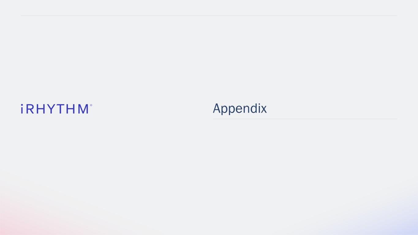 a $148.0 million Second quarter 2024 revenue 5+ million tests Target market opportunity across prioritized EU and APAC countries* Data on file. iRhythm Technologies, August 2024. *See sources in appendix for ‘International opportunity represents $1+ billion TAM with 5+ million tests in prioritized countries across EMEA and Asia Pacific’ ~25 - 30% iRhythm penetration in core U.S. ambulatory cardiac monitoring market as of December 31, 2023 1.8 billion Hours of curated ECG data since company inception thru 2023 100+ Original scientific research manuscripts ~1.9 million Registrations per year ~8 million Patient reports posted since company inception thru 2023 24% Registration growth in 2023 compared to 2022