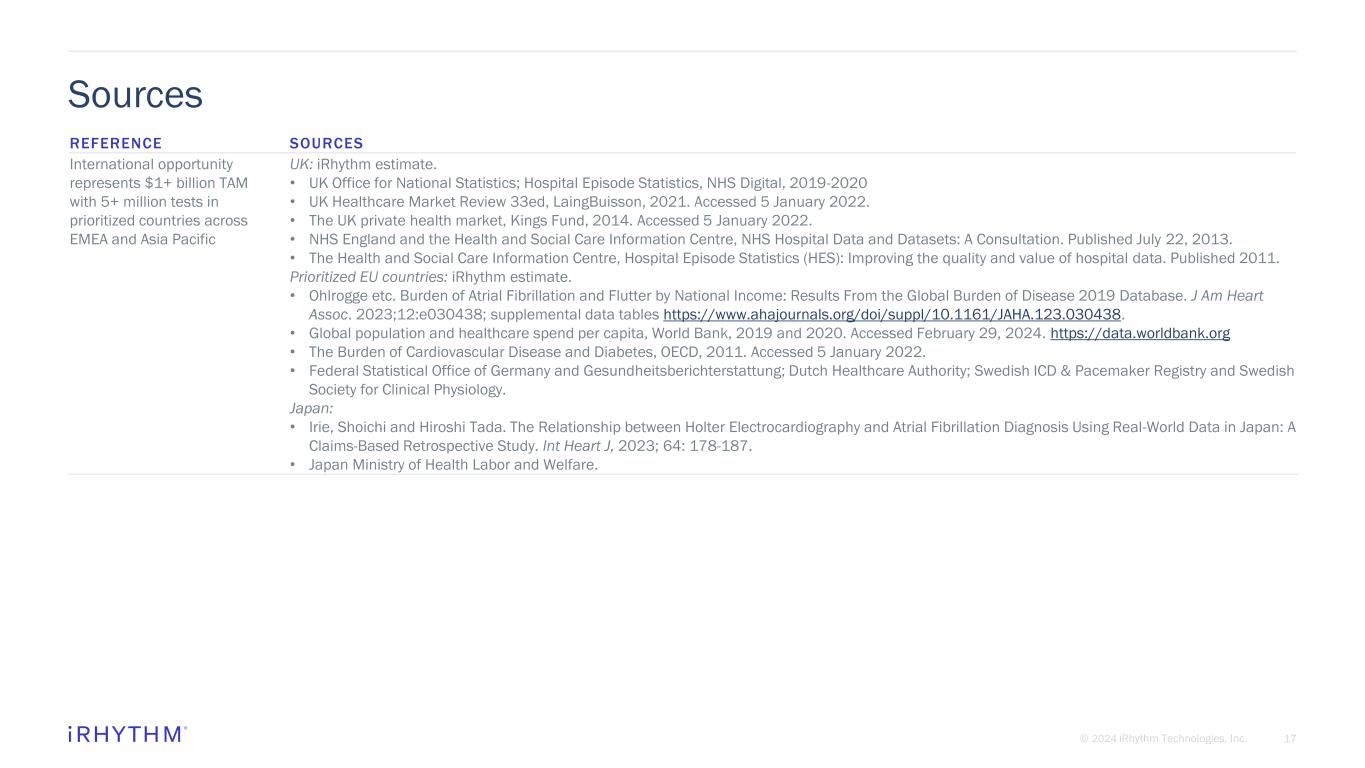 © 2024 iRhythm Technologies, Inc. 17 Sources REFERENCE SOURCES International opportunity represents $1+ billion TAM with 5+ million tests in prioritized countries across EMEA and Asia Pacific UK: iRhythm estimate. • UK Office for National Statistics; Hospital Episode Statistics, NHS Digital, 2019-2020 • UK Healthcare Market Review 33ed, LaingBuisson, 2021. Accessed 5 January 2022. • The UK private health market, Kings Fund, 2014. Accessed 5 January 2022. • NHS England and the Health and Social Care Information Centre, NHS Hospital Data and Datasets: A Consultation. Published July 22, 2013. • The Health and Social Care Information Centre, Hospital Episode Statistics (HES): Improving the quality and value of hospital data. Published 2011. Prioritized EU countries: iRhythm estimate. • Ohlrogge etc. Burden of Atrial Fibrillation and Flutter by National Income: Results From the Global Burden of Disease 2019 Database. J Am Heart Assoc. 2023;12:e030438; supplemental data tables https://www.ahajournals.org/doi/suppl/10.1161/JAHA.123.030438. • Global population and healthcare spend per capita, World Bank, 2019 and 2020. Accessed February 29, 2024. https://data.worldbank.org • The Burden of Cardiovascular Disease and Diabetes, OECD, 2011. Accessed 5 January 2022. • Federal Statistical Office of Germany and Gesundheitsberichterstattung; Dutch Healthcare Authority; Swedish ICD & Pacemaker Registry and Swedish Society for Clinical Physiology. Japan: • Irie, Shoichi and Hiroshi Tada. The Relationship between Holter Electrocardiography and Atrial Fibrillation Diagnosis Using Real-World Data in Japan: A Claims-Based Retrospective Study. Int Heart J, 2023; 64: 178-187. • Japan Ministry of Health Labor and Welfare.