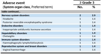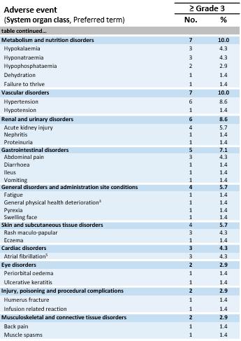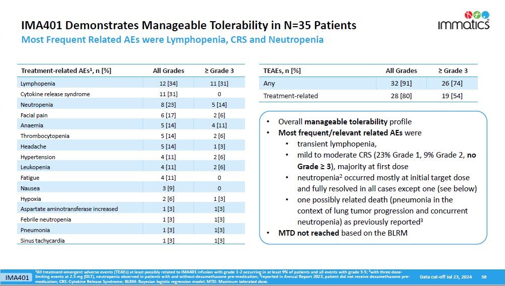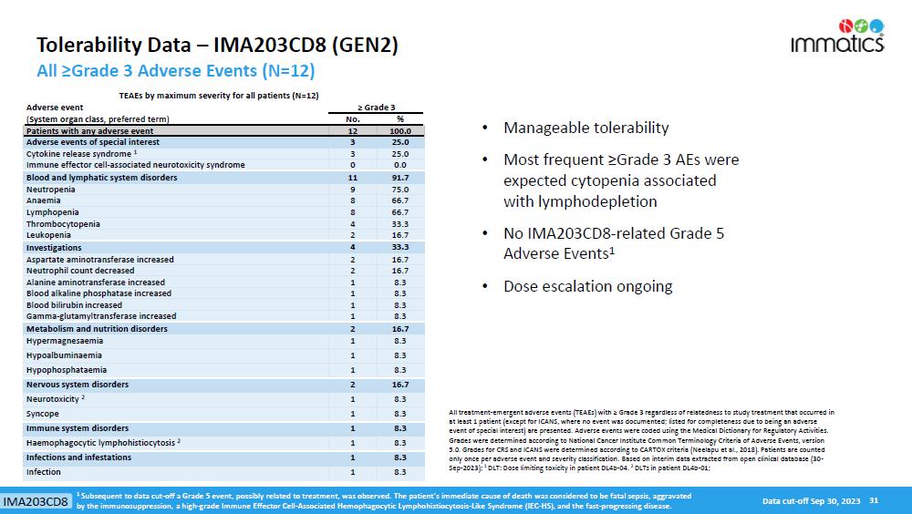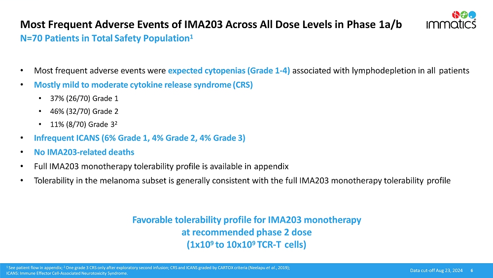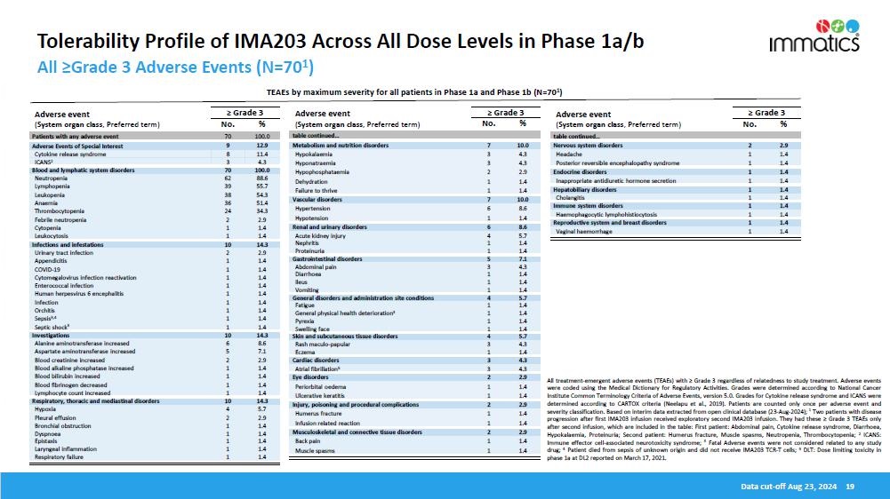 Safety Data. The safety population includes 701 patients in the Phase 1a dose escalation and Phase 1b dose expansion parts of the trial across all dose levels and all tumor types. Grade ≥3 treatment-emergent adverse events (“TEAEs”) were observed in all patients. As shown in the table below, the most frequent adverse events were expected cytopenias (Grade 1-4) associated with lymphodepletion as well as mostly mild to moderate cytokine release syndrome (“CRS”). Some patients infrequently experienced immune effector cell-associated neurotoxicity syndrome (“ICANS’) (Grade 1: 6% of patients, Grade 2: 4% of patients, Grade 3: 4% of patients). No Grade 5 treatment-related adverse events were observed in the safety population, even at doses up to ~10x109 TCR-T cells. The tolerability profile in the Phase 1b melanoma subset is generally consistent with the full IMA203 monotherapy tolerability profile.