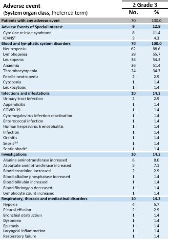 All TEAEs with ≥ Grade 3 regardless of relatedness to study treatment. Adverse events were coded using the Medical Dictionary for Regulatory Activities. Grades were determined according to National Cancer Institute Common Terminology Criteria of Adverse Events, version 5.0. Grades for CRS and ICANS were determined according to CARTOX criteria (Neelapu et al., 2019). Patients are counted only once per adverse event and severity classification. Based on interim data extracted from open clinical database (23-Aug-2024);