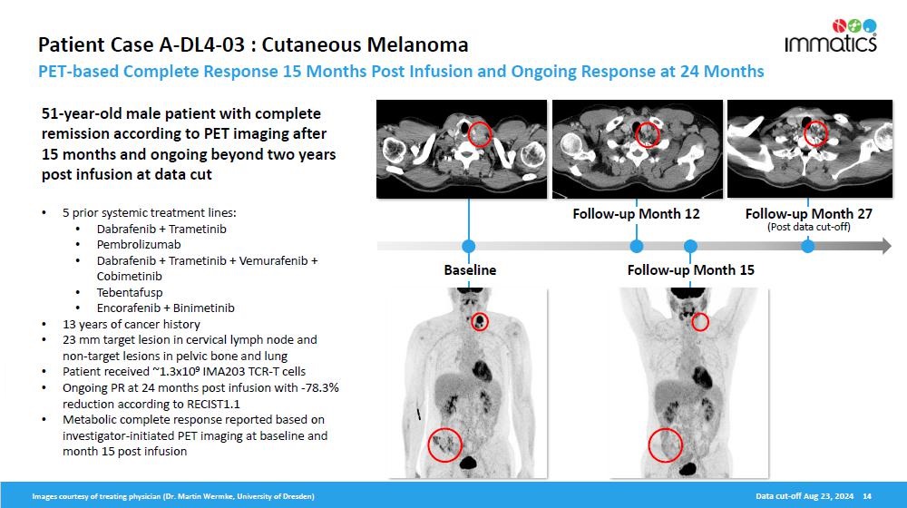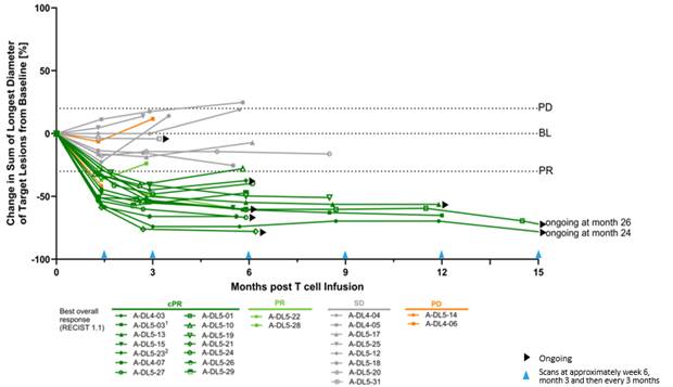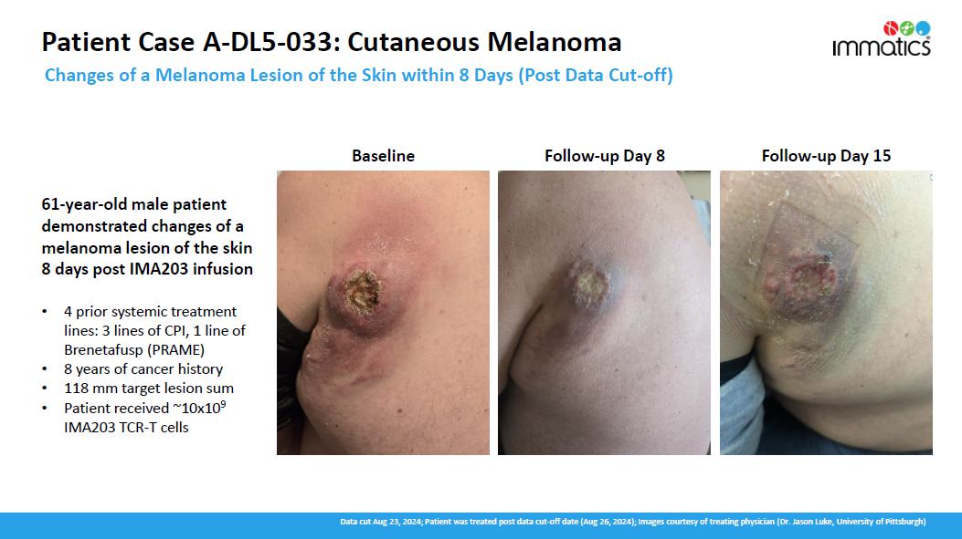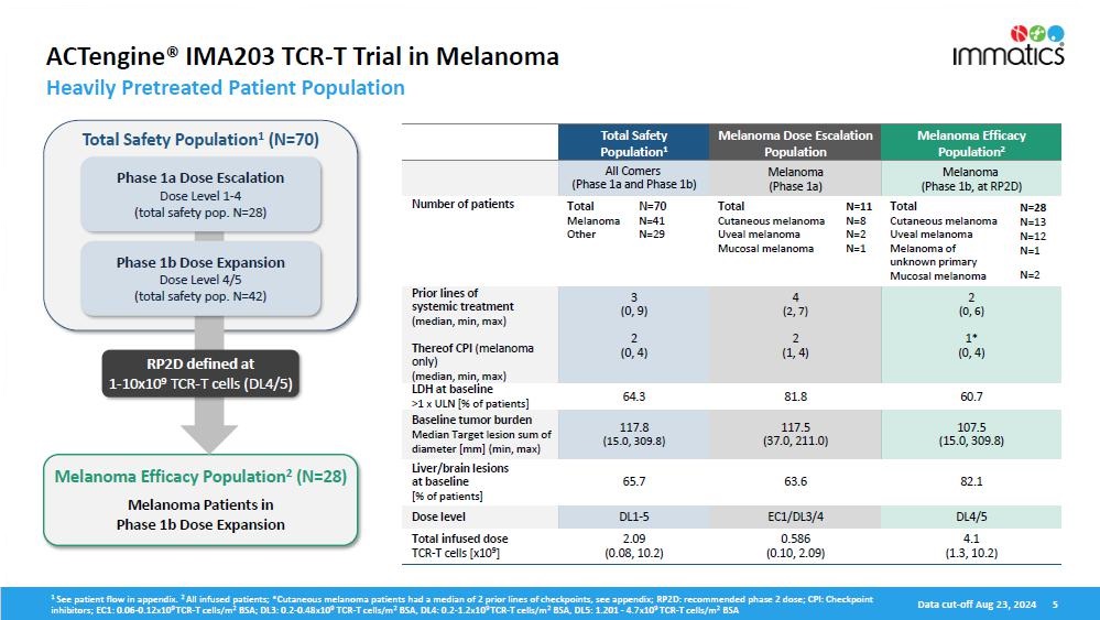 3 Melanoma efficacy population excludes 5 patients treated at DL4 in Phase 1a of the trial as reported in the May 2024 update, based on different manufacturing version used that affects the T cell product.