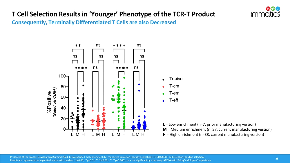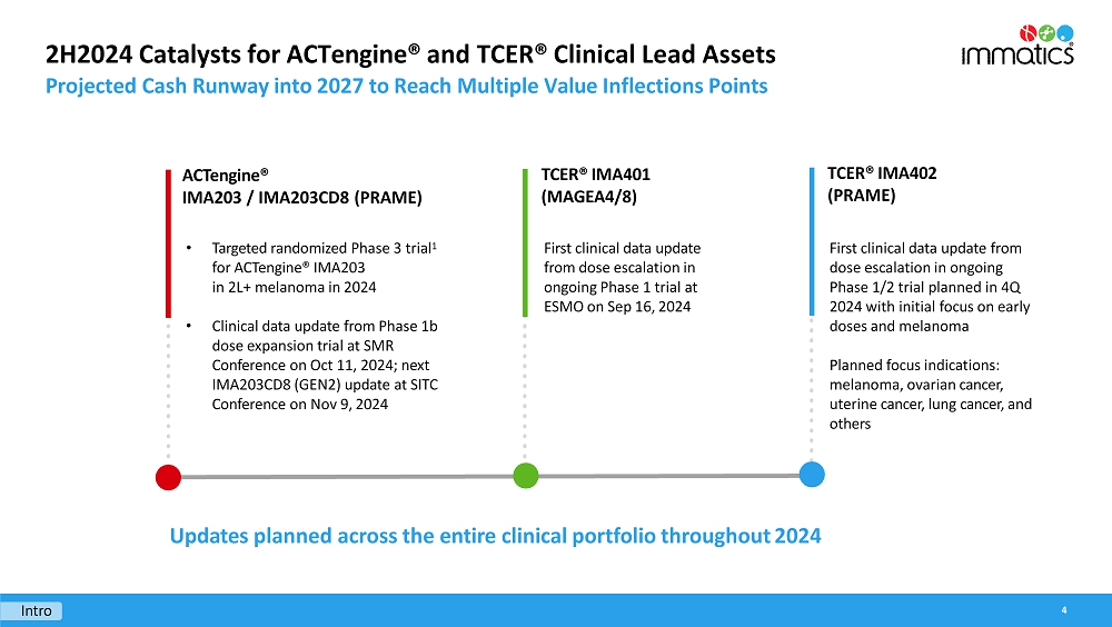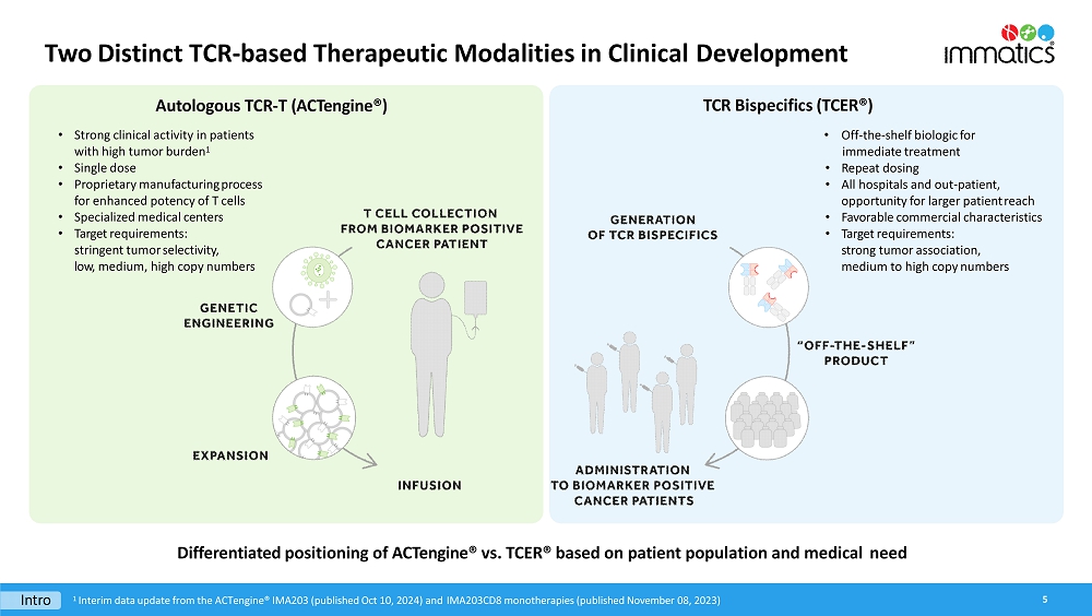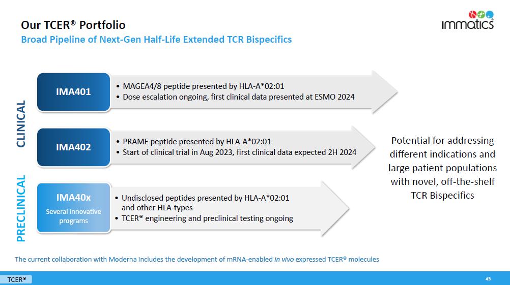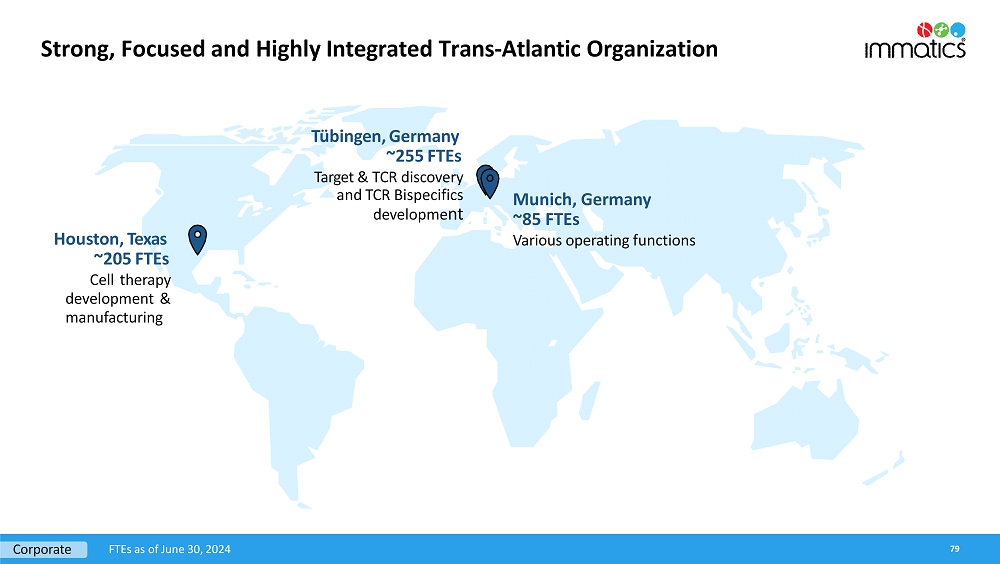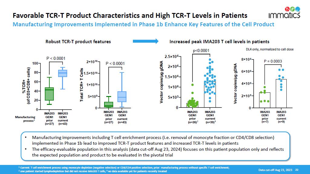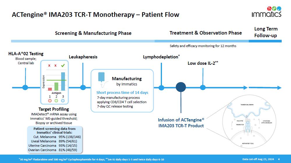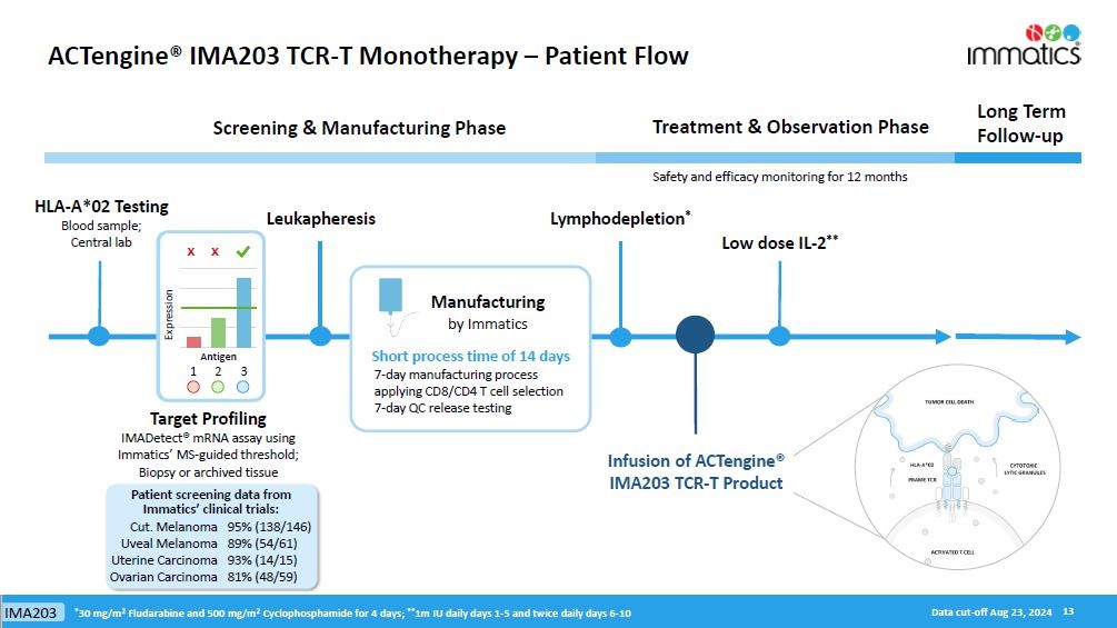 Immatics’ late-stage clinical cell therapy development is supported by its differentiated manufacturing related to timeline, capabilities and facilities. IMA203 cell therapy products are manufactured within 7 days, followed by a 7-day QC release testing at a success rate of >95% to reach the target dose. The Company has also completed construction of a ~100,000 square foot research and development and good manufacturing practices (“GMP”) manufacturing facility with a modular design for efficient and cost-effective scalability intended to serve early-stage and registration-enabling trials, as well as commercial supply. The new site is expected to start GMP manufacturing of cell therapy products in early 2025. Meanwhile, the existing GMP facility, which is run in collaboration with UT Health, will remain active until the end of 2025.