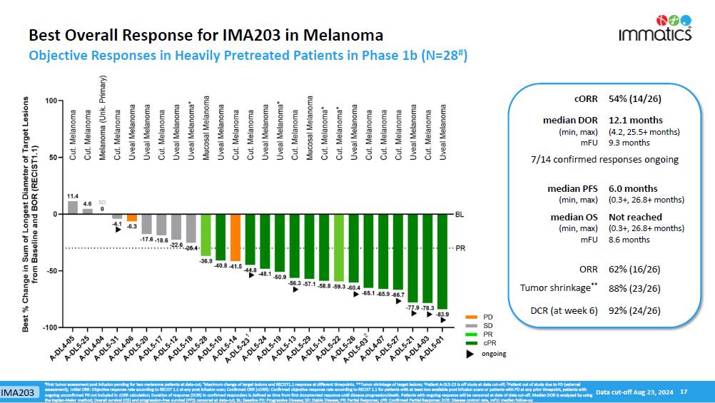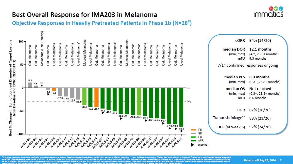 Anti-tumor Activity and Durability. The table below sets forth the observed anti-tumor activity of IMA203 and durability of responses in all melanoma patients in the Phase 1b clinical trial and in cutaneous melanoma patients in the Phase 1b clinical trial. In the melanoma patient population, 7 of the 14 confirmed responses were ongoing as of