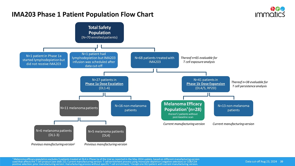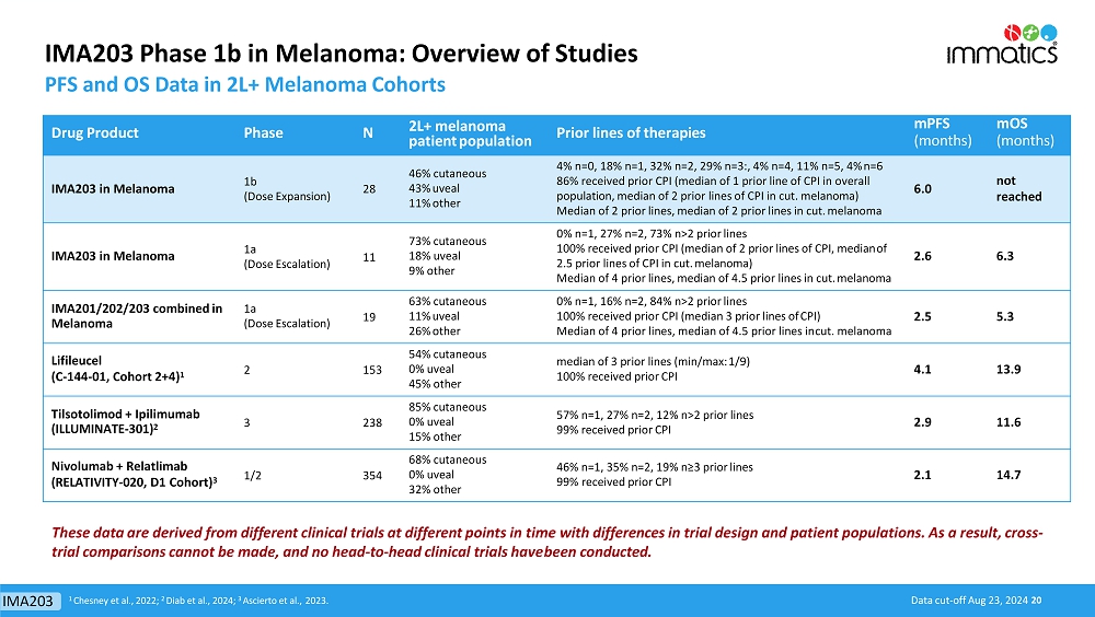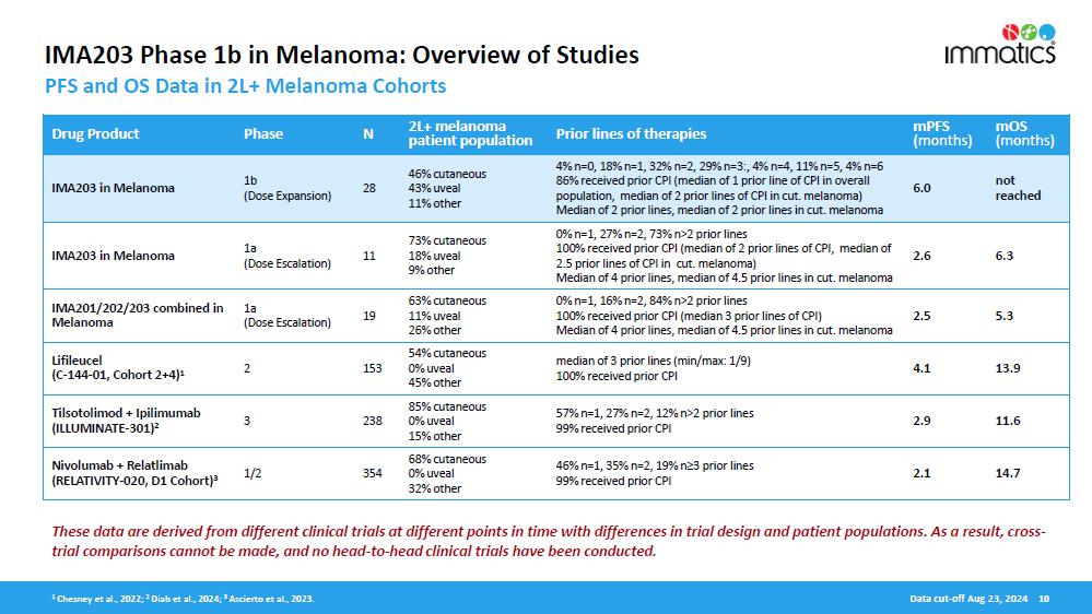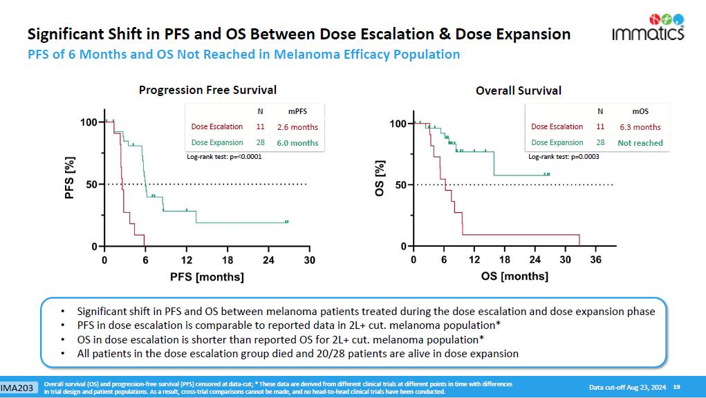 Progression-Free Survival (“PFS”) and Overall Survival (“OS”). Manufacturing improvements were implemented prior to the Phase 1b part of the trial to enhance key features of IMA203. As a result, all patients in dose expansion were treated with an updated version of IMA203 that includes a T cell enrichment process using monocyte depletion (negative selection) or CD8/CD4 positive selection. The updated data demonstrate a significant positive shift in median PFS and median OS between melanoma patients treated during Phase 1a and patients treated in Phase 1b, which is shown in the table below.