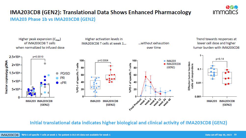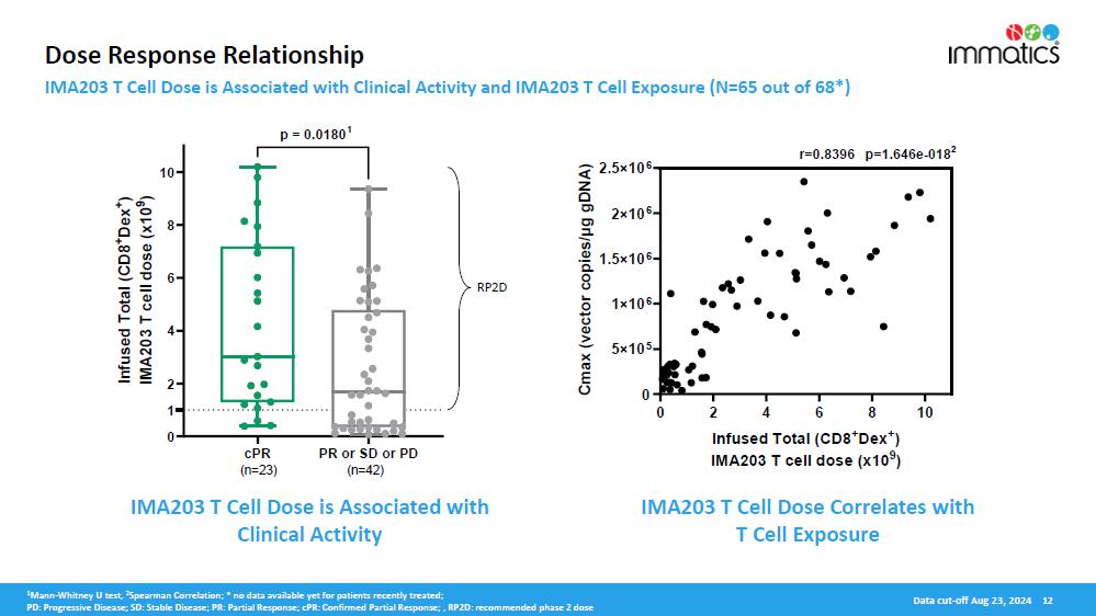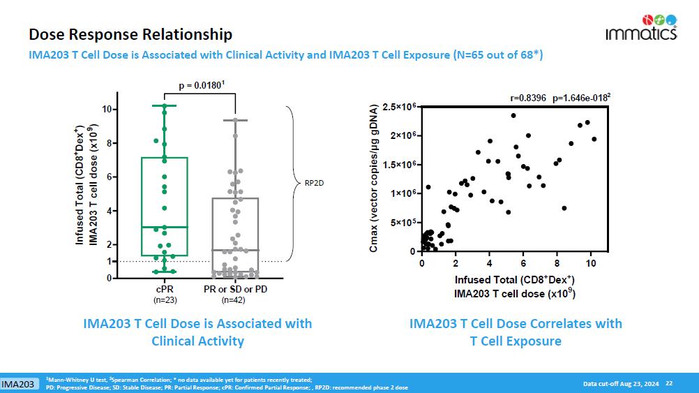 Translational Data. Translational data from patients across Phase 1a and Phase 1b indicate that IMA203 T cells rapidly engrafted in all patients after a single dose and show a persistence of more than two years. Three associations/correlations were observed demonstrating high consistency of dose exposure, biological data and clinical outcome in all patients treated with IMA203 for which samples were available (N=65): First, IMA203 T cell dose is significantly associated with confirmed clinical responses (p=0.02). Second, IMA203 T cell dose is correlated with T cell peak level (cmax, r=0.84, p=1.6x10-18). Third, IMA203 T cell peak level (cmax, p=0.05) and T cell exposure (AUC0-28d, p=0.05) are associated with confirmed clinical responses.