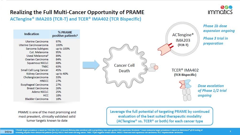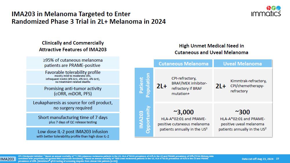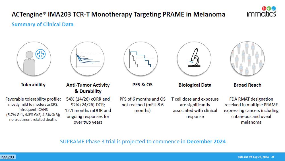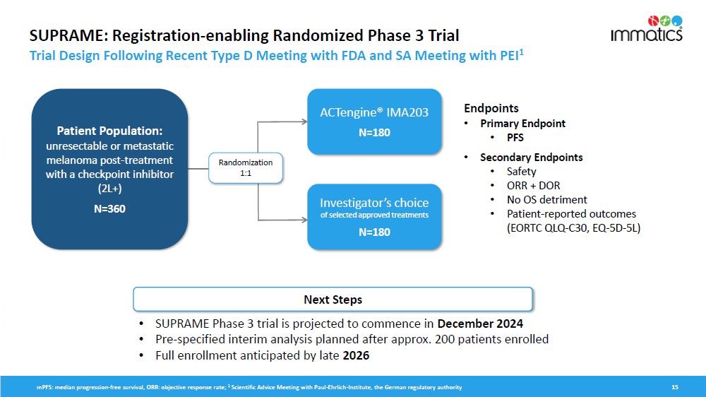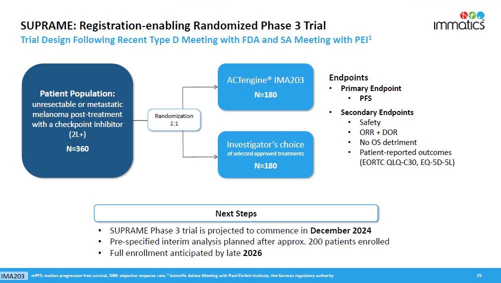 SUPRAME will evaluate IMA203 targeting PRAME in 360 HLA-A*02:01-positive patients with second-line or later (2L+) unresectable or metastatic melanoma who have received prior treatment with a checkpoint inhibitor. Patients will be randomized 1:1 for IMA203 or investigator’s choice of selected approved treatments in the 2L+ setting. Based on the Company’s discussions with the FDA, the primary endpoint for full approval will be median PFS. Given the expected PFS of 2-3 months in this patient population, as well as the PFS of 6 months observed in the data from the IMA203 Phase 1b trial, the Company has determined that utilizing median PFS as the primary endpoint is the fastest pathway to seeking full approval and presents a more attractive commercial positioning as compared to objective response rate (“ORR”). Secondary endpoints for the trial will include ORR, safety, duration of response, no overall survival detriment and patient-reported outcomes. A pre-specified interim analysis is planned for early 2026.