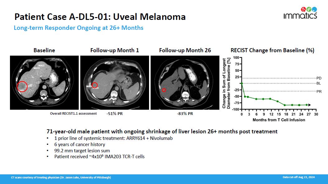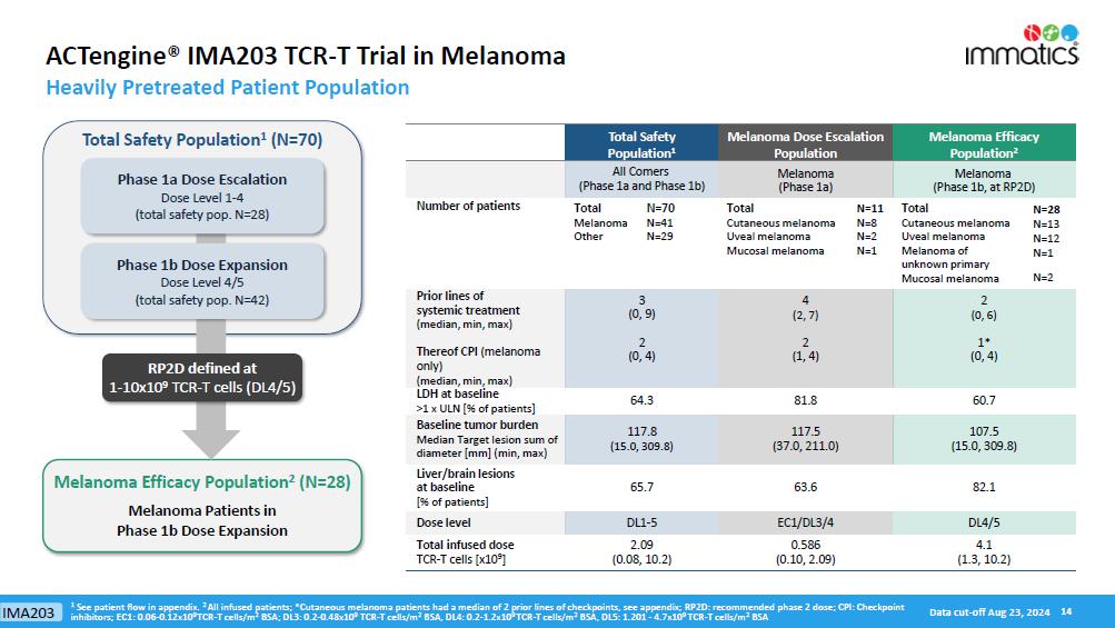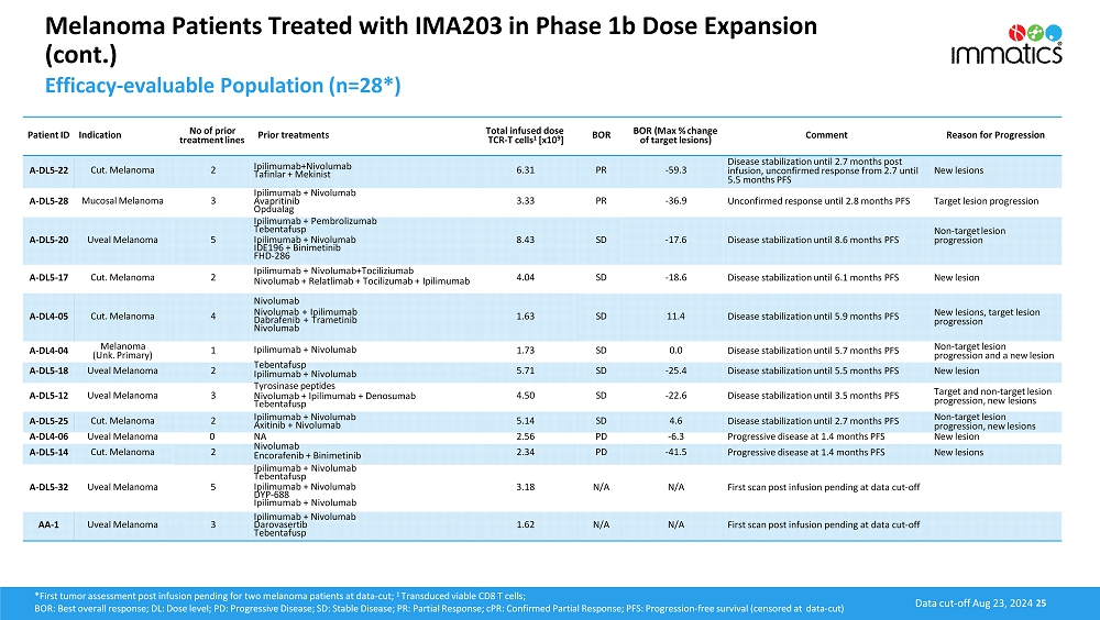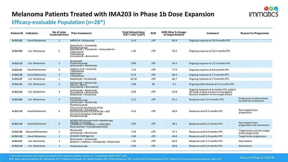 Patient Baseline Characteristics. As of data cutoff, 28 heavily pretreated patients with metastatic melanoma were treated with IMA203 at the recommended Phase 2 dose (“RP2D”) of 1 to 10 billion total TCR-T cells during the Phase 1b dose expansion part of the clinical trial. The treated patient population is composed of patients with a median of 2 lines of prior systemic treatments, consisting of cutaneous melanoma patients (N=13), uveal melanoma patients (N=12), mucosal melanoma patients (N=2) and a patient with melanoma of unknown primary (N=1).