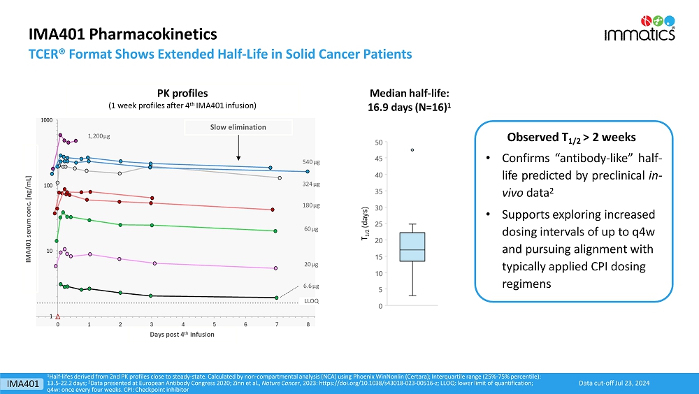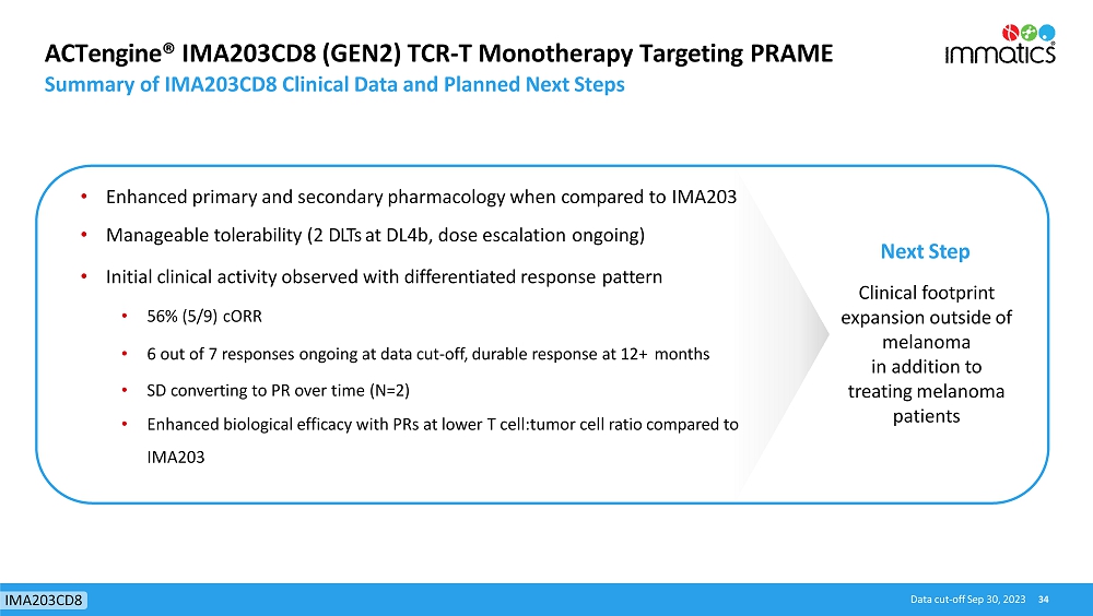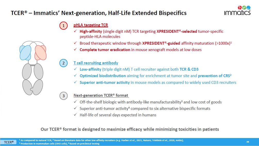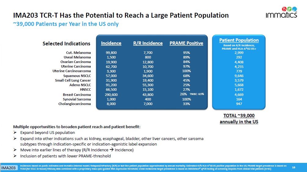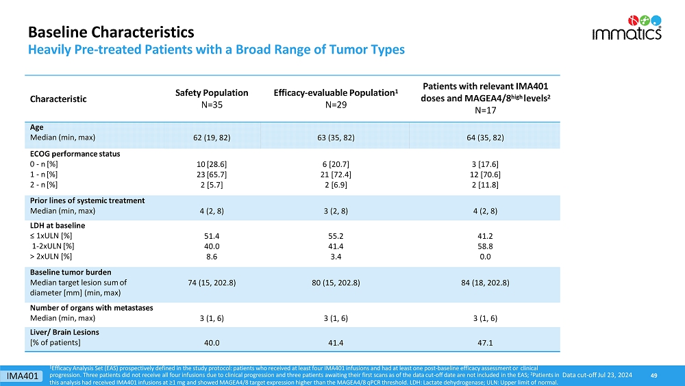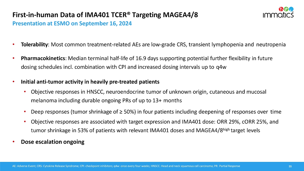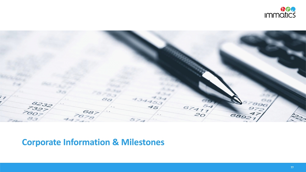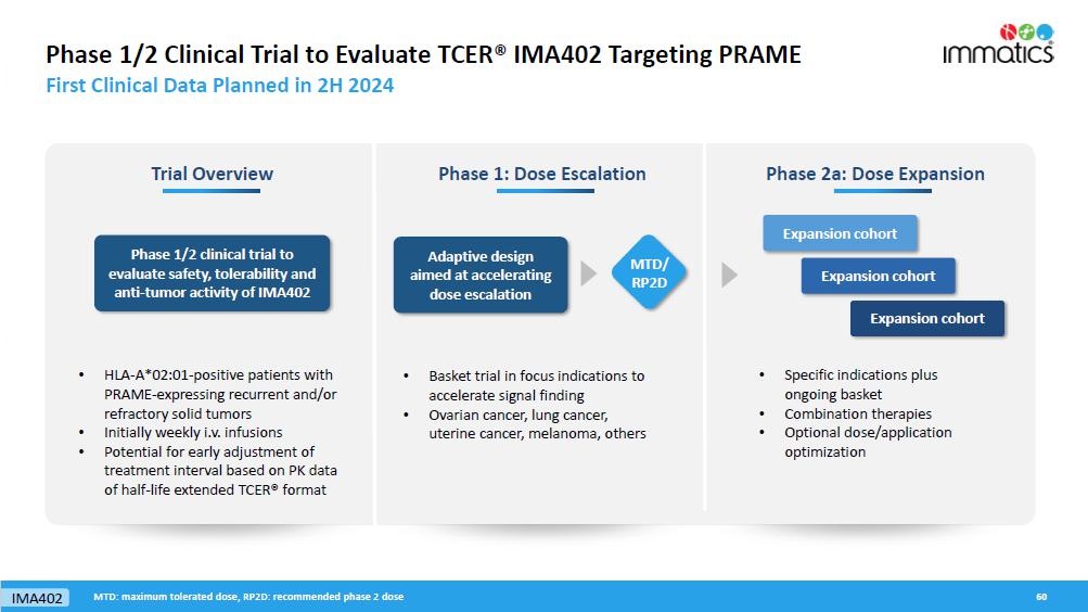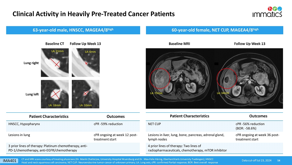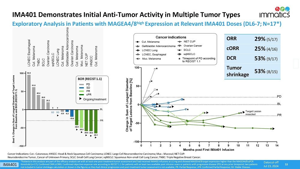 rates, the Company’s focus on partnerships to advance its strategy, and other metrics are forward-looking statements. In some cases, you can identify forward-looking statements by terminology such as “may”, “should”, “expect”, “plan”, “target”, “intend”, “will”, “estimate”, “anticipate”, “believe”, “predict”, “potential” or “continue”, or the negatives of these terms or variations of them or similar terminology. Such forward-looking statements are subject to risks, uncertainties, and other factors which could cause actual results to differ materially from those expressed or implied by such forward-looking statements. These forward-looking statements are based upon estimates and assumptions that, while considered reasonable by Immatics and its management, are inherently uncertain. New risks and uncertainties may emerge from time to time, and it is not possible to predict all risks and uncertainties. Factors that may cause actual results to differ materially from current expectations include, but are not limited to, various factors beyond management’s control including general economic conditions and other risks, uncertainties and factors set forth in the Company’s Annual Report on Form 20-F and other filings with the Securities and Exchange Commission (SEC). Nothing in this report should be regarded as a representation by any person that the forward-looking statements set forth herein will be achieved or that any of the contemplated results of such forward-looking statements will be achieved. You should not place undue reliance on forward-looking statements, which speak only as of the date they are made. The Company undertakes no duty to update these forward-looking statements. All the scientific and clinical data presented within this report are – by definition prior to completion of the clinical trial and a clinical study report – preliminary in nature and subject to further quality checks including customary source data verification.