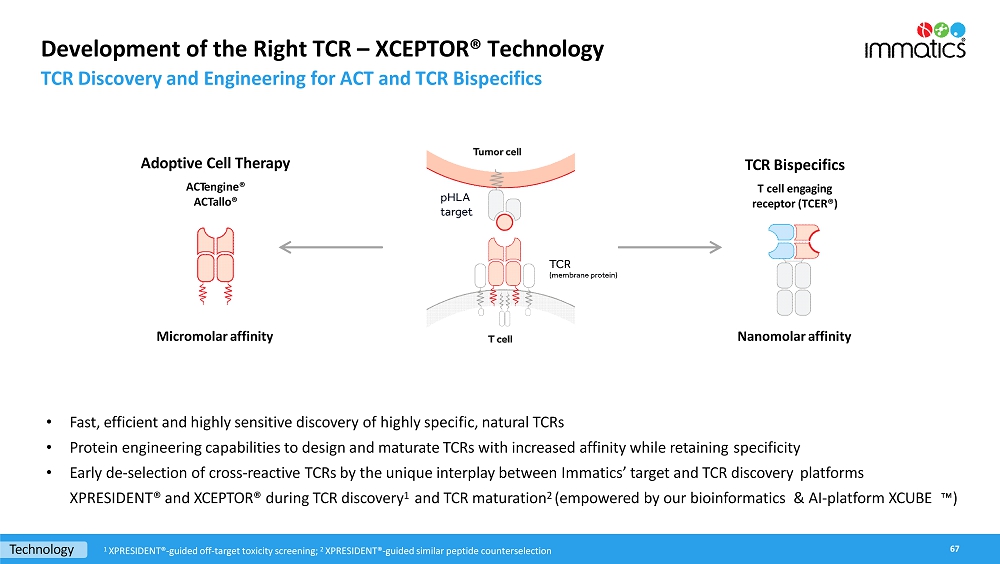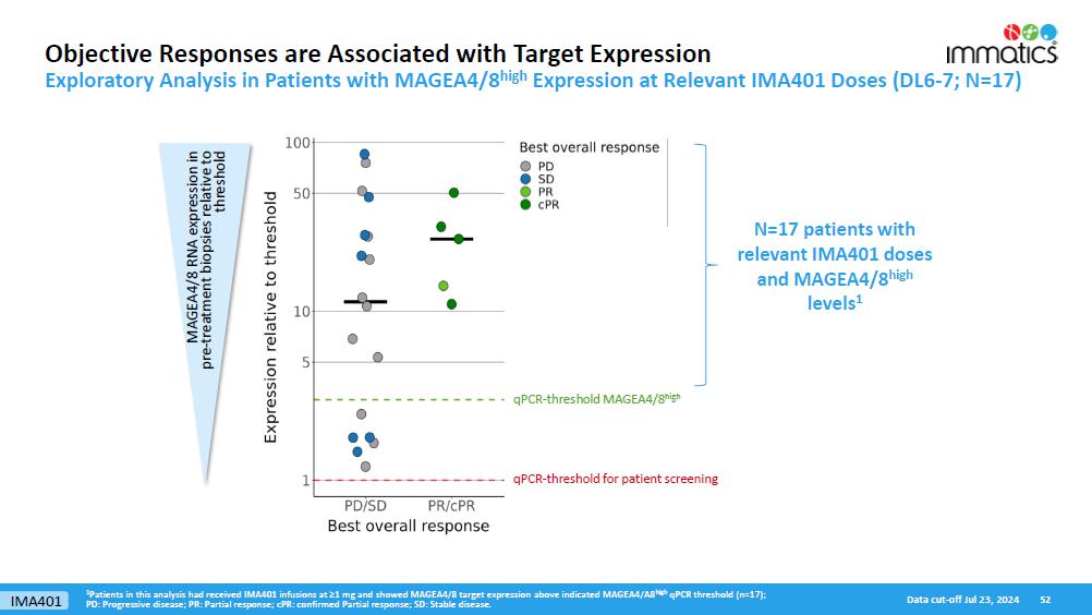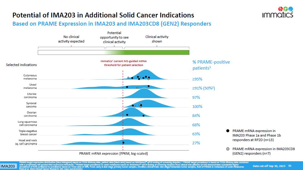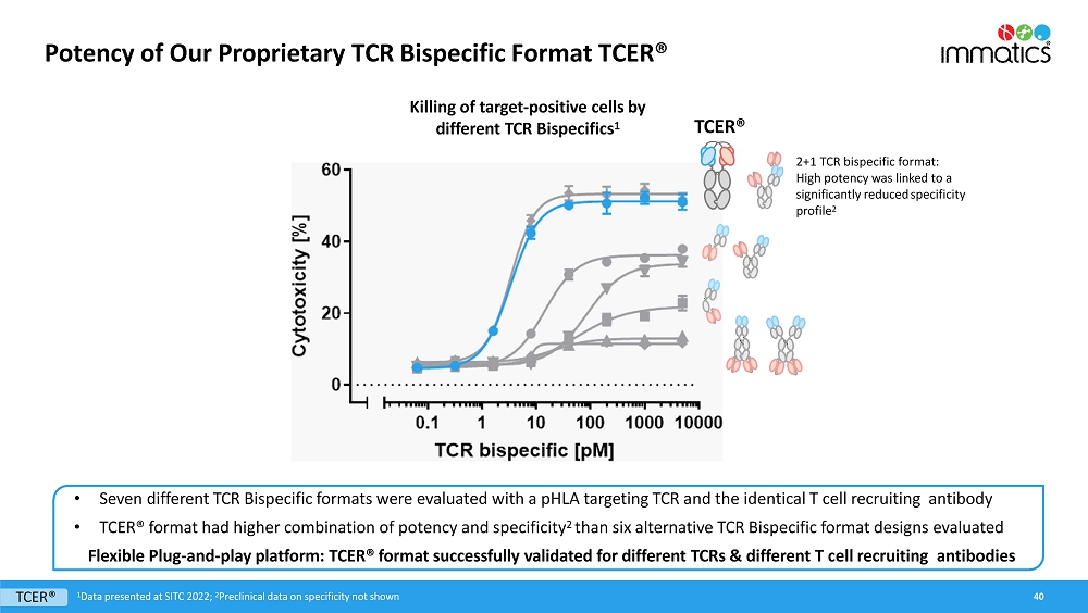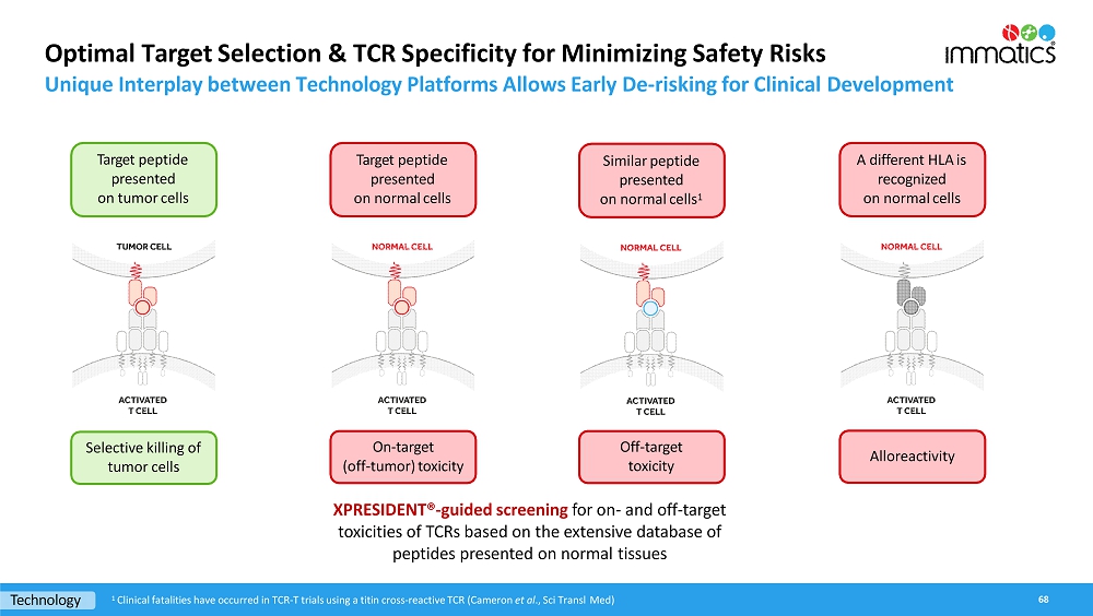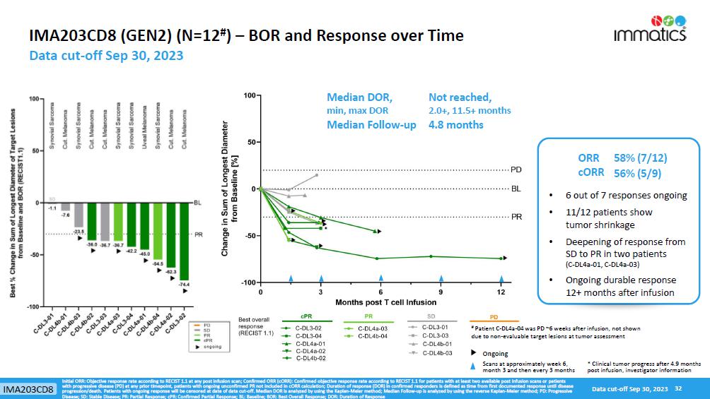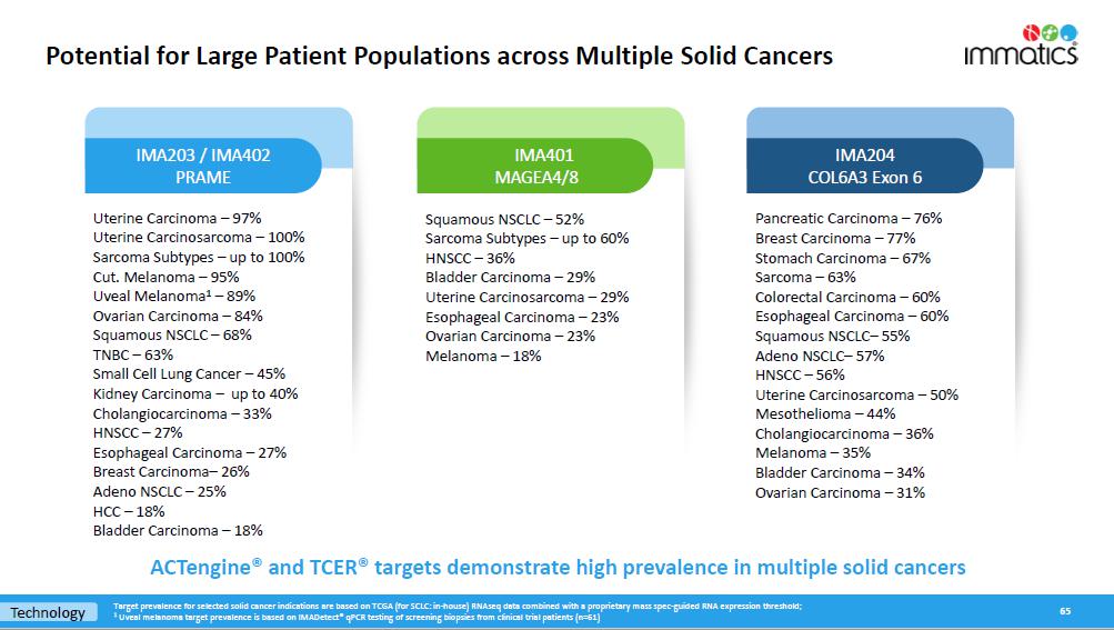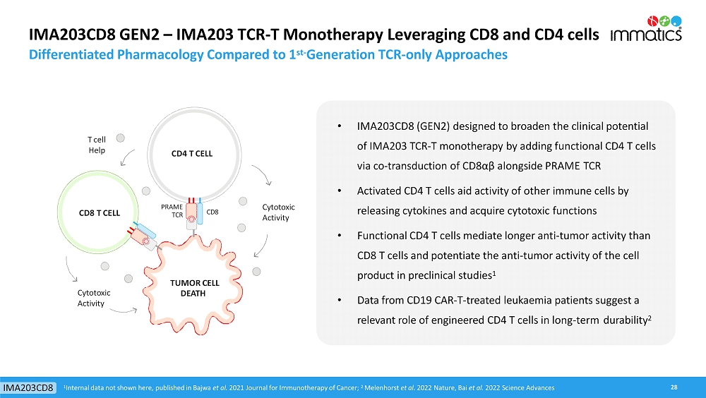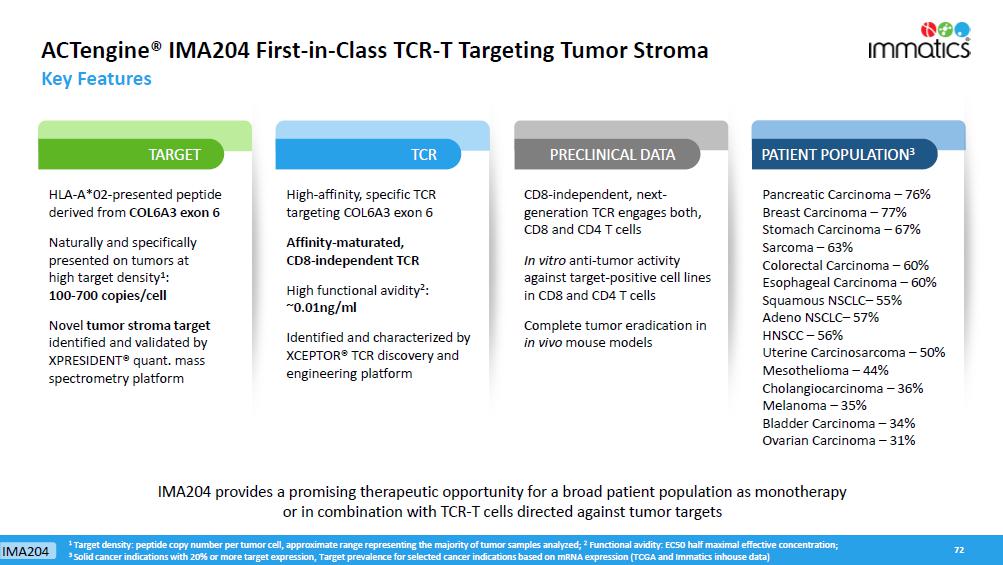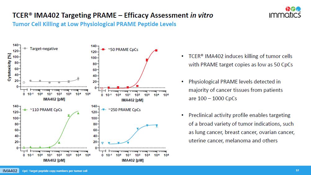 rates, the Company’s focus on partnerships to advance its strategy, and other metrics are forward-looking statements. In some cases, you can identify forward-looking statements by terminology such as “may”, “should”, “expect”, “plan”, “target”, “intend”, “will”, “estimate”, “anticipate”, “believe”, “predict”, “potential” or “continue”, or the negatives of these terms or variations of them or similar terminology. Such forward-looking statements are subject to risks, uncertainties, and other factors which could cause actual results to differ materially from those expressed or implied by such forward-looking statements. These forward-looking statements are based upon estimates and assumptions that, while considered reasonable by Immatics and its management, are inherently uncertain. New risks and uncertainties may emerge from time to time, and it is not possible to predict all risks and uncertainties. Factors that may cause actual results to differ materially from current expectations include, but are not limited to, various factors beyond management’s control including general economic conditions and other risks, uncertainties and factors set forth in the Company’s Annual Report on Form 20-F and other filings with the Securities and Exchange Commission (SEC). Nothing in this report should be regarded as a representation by any person that the forward-looking statements set forth herein will be achieved or that any of the contemplated results of such forward-looking statements will be achieved. You should not place undue reliance on forward-looking statements, which speak only as of the date they are made. The Company undertakes no duty to update these forward-looking statements. All the scientific and clinical data presented within this report are – by definition prior to completion of the clinical trial and a clinical study report – preliminary in nature and subject to further quality checks including customary source data verification.