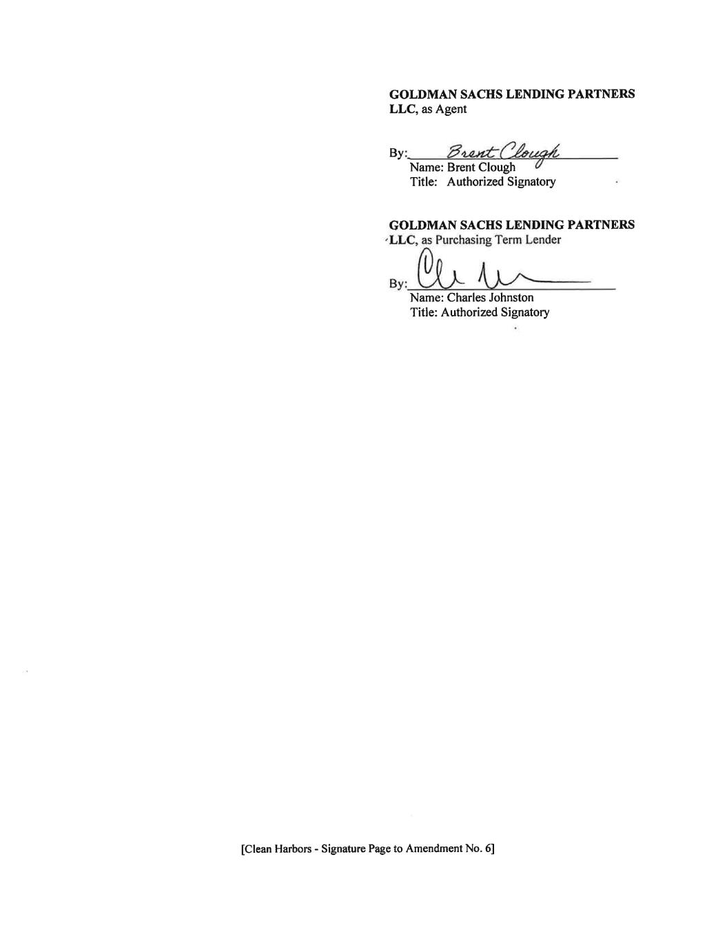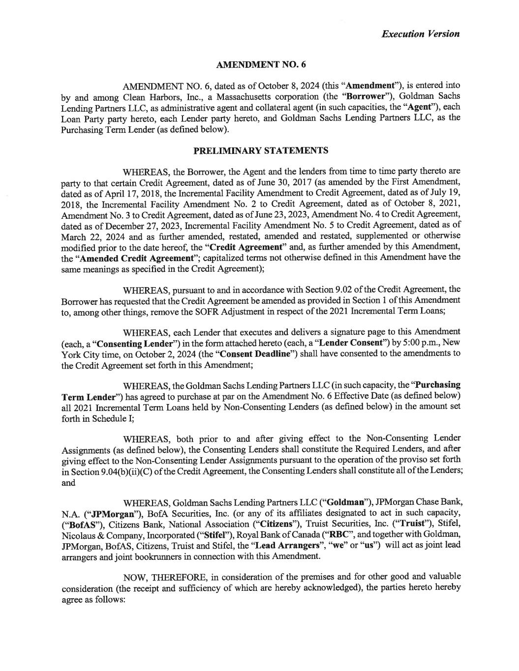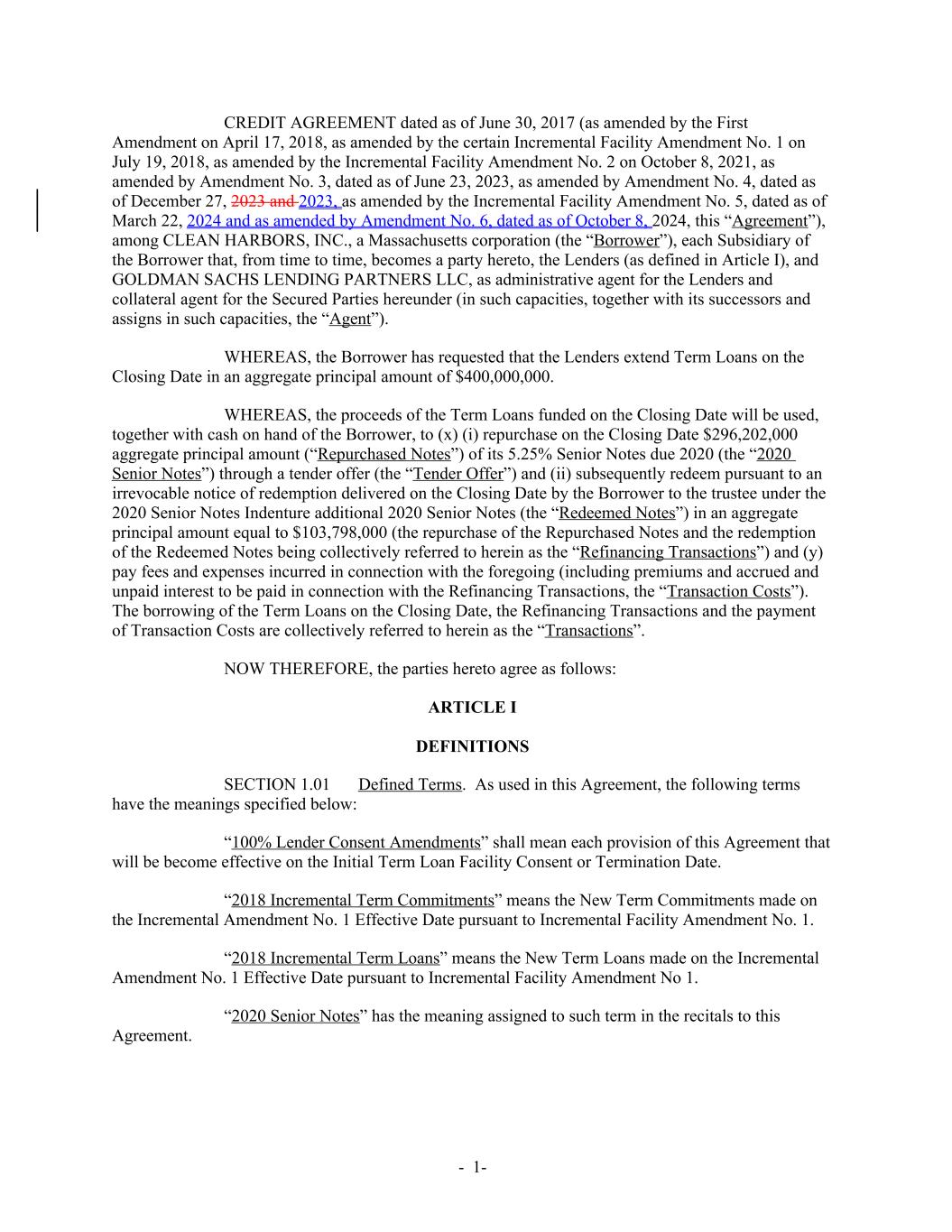 CREDIT AGREEMENT dated as of June 30, 2017 (as amended by the First Amendment on April 17, 2018, as amended by the certain Incremental Facility Amendment No. 1 on July 19, 2018, as amended by the Incremental Facility Amendment No. 2 on October 8, 2021, as amended by Amendment No. 3, dated as of June 23, 2023, as amended by Amendment No. 4, dated as of December 27, 2023 and 2023, as amended by the Incremental Facility Amendment No. 5, dated as of March 22, 2024 and as amended by Amendment No. 6, dated as of October 8, 2024, this “Agreement”), among CLEAN HARBORS, INC., a Massachusetts corporation (the “Borrower”), each Subsidiary of the Borrower that, from time to time, becomes a party hereto, the Lenders (as defined in Article I), and GOLDMAN SACHS LENDING PARTNERS LLC, as administrative agent for the Lenders and collateral agent for the Secured Parties hereunder (in such capacities, together with its successors and assigns in such capacities, the “Agent”). WHEREAS, the Borrower has requested that the Lenders extend Term Loans on the Closing Date in an aggregate principal amount of $400,000,000. WHEREAS, the proceeds of the Term Loans funded on the Closing Date will be used, together with cash on hand of the Borrower, to (x) (i) repurchase on the Closing Date $296,202,000 aggregate principal amount (“Repurchased Notes”) of its 5.25% Senior Notes due 2020 (the “2020 Senior Notes”) through a tender offer (the “Tender Offer”) and (ii) subsequently redeem pursuant to an irrevocable notice of redemption delivered on the Closing Date by the Borrower to the trustee under the 2020 Senior Notes Indenture additional 2020 Senior Notes (the “Redeemed Notes”) in an aggregate principal amount equal to $103,798,000 (the repurchase of the Repurchased Notes and the redemption of the Redeemed Notes being collectively referred to herein as the “Refinancing Transactions”) and (y) pay fees and expenses incurred in connection with the foregoing (including premiums and accrued and unpaid interest to be paid in connection with the Refinancing Transactions, the “Transaction Costs”). The borrowing of the Term Loans on the Closing Date, the Refinancing Transactions and the payment of Transaction Costs are collectively referred to herein as the “Transactions”. NOW THEREFORE, the parties hereto agree as follows: ARTICLE I DEFINITIONS Defined Terms. As used in this Agreement, the following termsSECTION 1.01 have the meanings specified below: “100% Lender Consent Amendments” shall mean each provision of this Agreement that will be become effective on the Initial Term Loan Facility Consent or Termination Date. “2018 Incremental Term Commitments” means the New Term Commitments made on the Incremental Amendment No. 1 Effective Date pursuant to Incremental Facility Amendment No. 1. “2018 Incremental Term Loans” means the New Term Loans made on the Incremental Amendment No. 1 Effective Date pursuant to Incremental Facility Amendment No 1. “2020 Senior Notes” has the meaning assigned to such term in the recitals to this Agreement. - 1-
