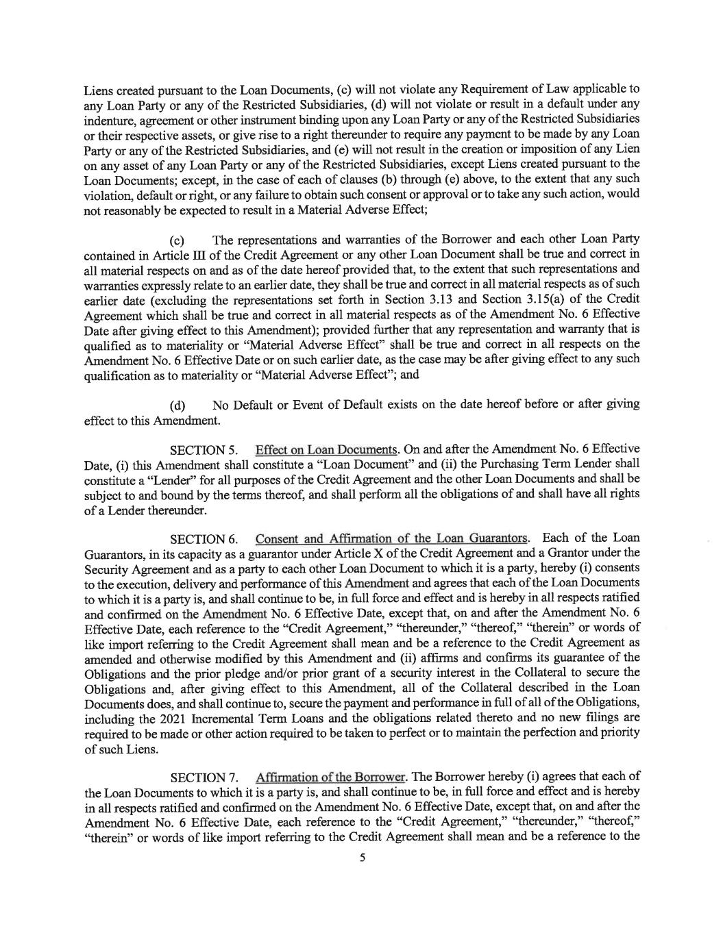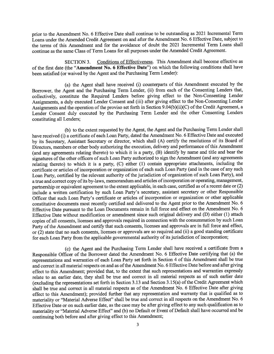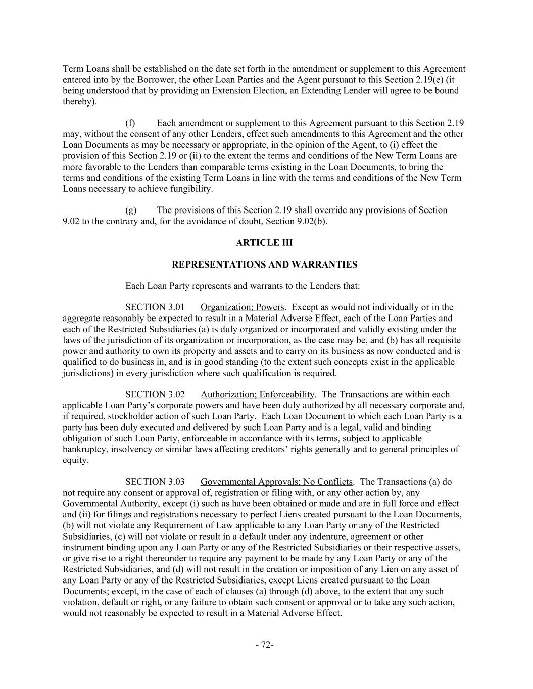 Term Loans shall be established on the date set forth in the amendment or supplement to this Agreement entered into by the Borrower, the other Loan Parties and the Agent pursuant to this Section 2.19(e) (it being understood that by providing an Extension Election, an Extending Lender will agree to be bound thereby). Each amendment or supplement to this Agreement pursuant to this Section 2.19(f) may, without the consent of any other Lenders, effect such amendments to this Agreement and the other Loan Documents as may be necessary or appropriate, in the opinion of the Agent, to (i) effect the provision of this Section 2.19 or (ii) to the extent the terms and conditions of the New Term Loans are more favorable to the Lenders than comparable terms existing in the Loan Documents, to bring the terms and conditions of the existing Term Loans in line with the terms and conditions of the New Term Loans necessary to achieve fungibility. The provisions of this Section 2.19 shall override any provisions of Section(g) 9.02 to the contrary and, for the avoidance of doubt, Section 9.02(b). ARTICLE III REPRESENTATIONS AND WARRANTIES Each Loan Party represents and warrants to the Lenders that: Organization; Powers. Except as would not individually or in theSECTION 3.01 aggregate reasonably be expected to result in a Material Adverse Effect, each of the Loan Parties and each of the Restricted Subsidiaries (a) is duly organized or incorporated and validly existing under the laws of the jurisdiction of its organization or incorporation, as the case may be, and (b) has all requisite power and authority to own its property and assets and to carry on its business as now conducted and is qualified to do business in, and is in good standing (to the extent such concepts exist in the applicable jurisdictions) in every jurisdiction where such qualification is required. Authorization; Enforceability. The Transactions are within eachSECTION 3.02 applicable Loan Party’s corporate powers and have been duly authorized by all necessary corporate and, if required, stockholder action of such Loan Party. Each Loan Document to which each Loan Party is a party has been duly executed and delivered by such Loan Party and is a legal, valid and binding obligation of such Loan Party, enforceable in accordance with its terms, subject to applicable bankruptcy, insolvency or similar laws affecting creditors’ rights generally and to general principles of equity. Governmental Approvals; No Conflicts. The Transactions (a) doSECTION 3.03 not require any consent or approval of, registration or filing with, or any other action by, any Governmental Authority, except (i) such as have been obtained or made and are in full force and effect and (ii) for filings and registrations necessary to perfect Liens created pursuant to the Loan Documents, (b) will not violate any Requirement of Law applicable to any Loan Party or any of the Restricted Subsidiaries, (c) will not violate or result in a default under any indenture, agreement or other instrument binding upon any Loan Party or any of the Restricted Subsidiaries or their respective assets, or give rise to a right thereunder to require any payment to be made by any Loan Party or any of the Restricted Subsidiaries, and (d) will not result in the creation or imposition of any Lien on any asset of any Loan Party or any of the Restricted Subsidiaries, except Liens created pursuant to the Loan Documents; except, in the case of each of clauses (a) through (d) above, to the extent that any such violation, default or right, or any failure to obtain such consent or approval or to take any such action, would not reasonably be expected to result in a Material Adverse Effect. - 72-