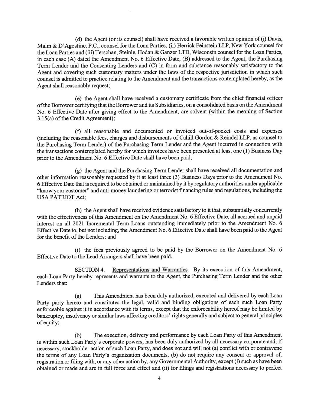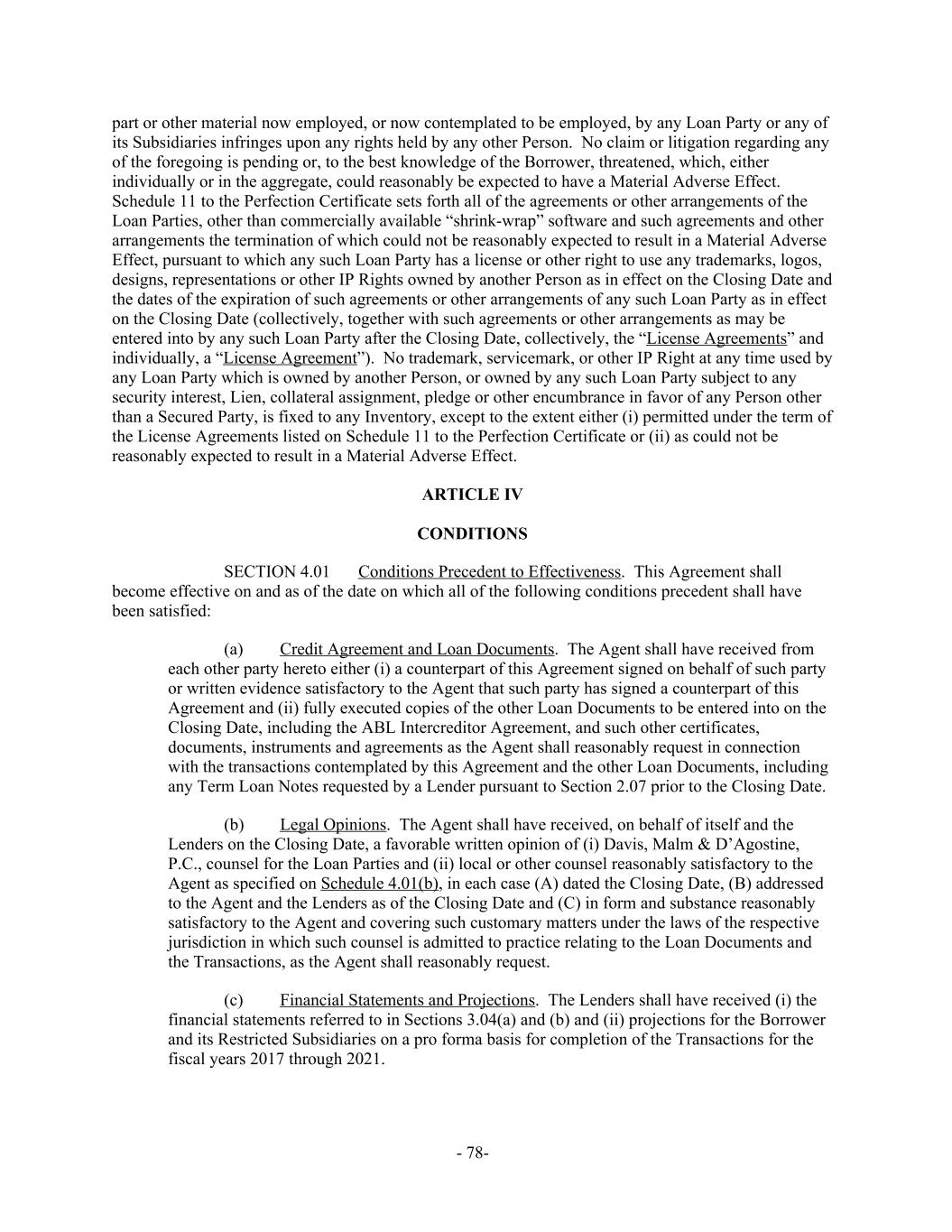 part or other material now employed, or now contemplated to be employed, by any Loan Party or any of its Subsidiaries infringes upon any rights held by any other Person. No claim or litigation regarding any of the foregoing is pending or, to the best knowledge of the Borrower, threatened, which, either individually or in the aggregate, could reasonably be expected to have a Material Adverse Effect. Schedule 11 to the Perfection Certificate sets forth all of the agreements or other arrangements of the Loan Parties, other than commercially available “shrink-wrap” software and such agreements and other arrangements the termination of which could not be reasonably expected to result in a Material Adverse Effect, pursuant to which any such Loan Party has a license or other right to use any trademarks, logos, designs, representations or other IP Rights owned by another Person as in effect on the Closing Date and the dates of the expiration of such agreements or other arrangements of any such Loan Party as in effect on the Closing Date (collectively, together with such agreements or other arrangements as may be entered into by any such Loan Party after the Closing Date, collectively, the “License Agreements” and individually, a “License Agreement”). No trademark, servicemark, or other IP Right at any time used by any Loan Party which is owned by another Person, or owned by any such Loan Party subject to any security interest, Lien, collateral assignment, pledge or other encumbrance in favor of any Person other than a Secured Party, is fixed to any Inventory, except to the extent either (i) permitted under the term of the License Agreements listed on Schedule 11 to the Perfection Certificate or (ii) as could not be reasonably expected to result in a Material Adverse Effect. ARTICLE IV CONDITIONS Conditions Precedent to Effectiveness. This Agreement shallSECTION 4.01 become effective on and as of the date on which all of the following conditions precedent shall have been satisfied: (a) Credit Agreement and Loan Documents. The Agent shall have received from each other party hereto either (i) a counterpart of this Agreement signed on behalf of such party or written evidence satisfactory to the Agent that such party has signed a counterpart of this Agreement and (ii) fully executed copies of the other Loan Documents to be entered into on the Closing Date, including the ABL Intercreditor Agreement, and such other certificates, documents, instruments and agreements as the Agent shall reasonably request in connection with the transactions contemplated by this Agreement and the other Loan Documents, including any Term Loan Notes requested by a Lender pursuant to Section 2.07 prior to the Closing Date. (b) Legal Opinions. The Agent shall have received, on behalf of itself and the Lenders on the Closing Date, a favorable written opinion of (i) Davis, Malm & D’Agostine, P.C., counsel for the Loan Parties and (ii) local or other counsel reasonably satisfactory to the Agent as specified on Schedule 4.01(b), in each case (A) dated the Closing Date, (B) addressed to the Agent and the Lenders as of the Closing Date and (C) in form and substance reasonably satisfactory to the Agent and covering such customary matters under the laws of the respective jurisdiction in which such counsel is admitted to practice relating to the Loan Documents and the Transactions, as the Agent shall reasonably request. (c) Financial Statements and Projections. The Lenders shall have received (i) the financial statements referred to in Sections 3.04(a) and (b) and (ii) projections for the Borrower and its Restricted Subsidiaries on a pro forma basis for completion of the Transactions for the fiscal years 2017 through 2021. - 78-