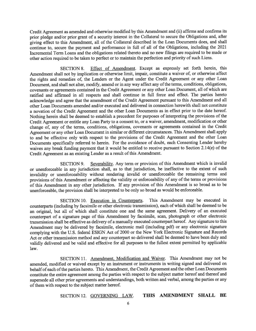 have been relied upon by the other parties hereto and shall survive the execution and delivery of the Loan Documents and the making of any Term Loans, regardless of any investigation made by any such other party or on its behalf and notwithstanding that the Agent or any Lender may have had notice or knowledge of any Default or incorrect representation or warranty at the time any credit is extended hereunder, and shall continue in full force and effect as long as the principal of or any accrued interest on any Term Loan or any fee or any other amount payable under this Agreement is outstanding and unpaid and so long as the Term Commitments have not expired or terminated. The provisions of Sections 2.14, 2.15 and 9.03 and Article VIII shall survive and remain in full force and effect regardless of the consummation of the transactions contemplated hereby, the Discharge of Obligations or the termination of this Agreement or any provision hereof. Counterparts; Integration; Effectiveness; Electronic Execution.SECTION 9.06 This Agreement may be executed in counterparts (and by different parties(a) hereto on different counterparts), each of which shall constitute an original, but all of which when taken together shall constitute a single contract. This Agreement, the other Loan Documents and the Agency Fee Letter, dated as of June 30, 2017, by and among the Borrower and the Agent, and any separate letter agreements with respect to fees payable to the Agent constitute the entire contract among the parties relating to the subject matter hereof and supersede any and all previous agreements and understandings, oral or written, relating to the subject matter hereof. Except as provided in Article IV, this Agreement shall become effective when it shall have been executed by the Agent and when the Agent shall have received counterparts hereof which, when taken together, bear the signatures of each of the other parties hereto, and thereafter shall be binding upon and inure to the benefit of the parties hereto and their respective successors and assigns. Delivery of an executed counterpart of a signature page of this Agreement by facsimile shall be effective as delivery of a manually executed counterpart of this Agreement. Delivery of an executed counterpart of a signature page of this Agreement by(b) telecopy, emailed pdf. or any other electronic means that reproduces an image of the actual executed signature page shall be effective as delivery of a manually executed counterpart of this Agreement. The words “execution,” “signed,” “signature,” “delivery,” and words of like import in or relating to any document to be signed in connection with this Agreement and the transactions contemplated hereby shall be deemed to include Electronic Signatures, deliveries or the keeping of records in electronic form, each of which shall be of the same legal effect, validity or enforceability as a manually executed signature, physical delivery thereof or the use of a paper-based recordkeeping system, as the case may be, to the extent and as provided for in any applicable law, including the Federal Electronic Signatures in Global and National Commerce Act, the New York State Electronic Signatures and Records Act, or any other similar state laws based on the Uniform Electronic Transactions Act; provided that nothing herein shall require the Agent to accept electronic signatures in any form or format without its prior written consent. Severability. To the extent permitted by law, any provision of anySECTION 9.07 Loan Document held to be invalid, illegal or unenforceable in any jurisdiction shall, as to such jurisdiction, be ineffective to the extent of such invalidity, illegality or unenforceability without affecting the validity, legality and enforceability of the remaining provisions thereof; and the invalidity of a particular provision in a particular jurisdiction shall not invalidate such provision in any other jurisdiction. Right of Setoff. If an Event of Default shall have occurred and beSECTION 9.08 continuing, each Lender and each of its Affiliates is hereby authorized at any time and from time to time, to the fullest extent permitted by law, to set off and apply any and all deposits (general or special, -125-