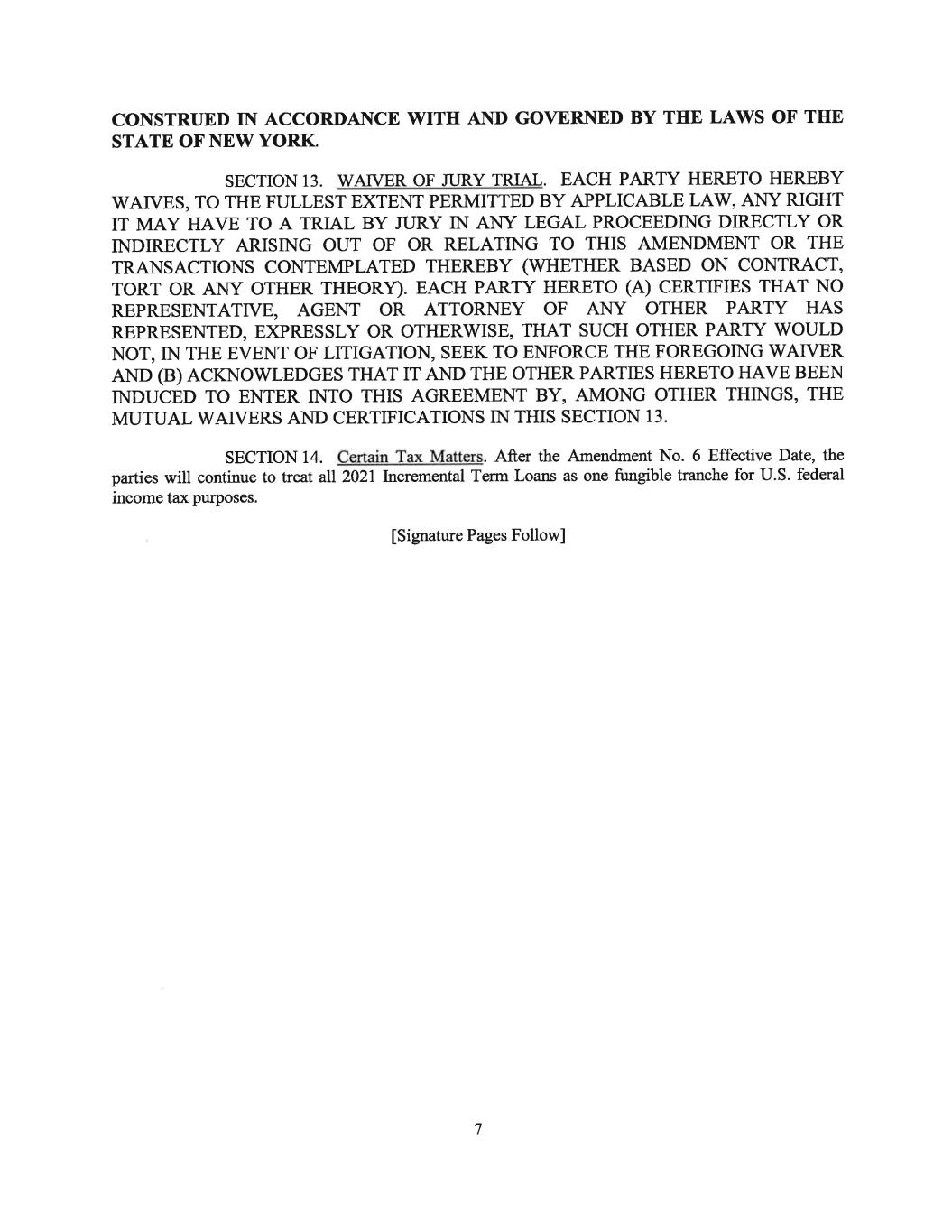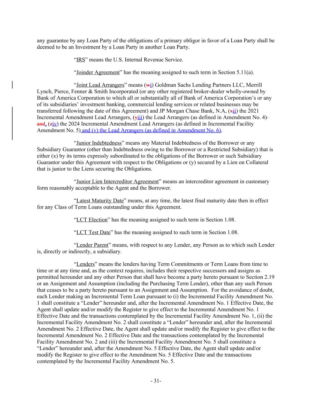 any guarantee by any Loan Party of the obligations of a primary obligor in favor of a Loan Party shall be deemed to be an Investment by a Loan Party in another Loan Party. “IRS” means the U.S. Internal Revenue Service. “Joinder Agreement” has the meaning assigned to such term in Section 5.11(a). “Joint Lead Arrangers” means (wi) Goldman Sachs Lending Partners LLC, Merrill Lynch, Pierce, Fenner & Smith Incorporated (or any other registered broker-dealer wholly-owned by Bank of America Corporation to which all or substantially all of Bank of America Corporation’s or any of its subsidiaries’ investment banking, commercial lending services or related businesses may be transferred following the date of this Agreement) and JP Morgan Chase Bank, N.A, (xii) the 2021 Incremental Amendment Lead Arrangers, (yiii) the Lead Arrangers (as defined in Amendment No. 4) and, (ziv) the 2024 Incremental Amendment Lead Arrangers (as defined in Incremental Facility Amendment No. 5) and (v) the Lead Arrangers (as defined in Amendment No. 6). “Junior Indebtedness” means any Material Indebtedness of the Borrower or any Subsidiary Guarantor (other than Indebtedness owing to the Borrower or a Restricted Subsidiary) that is either (x) by its terms expressly subordinated to the obligations of the Borrower or such Subsidiary Guarantor under this Agreement with respect to the Obligations or (y) secured by a Lien on Collateral that is junior to the Liens securing the Obligations. “Junior Lien Intercreditor Agreement” means an intercreditor agreement in customary form reasonably acceptable to the Agent and the Borrower. “Latest Maturity Date” means, at any time, the latest final maturity date then in effect for any Class of Term Loans outstanding under this Agreement. “LCT Election” has the meaning assigned to such term in Section 1.08. “LCT Test Date” has the meaning assigned to such term in Section 1.08. “Lender Parent” means, with respect to any Lender, any Person as to which such Lender is, directly or indirectly, a subsidiary. “Lenders” means the lenders having Term Commitments or Term Loans from time to time or at any time and, as the context requires, includes their respective successors and assigns as permitted hereunder and any other Person that shall have become a party hereto pursuant to Section 2.19 or an Assignment and Assumption (including the Purchasing Term Lender), other than any such Person that ceases to be a party hereto pursuant to an Assignment and Assumption. For the avoidance of doubt, each Lender making an Incremental Term Loan pursuant to (i) the Incremental Facility Amendment No. 1 shall constitute a “Lender” hereunder and, after the Incremental Amendment No. 1 Effective Date, the Agent shall update and/or modify the Register to give effect to the Incremental Amendment No. 1 Effective Date and the transactions contemplated by the Incremental Facility Amendment No. 1, (ii) the Incremental Facility Amendment No. 2 shall constitute a “Lender” hereunder and, after the Incremental Amendment No. 2 Effective Date, the Agent shall update and/or modify the Register to give effect to the Incremental Amendment No. 2 Effective Date and the transactions contemplated by the Incremental Facility Amendment No. 2 and (iii) the Incremental Facility Amendment No. 5 shall constitute a “Lender” hereunder and, after the Amendment No. 5 Effective Date, the Agent shall update and/or modify the Register to give effect to the Amendment No. 5 Effective Date and the transactions contemplated by the Incremental Facility Amendment No. 5. - 31-