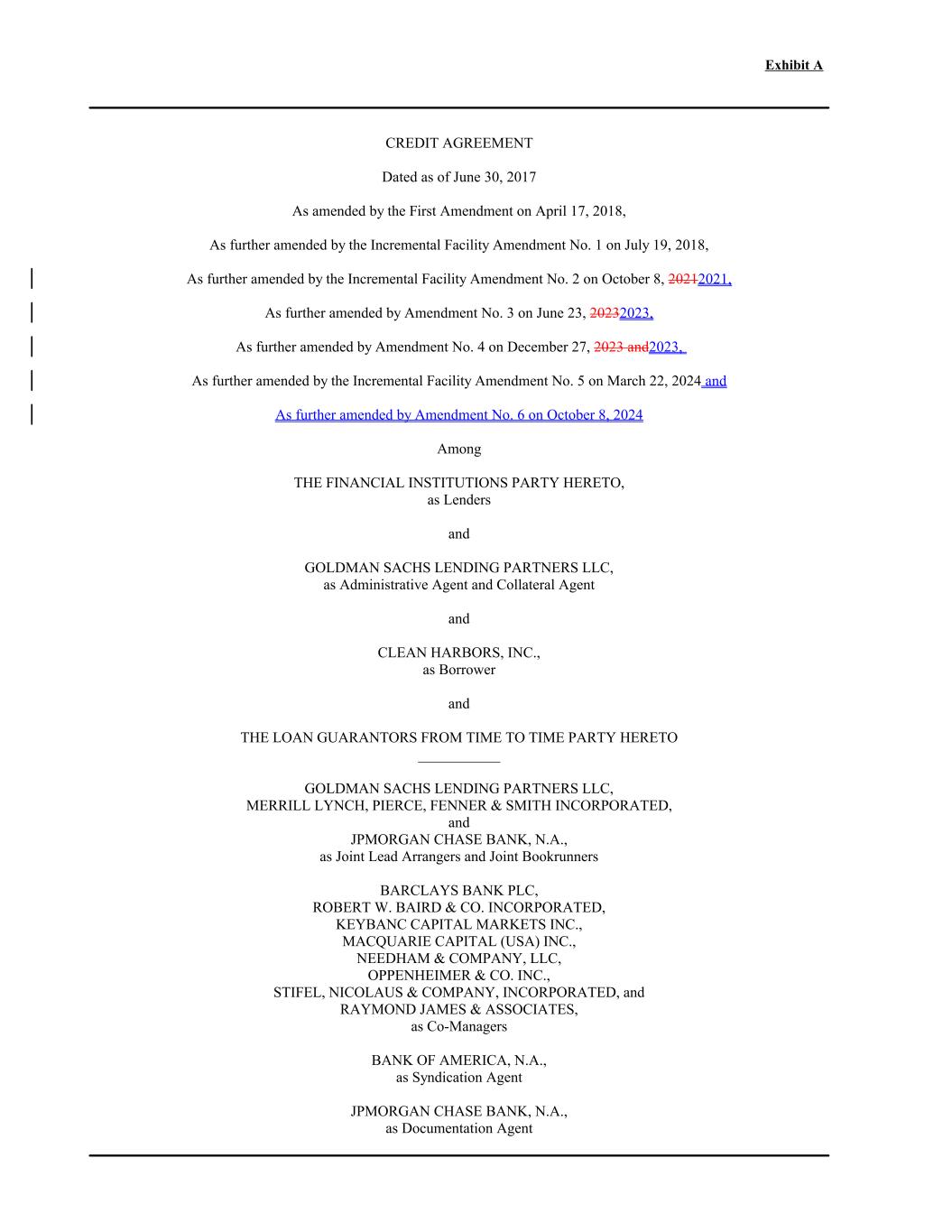 Exhibit A CREDIT AGREEMENT Dated as of June 30, 2017 As amended by the First Amendment on April 17, 2018, As further amended by the Incremental Facility Amendment No. 1 on July 19, 2018, As further amended by the Incremental Facility Amendment No. 2 on October 8, 20212021, As further amended by Amendment No. 3 on June 23, 20232023, As further amended by Amendment No. 4 on December 27, 2023 and2023, As further amended by the Incremental Facility Amendment No. 5 on March 22, 2024 and As further amended by Amendment No. 6 on October 8, 2024 Among THE FINANCIAL INSTITUTIONS PARTY HERETO, as Lenders and GOLDMAN SACHS LENDING PARTNERS LLC, as Administrative Agent and Collateral Agent and CLEAN HARBORS, INC., as Borrower and THE LOAN GUARANTORS FROM TIME TO TIME PARTY HERETO ___________ GOLDMAN SACHS LENDING PARTNERS LLC, MERRILL LYNCH, PIERCE, FENNER & SMITH INCORPORATED, and JPMORGAN CHASE BANK, N.A., as Joint Lead Arrangers and Joint Bookrunners BARCLAYS BANK PLC, ROBERT W. BAIRD & CO. INCORPORATED, KEYBANC CAPITAL MARKETS INC., MACQUARIE CAPITAL (USA) INC., NEEDHAM & COMPANY, LLC, OPPENHEIMER & CO. INC., STIFEL, NICOLAUS & COMPANY, INCORPORATED, and RAYMOND JAMES & ASSOCIATES, as Co-Managers BANK OF AMERICA, N.A., as Syndication Agent JPMORGAN CHASE BANK, N.A., as Documentation Agent