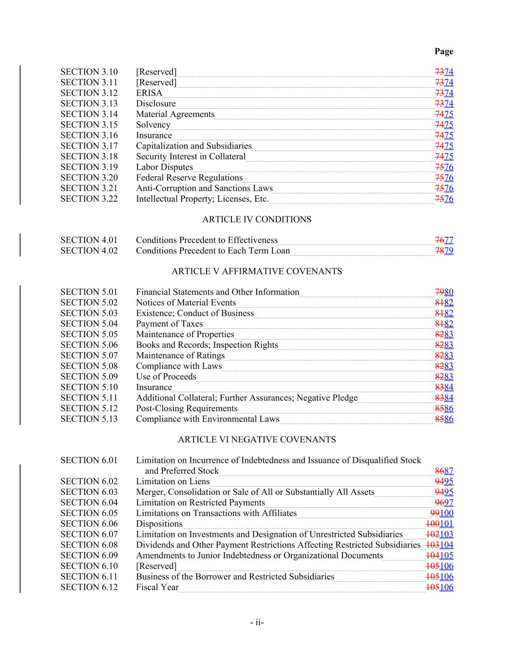 Page SECTION 3.10 [Reserved] 7374 SECTION 3.11 [Reserved] 7374 SECTION 3.12 ERISA 7374 SECTION 3.13 Disclosure 7374 SECTION 3.14 Material Agreements 7475 SECTION 3.15 Solvency 7475 SECTION 3.16 Insurance 7475 SECTION 3.17 Capitalization and Subsidiaries 7475 SECTION 3.18 Security Interest in Collateral 7475 SECTION 3.19 Labor Disputes 7576 SECTION 3.20 Federal Reserve Regulations 7576 SECTION 3.21 Anti-Corruption and Sanctions Laws 7576 SECTION 3.22 Intellectual Property; Licenses, Etc. 7576 ARTICLE IV CONDITIONS SECTION 4.01 Conditions Precedent to Effectiveness 7677 SECTION 4.02 Conditions Precedent to Each Term Loan 7879 ARTICLE V AFFIRMATIVE COVENANTS SECTION 5.01 Financial Statements and Other Information 7980 SECTION 5.02 Notices of Material Events 8182 SECTION 5.03 Existence; Conduct of Business 8182 SECTION 5.04 Payment of Taxes 8182 SECTION 5.05 Maintenance of Properties 8283 SECTION 5.06 Books and Records; Inspection Rights 8283 SECTION 5.07 Maintenance of Ratings 8283 SECTION 5.08 Compliance with Laws 8283 SECTION 5.09 Use of Proceeds 8283 SECTION 5.10 Insurance 8384 SECTION 5.11 Additional Collateral; Further Assurances; Negative Pledge 8384 SECTION 5.12 Post-Closing Requirements 8586 SECTION 5.13 Compliance with Environmental Laws 8586 ARTICLE VI NEGATIVE COVENANTS SECTION 6.01 Limitation on Incurrence of Indebtedness and Issuance of Disqualified Stock and Preferred Stock 8687 SECTION 6.02 Limitation on Liens 9495 SECTION 6.03 Merger, Consolidation or Sale of All or Substantially All Assets 9495 SECTION 6.04 Limitation on Restricted Payments 9697 SECTION 6.05 Limitations on Transactions with Affiliates 99100 SECTION 6.06 Dispositions 100101 SECTION 6.07 Limitation on Investments and Designation of Unrestricted Subsidiaries 102103 SECTION 6.08 Dividends and Other Payment Restrictions Affecting Restricted Subsidiaries 103104 SECTION 6.09 Amendments to Junior Indebtedness or Organizational Documents 104105 SECTION 6.10 [Reserved] 105106 SECTION 6.11 Business of the Borrower and Restricted Subsidiaries 105106 SECTION 6.12 Fiscal Year 105106 - ii-