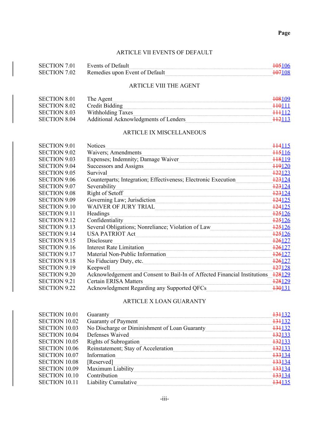Page ARTICLE VII EVENTS OF DEFAULT SECTION 7.01 Events of Default 105106 SECTION 7.02 Remedies upon Event of Default 107108 ARTICLE VIII THE AGENT SECTION 8.01 The Agent 108109 SECTION 8.02 Credit Bidding 110111 SECTION 8.03 Withholding Taxes 111112 SECTION 8.04 Additional Acknowledgments of Lenders 112113 ARTICLE IX MISCELLANEOUS SECTION 9.01 Notices 114115 SECTION 9.02 Waivers; Amendments 115116 SECTION 9.03 Expenses; Indemnity; Damage Waiver 118119 SECTION 9.04 Successors and Assigns 119120 SECTION 9.05 Survival 122123 SECTION 9.06 Counterparts; Integration; Effectiveness; Electronic Execution 123124 SECTION 9.07 Severability 123124 SECTION 9.08 Right of Setoff 123124 SECTION 9.09 Governing Law; Jurisdiction 124125 SECTION 9.10 WAIVER OF JURY TRIAL 124125 SECTION 9.11 Headings 125126 SECTION 9.12 Confidentiality 125126 SECTION 9.13 Several Obligations; Nonreliance; Violation of Law 125126 SECTION 9.14 USA PATRIOT Act 125126 SECTION 9.15 Disclosure 126127 SECTION 9.16 Interest Rate Limitation 126127 SECTION 9.17 Material Non-Public Information 126127 SECTION 9.18 No Fiduciary Duty, etc. 126127 SECTION 9.19 Keepwell 127128 SECTION 9.20 Acknowledgement and Consent to Bail-In of Affected Financial Institutions 128129 SECTION 9.21 Certain ERISA Matters 128129 SECTION 9.22 Acknowledgment Regarding any Supported QFCs 130131 ARTICLE X LOAN GUARANTY SECTION 10.01 Guaranty 131132 SECTION 10.02 Guaranty of Payment 131132 SECTION 10.03 No Discharge or Diminishment of Loan Guaranty 131132 SECTION 10.04 Defenses Waived 132133 SECTION 10.05 Rights of Subrogation 132133 SECTION 10.06 Reinstatement; Stay of Acceleration 132133 SECTION 10.07 Information 133134 SECTION 10.08 [Reserved] 133134 SECTION 10.09 Maximum Liability 133134 SECTION 10.10 Contribution 133134 SECTION 10.11 Liability Cumulative 134135 -iii-