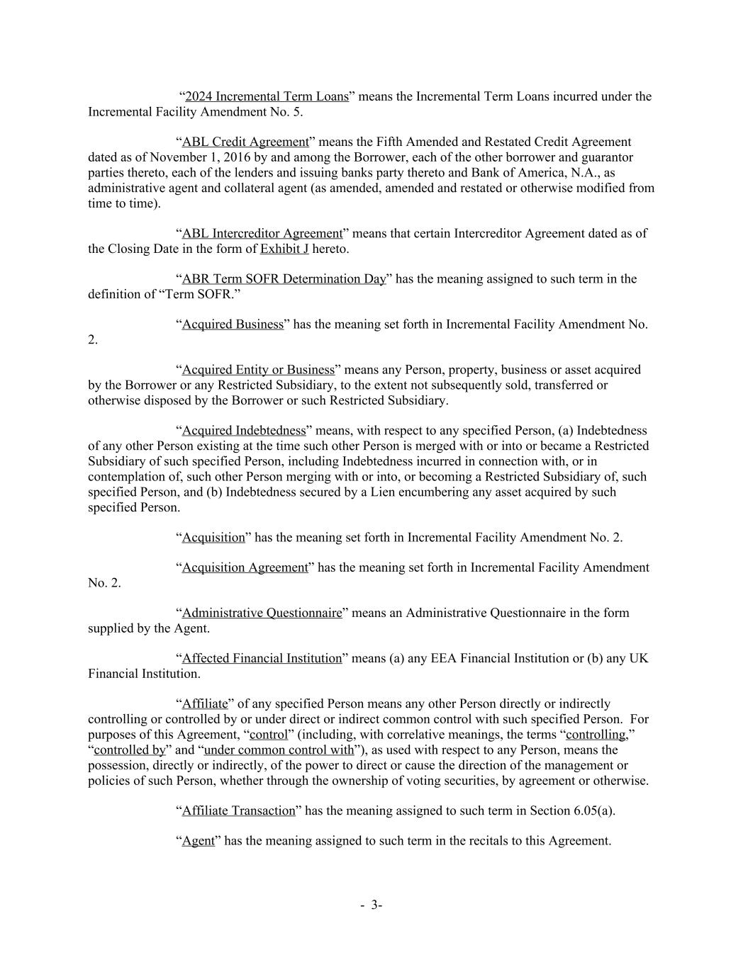 “2024 Incremental Term Loans” means the Incremental Term Loans incurred under the Incremental Facility Amendment No. 5. “ABL Credit Agreement” means the Fifth Amended and Restated Credit Agreement dated as of November 1, 2016 by and among the Borrower, each of the other borrower and guarantor parties thereto, each of the lenders and issuing banks party thereto and Bank of America, N.A., as administrative agent and collateral agent (as amended, amended and restated or otherwise modified from time to time). “ABL Intercreditor Agreement” means that certain Intercreditor Agreement dated as of the Closing Date in the form of Exhibit J hereto. “ABR Term SOFR Determination Day” has the meaning assigned to such term in the definition of “Term SOFR.” “Acquired Business” has the meaning set forth in Incremental Facility Amendment No. 2. “Acquired Entity or Business” means any Person, property, business or asset acquired by the Borrower or any Restricted Subsidiary, to the extent not subsequently sold, transferred or otherwise disposed by the Borrower or such Restricted Subsidiary. “Acquired Indebtedness” means, with respect to any specified Person, (a) Indebtedness of any other Person existing at the time such other Person is merged with or into or became a Restricted Subsidiary of such specified Person, including Indebtedness incurred in connection with, or in contemplation of, such other Person merging with or into, or becoming a Restricted Subsidiary of, such specified Person, and (b) Indebtedness secured by a Lien encumbering any asset acquired by such specified Person. “Acquisition” has the meaning set forth in Incremental Facility Amendment No. 2. “Acquisition Agreement” has the meaning set forth in Incremental Facility Amendment No. 2. “Administrative Questionnaire” means an Administrative Questionnaire in the form supplied by the Agent. “Affected Financial Institution” means (a) any EEA Financial Institution or (b) any UK Financial Institution. “Affiliate” of any specified Person means any other Person directly or indirectly controlling or controlled by or under direct or indirect common control with such specified Person. For purposes of this Agreement, “control” (including, with correlative meanings, the terms “controlling,” “controlled by” and “under common control with”), as used with respect to any Person, means the possession, directly or indirectly, of the power to direct or cause the direction of the management or policies of such Person, whether through the ownership of voting securities, by agreement or otherwise. “Affiliate Transaction” has the meaning assigned to such term in Section 6.05(a). “Agent” has the meaning assigned to such term in the recitals to this Agreement. - 3-