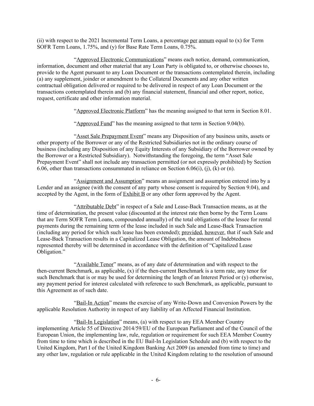 (ii) with respect to the 2021 Incremental Term Loans, a percentage per annum equal to (x) for Term SOFR Term Loans, 1.75%, and (y) for Base Rate Term Loans, 0.75%. “Approved Electronic Communications” means each notice, demand, communication, information, document and other material that any Loan Party is obligated to, or otherwise chooses to, provide to the Agent pursuant to any Loan Document or the transactions contemplated therein, including (a) any supplement, joinder or amendment to the Collateral Documents and any other written contractual obligation delivered or required to be delivered in respect of any Loan Document or the transactions contemplated therein and (b) any financial statement, financial and other report, notice, request, certificate and other information material. “Approved Electronic Platform” has the meaning assigned to that term in Section 8.01. “Approved Fund” has the meaning assigned to that term in Section 9.04(b). “Asset Sale Prepayment Event” means any Disposition of any business units, assets or other property of the Borrower or any of the Restricted Subsidiaries not in the ordinary course of business (including any Disposition of any Equity Interests of any Subsidiary of the Borrower owned by the Borrower or a Restricted Subsidiary). Notwithstanding the foregoing, the term “Asset Sale Prepayment Event” shall not include any transaction permitted (or not expressly prohibited) by Section 6.06, other than transactions consummated in reliance on Section 6.06(i), (j), (k) or (n). “Assignment and Assumption” means an assignment and assumption entered into by a Lender and an assignee (with the consent of any party whose consent is required by Section 9.04), and accepted by the Agent, in the form of Exhibit B or any other form approved by the Agent. “Attributable Debt” in respect of a Sale and Lease-Back Transaction means, as at the time of determination, the present value (discounted at the interest rate then borne by the Term Loans that are Term SOFR Term Loans, compounded annually) of the total obligations of the lessee for rental payments during the remaining term of the lease included in such Sale and Lease-Back Transaction (including any period for which such lease has been extended); provided, however, that if such Sale and Lease-Back Transaction results in a Capitalized Lease Obligation, the amount of Indebtedness represented thereby will be determined in accordance with the definition of “Capitalized Lease Obligation.” “Available Tenor” means, as of any date of determination and with respect to the then-current Benchmark, as applicable, (x) if the then-current Benchmark is a term rate, any tenor for such Benchmark that is or may be used for determining the length of an Interest Period or (y) otherwise, any payment period for interest calculated with reference to such Benchmark, as applicable, pursuant to this Agreement as of such date. “Bail-In Action” means the exercise of any Write-Down and Conversion Powers by the applicable Resolution Authority in respect of any liability of an Affected Financial Institution. “Bail-In Legislation” means, (a) with respect to any EEA Member Country implementing Article 55 of Directive 2014/59/EU of the European Parliament and of the Council of the European Union, the implementing law, rule, regulation or requirement for such EEA Member Country from time to time which is described in the EU Bail-In Legislation Schedule and (b) with respect to the United Kingdom, Part I of the United Kingdom Banking Act 2009 (as amended from time to time) and any other law, regulation or rule applicable in the United Kingdom relating to the resolution of unsound - 6-