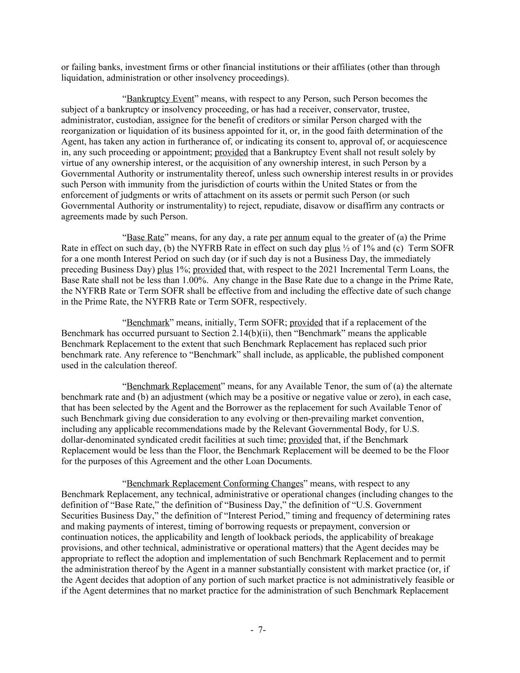 or failing banks, investment firms or other financial institutions or their affiliates (other than through liquidation, administration or other insolvency proceedings). “Bankruptcy Event” means, with respect to any Person, such Person becomes the subject of a bankruptcy or insolvency proceeding, or has had a receiver, conservator, trustee, administrator, custodian, assignee for the benefit of creditors or similar Person charged with the reorganization or liquidation of its business appointed for it, or, in the good faith determination of the Agent, has taken any action in furtherance of, or indicating its consent to, approval of, or acquiescence in, any such proceeding or appointment; provided that a Bankruptcy Event shall not result solely by virtue of any ownership interest, or the acquisition of any ownership interest, in such Person by a Governmental Authority or instrumentality thereof, unless such ownership interest results in or provides such Person with immunity from the jurisdiction of courts within the United States or from the enforcement of judgments or writs of attachment on its assets or permit such Person (or such Governmental Authority or instrumentality) to reject, repudiate, disavow or disaffirm any contracts or agreements made by such Person. “Base Rate” means, for any day, a rate per annum equal to the greater of (a) the Prime Rate in effect on such day, (b) the NYFRB Rate in effect on such day plus ½ of 1% and (c) Term SOFR for a one month Interest Period on such day (or if such day is not a Business Day, the immediately preceding Business Day) plus 1%; provided that, with respect to the 2021 Incremental Term Loans, the Base Rate shall not be less than 1.00%. Any change in the Base Rate due to a change in the Prime Rate, the NYFRB Rate or Term SOFR shall be effective from and including the effective date of such change in the Prime Rate, the NYFRB Rate or Term SOFR, respectively. “Benchmark” means, initially, Term SOFR; provided that if a replacement of the Benchmark has occurred pursuant to Section 2.14(b)(ii), then “Benchmark” means the applicable Benchmark Replacement to the extent that such Benchmark Replacement has replaced such prior benchmark rate. Any reference to “Benchmark” shall include, as applicable, the published component used in the calculation thereof. “Benchmark Replacement” means, for any Available Tenor, the sum of (a) the alternate benchmark rate and (b) an adjustment (which may be a positive or negative value or zero), in each case, that has been selected by the Agent and the Borrower as the replacement for such Available Tenor of such Benchmark giving due consideration to any evolving or then-prevailing market convention, including any applicable recommendations made by the Relevant Governmental Body, for U.S. dollar-denominated syndicated credit facilities at such time; provided that, if the Benchmark Replacement would be less than the Floor, the Benchmark Replacement will be deemed to be the Floor for the purposes of this Agreement and the other Loan Documents. “Benchmark Replacement Conforming Changes” means, with respect to any Benchmark Replacement, any technical, administrative or operational changes (including changes to the definition of “Base Rate,” the definition of “Business Day,” the definition of “U.S. Government Securities Business Day,” the definition of “Interest Period,” timing and frequency of determining rates and making payments of interest, timing of borrowing requests or prepayment, conversion or continuation notices, the applicability and length of lookback periods, the applicability of breakage provisions, and other technical, administrative or operational matters) that the Agent decides may be appropriate to reflect the adoption and implementation of such Benchmark Replacement and to permit the administration thereof by the Agent in a manner substantially consistent with market practice (or, if the Agent decides that adoption of any portion of such market practice is not administratively feasible or if the Agent determines that no market practice for the administration of such Benchmark Replacement - 7-