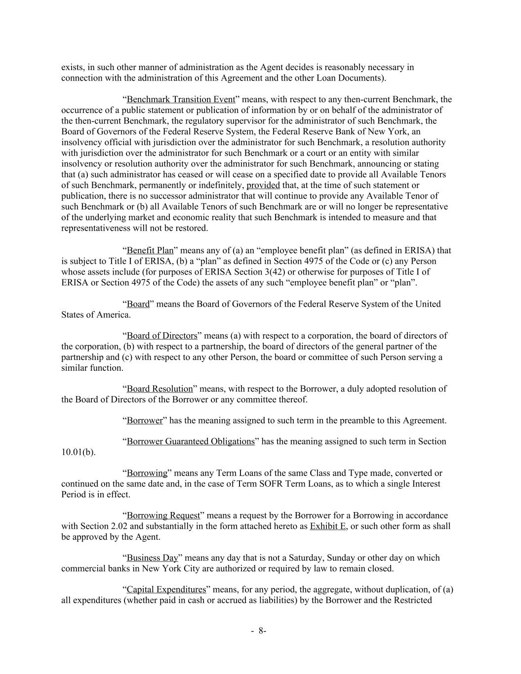 exists, in such other manner of administration as the Agent decides is reasonably necessary in connection with the administration of this Agreement and the other Loan Documents). “Benchmark Transition Event” means, with respect to any then-current Benchmark, the occurrence of a public statement or publication of information by or on behalf of the administrator of the then-current Benchmark, the regulatory supervisor for the administrator of such Benchmark, the Board of Governors of the Federal Reserve System, the Federal Reserve Bank of New York, an insolvency official with jurisdiction over the administrator for such Benchmark, a resolution authority with jurisdiction over the administrator for such Benchmark or a court or an entity with similar insolvency or resolution authority over the administrator for such Benchmark, announcing or stating that (a) such administrator has ceased or will cease on a specified date to provide all Available Tenors of such Benchmark, permanently or indefinitely, provided that, at the time of such statement or publication, there is no successor administrator that will continue to provide any Available Tenor of such Benchmark or (b) all Available Tenors of such Benchmark are or will no longer be representative of the underlying market and economic reality that such Benchmark is intended to measure and that representativeness will not be restored. “Benefit Plan” means any of (a) an “employee benefit plan” (as defined in ERISA) that is subject to Title I of ERISA, (b) a “plan” as defined in Section 4975 of the Code or (c) any Person whose assets include (for purposes of ERISA Section 3(42) or otherwise for purposes of Title I of ERISA or Section 4975 of the Code) the assets of any such “employee benefit plan” or “plan”. “Board” means the Board of Governors of the Federal Reserve System of the United States of America. “Board of Directors” means (a) with respect to a corporation, the board of directors of the corporation, (b) with respect to a partnership, the board of directors of the general partner of the partnership and (c) with respect to any other Person, the board or committee of such Person serving a similar function. “Board Resolution” means, with respect to the Borrower, a duly adopted resolution of the Board of Directors of the Borrower or any committee thereof. “Borrower” has the meaning assigned to such term in the preamble to this Agreement. “Borrower Guaranteed Obligations” has the meaning assigned to such term in Section 10.01(b). “Borrowing” means any Term Loans of the same Class and Type made, converted or continued on the same date and, in the case of Term SOFR Term Loans, as to which a single Interest Period is in effect. “Borrowing Request” means a request by the Borrower for a Borrowing in accordance with Section 2.02 and substantially in the form attached hereto as Exhibit E, or such other form as shall be approved by the Agent. “Business Day” means any day that is not a Saturday, Sunday or other day on which commercial banks in New York City are authorized or required by law to remain closed. “Capital Expenditures” means, for any period, the aggregate, without duplication, of (a) all expenditures (whether paid in cash or accrued as liabilities) by the Borrower and the Restricted - 8-