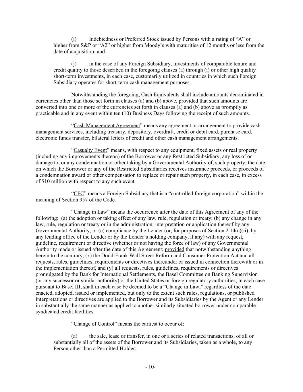 (i) Indebtedness or Preferred Stock issued by Persons with a rating of “A” or higher from S&P or “A2” or higher from Moody’s with maturities of 12 months or less from the date of acquisition; and (j) in the case of any Foreign Subsidiary, investments of comparable tenure and credit quality to those described in the foregoing clauses (a) through (i) or other high quality short-term investments, in each case, customarily utilized in countries in which such Foreign Subsidiary operates for short-term cash management purposes. Notwithstanding the foregoing, Cash Equivalents shall include amounts denominated in currencies other than those set forth in clauses (a) and (b) above, provided that such amounts are converted into one or more of the currencies set forth in clauses (a) and (b) above as promptly as practicable and in any event within ten (10) Business Days following the receipt of such amounts. “Cash Management Agreement” means any agreement or arrangement to provide cash management services, including treasury, depository, overdraft, credit or debit card, purchase card, electronic funds transfer, bilateral letters of credit and other cash management arrangements. “Casualty Event” means, with respect to any equipment, fixed assets or real property (including any improvements thereon) of the Borrower or any Restricted Subsidiary, any loss of or damage to, or any condemnation or other taking by a Governmental Authority of, such property, the date on which the Borrower or any of the Restricted Subsidiaries receives insurance proceeds, or proceeds of a condemnation award or other compensation to replace or repair such property, in each case, in excess of $10 million with respect to any such event. “CFC” means a Foreign Subsidiary that is a “controlled foreign corporation” within the meaning of Section 957 of the Code. “Change in Law” means the occurrence after the date of this Agreement of any of the following: (a) the adoption or taking effect of any law, rule, regulation or treaty; (b) any change in any law, rule, regulation or treaty or in the administration, interpretation or application thereof by any Governmental Authority; or (c) compliance by the Lender (or, for purposes of Section 2.14(c)(ii), by any lending office of the Lender or by the Lender’s holding company, if any) with any request, guideline, requirement or directive (whether or not having the force of law) of any Governmental Authority made or issued after the date of this Agreement; provided that notwithstanding anything herein to the contrary, (x) the Dodd-Frank Wall Street Reform and Consumer Protection Act and all requests, rules, guidelines, requirements or directives thereunder or issued in connection therewith or in the implementation thereof, and (y) all requests, rules, guidelines, requirements or directives promulgated by the Bank for International Settlements, the Basel Committee on Banking Supervision (or any successor or similar authority) or the United States or foreign regulatory authorities, in each case pursuant to Basel III, shall in each case be deemed to be a “Change in Law,” regardless of the date enacted, adopted, issued or implemented, but only to the extent such rules, regulations, or published interpretations or directives are applied to the Borrower and its Subsidiaries by the Agent or any Lender in substantially the same manner as applied to another similarly situated borrower under comparable syndicated credit facilities. “Change of Control” means the earliest to occur of: (a) the sale, lease or transfer, in one or a series of related transactions, of all or substantially all of the assets of the Borrower and its Subsidiaries, taken as a whole, to any Person other than a Permitted Holder; - 10-