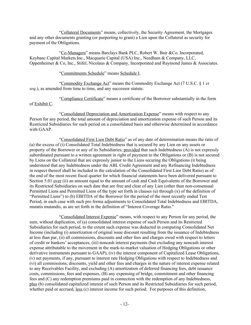 “Collateral Documents” means, collectively, the Security Agreement, the Mortgages and any other documents granting (or purporting to grant) a Lien upon the Collateral as security for payment of the Obligations. “Co-Managers” means Barclays Bank PLC, Robert W. Bair &Co. Incorporated, Keybanc Capital Markets Inc., Macquarie Capital (USA) Inc., Needham & Company, LLC, Oppenheimer & Co, Inc., Stifel, Nicolaus & Company, Incorporated and Raymond James & Associates. “Commitments Schedule” means Schedule I. “Commodity Exchange Act” means the Commodity Exchange Act (7 U.S.C. § 1 et seq.), as amended from time to time, and any successor statute. “Compliance Certificate” means a certificate of the Borrower substantially in the form of Exhibit C. “Consolidated Depreciation and Amortization Expense” means with respect to any Person for any period, the total amount of depreciation and amortization expense of such Person and its Restricted Subsidiaries for such period on a consolidated basis and otherwise determined in accordance with GAAP. “Consolidated First Lien Debt Ratio” as of any date of determination means the ratio of (a) the excess of (i) Consolidated Total Indebtedness that is secured by any Lien on any assets or property of the Borrower or any of its Subsidiaries; provided that such Indebtedness (A) is not expressly subordinated pursuant to a written agreement in right of payment to the Obligations or (B) is not secured by Liens on the Collateral that are expressly junior to the Liens securing the Obligations (it being understood that any Indebtedness under the ABL Credit Agreement and any Refinancing Indebtedness in respect thereof shall be included in the calculation of the Consolidated First Lien Debt Ratio) as of the end of the most recent fiscal quarter for which financial statements have been delivered pursuant to Section 5.01 over (ii) an amount equal to the amount of cash and Cash Equivalents of the Borrower and its Restricted Subsidiaries on such date that are free and clear of any Lien (other than non-consensual Permitted Liens and Permitted Liens of the type set forth in clauses (u) through (x) of the definition of “Permitted Liens”) to (b) EBITDA of the Borrower for the period of the most recently ended Test Period, in each case with such pro forma adjustments to Consolidated Total Indebtedness and EBITDA, mutatis mutandis, as are set forth in the definition of “Interest Coverage Ratio.” “Consolidated Interest Expense” means, with respect to any Person for any period, the sum, without duplication, of (a) consolidated interest expense of such Person and its Restricted Subsidiaries for such period, to the extent such expense was deducted in computing Consolidated Net Income (including (i) amortization of original issue discount resulting from the issuance of Indebtedness at less than par, (ii) all commissions, discounts and other fees and charges owed with respect to letters of credit or bankers’ acceptances, (iii) noncash interest payments (but excluding any noncash interest expense attributable to the movement in the mark-to-market valuation of Hedging Obligations or other derivative instruments pursuant to GAAP), (iv) the interest component of Capitalized Lease Obligations, (v) net payments, if any, pursuant to interest rate Hedging Obligations with respect to Indebtedness and (vi) all commissions, discounts, yield and other fees and charges in the nature of interest expense related to any Receivables Facility, and excluding (A) amortization of deferred financing fees, debt issuance costs, commissions, fees and expenses, (B) any expensing of bridge, commitment and other financing fees and (C) any redemption premiums paid in connection with the redemption of any Indebtedness, plus (b) consolidated capitalized interest of such Person and its Restricted Subsidiaries for such period, whether paid or accrued, less (c) interest income for such period. For purposes of this definition, - 12-