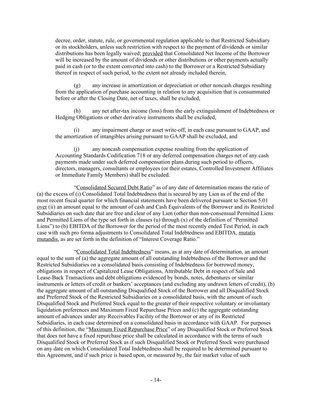 decree, order, statute, rule, or governmental regulation applicable to that Restricted Subsidiary or its stockholders, unless such restriction with respect to the payment of dividends or similar distributions has been legally waived; provided that Consolidated Net Income of the Borrower will be increased by the amount of dividends or other distributions or other payments actually paid in cash (or to the extent converted into cash) to the Borrower or a Restricted Subsidiary thereof in respect of such period, to the extent not already included therein, (g) any increase in amortization or depreciation or other noncash charges resulting from the application of purchase accounting in relation to any acquisition that is consummated before or after the Closing Date, net of taxes, shall be excluded, (h) any net after-tax income (loss) from the early extinguishment of Indebtedness or Hedging Obligations or other derivative instruments shall be excluded, (i) any impairment charge or asset write-off, in each case pursuant to GAAP, and the amortization of intangibles arising pursuant to GAAP shall be excluded, and (j) any noncash compensation expense resulting from the application of Accounting Standards Codification 718 or any deferred compensation charges net of any cash payments made under such deferred compensation plans during such period to officers, directors, managers, consultants or employees (or their estates, Controlled Investment Affiliates or Immediate Family Members) shall be excluded. “Consolidated Secured Debt Ratio” as of any date of determination means the ratio of (a) the excess of (i) Consolidated Total Indebtedness that is secured by any Lien as of the end of the most recent fiscal quarter for which financial statements have been delivered pursuant to Section 5.01 over (ii) an amount equal to the amount of cash and Cash Equivalents of the Borrower and its Restricted Subsidiaries on such date that are free and clear of any Lien (other than non-consensual Permitted Liens and Permitted Liens of the type set forth in clauses (u) through (x) of the definition of “Permitted Liens”) to (b) EBITDA of the Borrower for the period of the most recently ended Test Period, in each case with such pro forma adjustments to Consolidated Total Indebtedness and EBITDA, mutatis mutandis, as are set forth in the definition of “Interest Coverage Ratio.” “Consolidated Total Indebtedness” means, as at any date of determination, an amount equal to the sum of (a) the aggregate amount of all outstanding Indebtedness of the Borrower and the Restricted Subsidiaries on a consolidated basis consisting of Indebtedness for borrowed money, obligations in respect of Capitalized Lease Obligations, Attributable Debt in respect of Sale and Lease-Back Transactions and debt obligations evidenced by bonds, notes, debentures or similar instruments or letters of credit or bankers’ acceptances (and excluding any undrawn letters of credit), (b) the aggregate amount of all outstanding Disqualified Stock of the Borrower and all Disqualified Stock and Preferred Stock of the Restricted Subsidiaries on a consolidated basis, with the amount of such Disqualified Stock and Preferred Stock equal to the greater of their respective voluntary or involuntary liquidation preferences and Maximum Fixed Repurchase Prices and (c) the aggregate outstanding amount of advances under any Receivables Facility of the Borrower or any of its Restricted Subsidiaries, in each case determined on a consolidated basis in accordance with GAAP. For purposes of this definition, the “Maximum Fixed Repurchase Price” of any Disqualified Stock or Preferred Stock that does not have a fixed repurchase price shall be calculated in accordance with the terms of such Disqualified Stock or Preferred Stock as if such Disqualified Stock or Preferred Stock were purchased on any date on which Consolidated Total Indebtedness shall be required to be determined pursuant to this Agreement, and if such price is based upon, or measured by, the fair market value of such - 14-