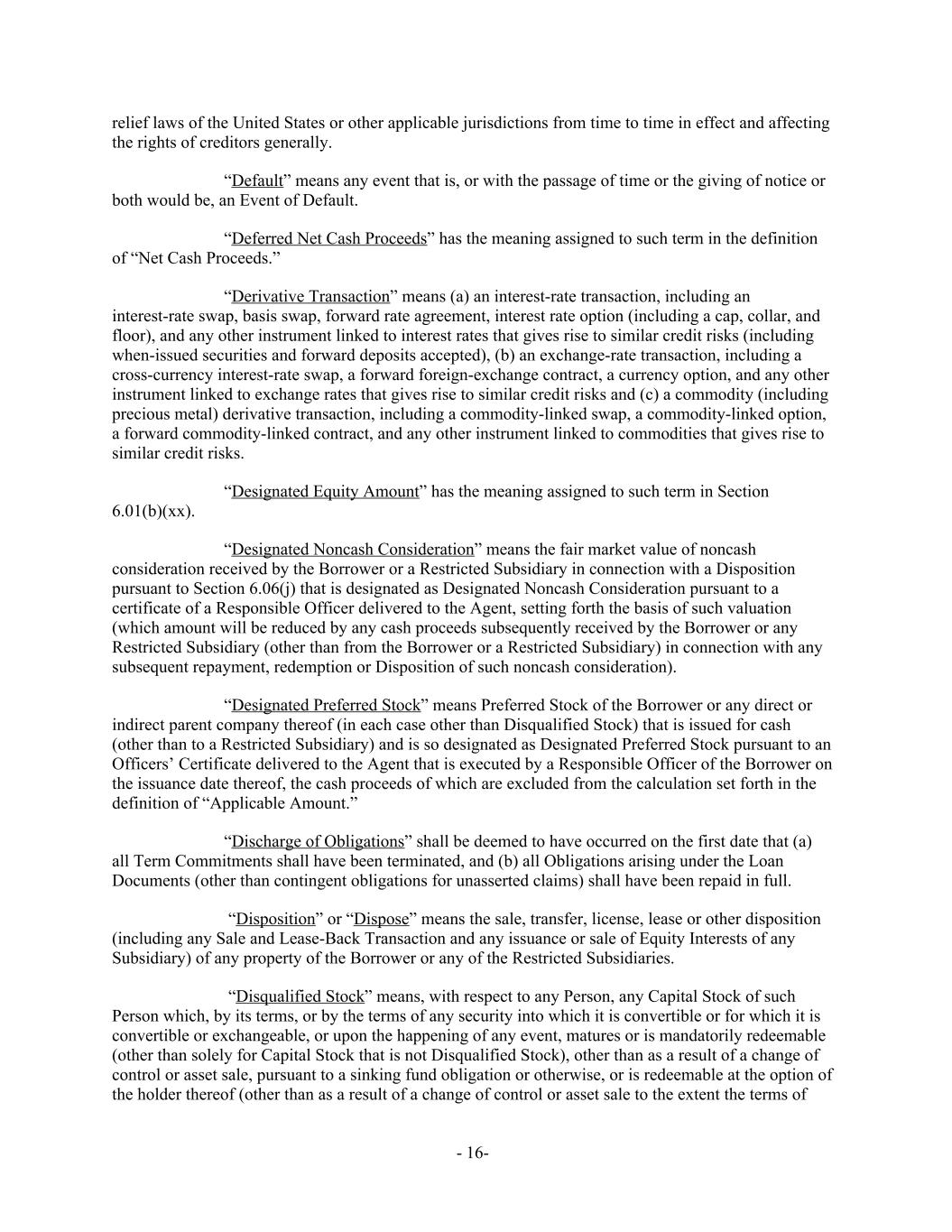 relief laws of the United States or other applicable jurisdictions from time to time in effect and affecting the rights of creditors generally. “Default” means any event that is, or with the passage of time or the giving of notice or both would be, an Event of Default. “Deferred Net Cash Proceeds” has the meaning assigned to such term in the definition of “Net Cash Proceeds.” “Derivative Transaction” means (a) an interest-rate transaction, including an interest-rate swap, basis swap, forward rate agreement, interest rate option (including a cap, collar, and floor), and any other instrument linked to interest rates that gives rise to similar credit risks (including when-issued securities and forward deposits accepted), (b) an exchange-rate transaction, including a cross-currency interest-rate swap, a forward foreign-exchange contract, a currency option, and any other instrument linked to exchange rates that gives rise to similar credit risks and (c) a commodity (including precious metal) derivative transaction, including a commodity-linked swap, a commodity-linked option, a forward commodity-linked contract, and any other instrument linked to commodities that gives rise to similar credit risks. “Designated Equity Amount” has the meaning assigned to such term in Section 6.01(b)(xx). “Designated Noncash Consideration” means the fair market value of noncash consideration received by the Borrower or a Restricted Subsidiary in connection with a Disposition pursuant to Section 6.06(j) that is designated as Designated Noncash Consideration pursuant to a certificate of a Responsible Officer delivered to the Agent, setting forth the basis of such valuation (which amount will be reduced by any cash proceeds subsequently received by the Borrower or any Restricted Subsidiary (other than from the Borrower or a Restricted Subsidiary) in connection with any subsequent repayment, redemption or Disposition of such noncash consideration). “Designated Preferred Stock” means Preferred Stock of the Borrower or any direct or indirect parent company thereof (in each case other than Disqualified Stock) that is issued for cash (other than to a Restricted Subsidiary) and is so designated as Designated Preferred Stock pursuant to an Officers’ Certificate delivered to the Agent that is executed by a Responsible Officer of the Borrower on the issuance date thereof, the cash proceeds of which are excluded from the calculation set forth in the definition of “Applicable Amount.” “Discharge of Obligations” shall be deemed to have occurred on the first date that (a) all Term Commitments shall have been terminated, and (b) all Obligations arising under the Loan Documents (other than contingent obligations for unasserted claims) shall have been repaid in full. “Disposition” or “Dispose” means the sale, transfer, license, lease or other disposition (including any Sale and Lease-Back Transaction and any issuance or sale of Equity Interests of any Subsidiary) of any property of the Borrower or any of the Restricted Subsidiaries. “Disqualified Stock” means, with respect to any Person, any Capital Stock of such Person which, by its terms, or by the terms of any security into which it is convertible or for which it is convertible or exchangeable, or upon the happening of any event, matures or is mandatorily redeemable (other than solely for Capital Stock that is not Disqualified Stock), other than as a result of a change of control or asset sale, pursuant to a sinking fund obligation or otherwise, or is redeemable at the option of the holder thereof (other than as a result of a change of control or asset sale to the extent the terms of - 16-
