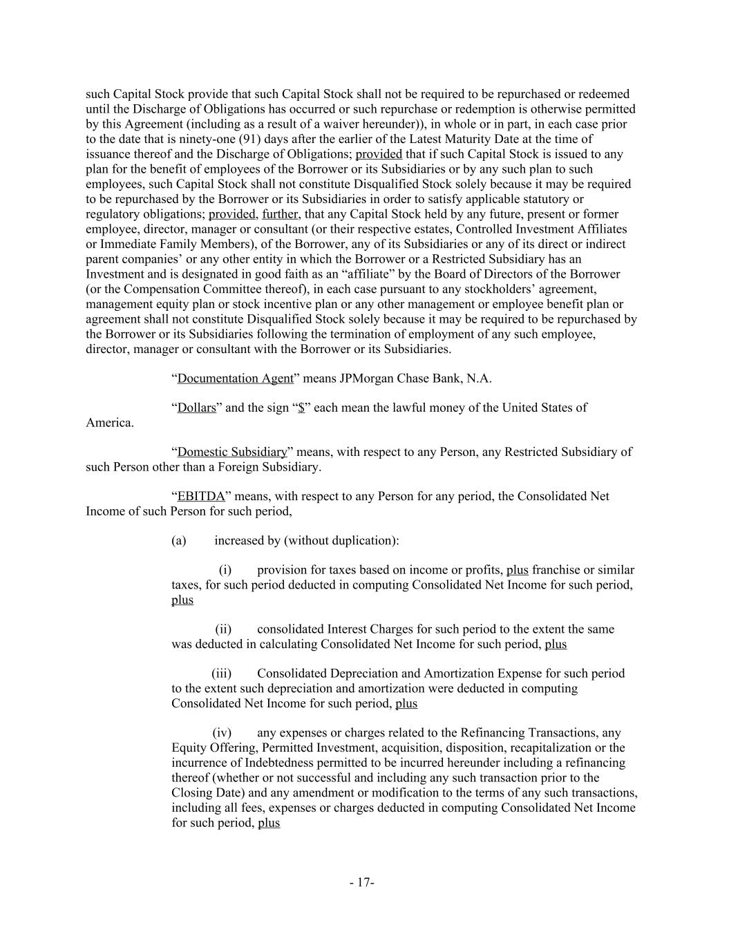 such Capital Stock provide that such Capital Stock shall not be required to be repurchased or redeemed until the Discharge of Obligations has occurred or such repurchase or redemption is otherwise permitted by this Agreement (including as a result of a waiver hereunder)), in whole or in part, in each case prior to the date that is ninety-one (91) days after the earlier of the Latest Maturity Date at the time of issuance thereof and the Discharge of Obligations; provided that if such Capital Stock is issued to any plan for the benefit of employees of the Borrower or its Subsidiaries or by any such plan to such employees, such Capital Stock shall not constitute Disqualified Stock solely because it may be required to be repurchased by the Borrower or its Subsidiaries in order to satisfy applicable statutory or regulatory obligations; provided, further, that any Capital Stock held by any future, present or former employee, director, manager or consultant (or their respective estates, Controlled Investment Affiliates or Immediate Family Members), of the Borrower, any of its Subsidiaries or any of its direct or indirect parent companies’ or any other entity in which the Borrower or a Restricted Subsidiary has an Investment and is designated in good faith as an “affiliate” by the Board of Directors of the Borrower (or the Compensation Committee thereof), in each case pursuant to any stockholders’ agreement, management equity plan or stock incentive plan or any other management or employee benefit plan or agreement shall not constitute Disqualified Stock solely because it may be required to be repurchased by the Borrower or its Subsidiaries following the termination of employment of any such employee, director, manager or consultant with the Borrower or its Subsidiaries. “Documentation Agent” means JPMorgan Chase Bank, N.A. “Dollars” and the sign “$” each mean the lawful money of the United States of America. “Domestic Subsidiary” means, with respect to any Person, any Restricted Subsidiary of such Person other than a Foreign Subsidiary. “EBITDA” means, with respect to any Person for any period, the Consolidated Net Income of such Person for such period, (a) increased by (without duplication): (i) provision for taxes based on income or profits, plus franchise or similar taxes, for such period deducted in computing Consolidated Net Income for such period, plus (ii) consolidated Interest Charges for such period to the extent the same was deducted in calculating Consolidated Net Income for such period, plus (iii) Consolidated Depreciation and Amortization Expense for such period to the extent such depreciation and amortization were deducted in computing Consolidated Net Income for such period, plus (iv) any expenses or charges related to the Refinancing Transactions, any Equity Offering, Permitted Investment, acquisition, disposition, recapitalization or the incurrence of Indebtedness permitted to be incurred hereunder including a refinancing thereof (whether or not successful and including any such transaction prior to the Closing Date) and any amendment or modification to the terms of any such transactions, including all fees, expenses or charges deducted in computing Consolidated Net Income for such period, plus - 17-