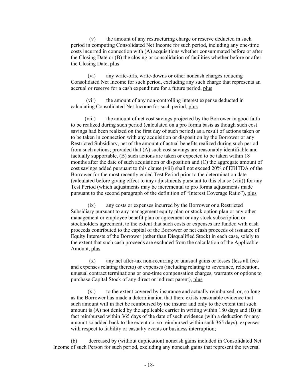 (v) the amount of any restructuring charge or reserve deducted in such period in computing Consolidated Net Income for such period, including any one-time costs incurred in connection with (A) acquisitions whether consummated before or after the Closing Date or (B) the closing or consolidation of facilities whether before or after the Closing Date, plus (vi) any write-offs, write-downs or other noncash charges reducing Consolidated Net Income for such period, excluding any such charge that represents an accrual or reserve for a cash expenditure for a future period, plus (vii) the amount of any non-controlling interest expense deducted in calculating Consolidated Net Income for such period, plus (viii) the amount of net cost savings projected by the Borrower in good faith to be realized during such period (calculated on a pro forma basis as though such cost savings had been realized on the first day of such period) as a result of actions taken or to be taken in connection with any acquisition or disposition by the Borrower or any Restricted Subsidiary, net of the amount of actual benefits realized during such period from such actions; provided that (A) such cost savings are reasonably identifiable and factually supportable, (B) such actions are taken or expected to be taken within 18 months after the date of such acquisition or disposition and (C) the aggregate amount of cost savings added pursuant to this clause (viii) shall not exceed 20% of EBITDA of the Borrower for the most recently ended Test Period prior to the determination date (calculated before giving effect to any adjustments pursuant to this clause (viii)) for any Test Period (which adjustments may be incremental to pro forma adjustments made pursuant to the second paragraph of the definition of “Interest Coverage Ratio”), plus (ix) any costs or expenses incurred by the Borrower or a Restricted Subsidiary pursuant to any management equity plan or stock option plan or any other management or employee benefit plan or agreement or any stock subscription or stockholders agreement, to the extent that such costs or expenses are funded with cash proceeds contributed to the capital of the Borrower or net cash proceeds of issuance of Equity Interests of the Borrower (other than Disqualified Stock) in each case, solely to the extent that such cash proceeds are excluded from the calculation of the Applicable Amount, plus (x) any net after-tax non-recurring or unusual gains or losses (less all fees and expenses relating thereto) or expenses (including relating to severance, relocation, unusual contract terminations or one-time compensation charges, warrants or options to purchase Capital Stock of any direct or indirect parent), plus (xi) to the extent covered by insurance and actually reimbursed, or, so long as the Borrower has made a determination that there exists reasonable evidence that such amount will in fact be reimbursed by the insurer and only to the extent that such amount is (A) not denied by the applicable carrier in writing within 180 days and (B) in fact reimbursed within 365 days of the date of such evidence (with a deduction for any amount so added back to the extent not so reimbursed within such 365 days), expenses with respect to liability or casualty events or business interruption; (b) decreased by (without duplication) noncash gains included in Consolidated Net Income of such Person for such period, excluding any noncash gains that represent the reversal - 18-