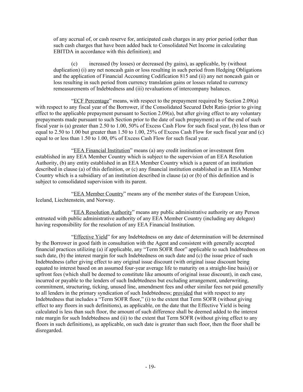 of any accrual of, or cash reserve for, anticipated cash charges in any prior period (other than such cash charges that have been added back to Consolidated Net Income in calculating EBITDA in accordance with this definition); and (c) increased (by losses) or decreased (by gains), as applicable, by (without duplication) (i) any net noncash gain or loss resulting in such period from Hedging Obligations and the application of Financial Accounting Codification 815 and (ii) any net noncash gain or loss resulting in such period from currency translation gains or losses related to currency remeasurements of Indebtedness and (iii) revaluations of intercompany balances. “ECF Percentage” means, with respect to the prepayment required by Section 2.09(a) with respect to any fiscal year of the Borrower, if the Consolidated Secured Debt Ratio (prior to giving effect to the applicable prepayment pursuant to Section 2.09(a), but after giving effect to any voluntary prepayments made pursuant to such Section prior to the date of such prepayment) as of the end of such fiscal year is (a) greater than 2.50 to 1.00, 50% of Excess Cash Flow for such fiscal year, (b) less than or equal to 2.50 to 1.00 but greater than 1.50 to 1.00, 25% of Excess Cash Flow for such fiscal year and (c) equal to or less than 1.50 to 1.00, 0% of Excess Cash Flow for such fiscal year. “EEA Financial Institution” means (a) any credit institution or investment firm established in any EEA Member Country which is subject to the supervision of an EEA Resolution Authority, (b) any entity established in an EEA Member Country which is a parent of an institution described in clause (a) of this definition, or (c) any financial institution established in an EEA Member Country which is a subsidiary of an institution described in clause (a) or (b) of this definition and is subject to consolidated supervision with its parent. “EEA Member Country” means any of the member states of the European Union, Iceland, Liechtenstein, and Norway. “EEA Resolution Authority” means any public administrative authority or any Person entrusted with public administrative authority of any EEA Member Country (including any delegee) having responsibility for the resolution of any EEA Financial Institution. “Effective Yield” for any Indebtedness on any date of determination will be determined by the Borrower in good faith in consultation with the Agent and consistent with generally accepted financial practices utilizing (a) if applicable, any “Term SOFR floor” applicable to such Indebtedness on such date, (b) the interest margin for such Indebtedness on such date and (c) the issue price of such Indebtedness (after giving effect to any original issue discount (with original issue discount being equated to interest based on an assumed four-year average life to maturity on a straight-line basis)) or upfront fees (which shall be deemed to constitute like amounts of original issue discount), in each case, incurred or payable to the lenders of such Indebtedness but excluding arrangement, underwriting, commitment, structuring, ticking, unused line, amendment fees and other similar fees not paid generally to all lenders in the primary syndication of such Indebtedness; provided that with respect to any Indebtedness that includes a “Term SOFR floor,” (i) to the extent that Term SOFR (without giving effect to any floors in such definitions), as applicable, on the date that the Effective Yield is being calculated is less than such floor, the amount of such difference shall be deemed added to the interest rate margin for such Indebtedness and (ii) to the extent that Term SOFR (without giving effect to any floors in such definitions), as applicable, on such date is greater than such floor, then the floor shall be disregarded. - 19-