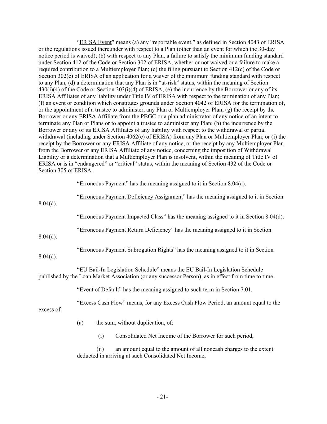 “ERISA Event” means (a) any “reportable event,” as defined in Section 4043 of ERISA or the regulations issued thereunder with respect to a Plan (other than an event for which the 30-day notice period is waived); (b) with respect to any Plan, a failure to satisfy the minimum funding standard under Section 412 of the Code or Section 302 of ERISA, whether or not waived or a failure to make a required contribution to a Multiemployer Plan; (c) the filing pursuant to Section 412(c) of the Code or Section 302(c) of ERISA of an application for a waiver of the minimum funding standard with respect to any Plan; (d) a determination that any Plan is in “at-risk” status, within the meaning of Section 430(i)(4) of the Code or Section 303(i)(4) of ERISA; (e) the incurrence by the Borrower or any of its ERISA Affiliates of any liability under Title IV of ERISA with respect to the termination of any Plan; (f) an event or condition which constitutes grounds under Section 4042 of ERISA for the termination of, or the appointment of a trustee to administer, any Plan or Multiemployer Plan; (g) the receipt by the Borrower or any ERISA Affiliate from the PBGC or a plan administrator of any notice of an intent to terminate any Plan or Plans or to appoint a trustee to administer any Plan; (h) the incurrence by the Borrower or any of its ERISA Affiliates of any liability with respect to the withdrawal or partial withdrawal (including under Section 4062(e) of ERISA) from any Plan or Multiemployer Plan; or (i) the receipt by the Borrower or any ERISA Affiliate of any notice, or the receipt by any Multiemployer Plan from the Borrower or any ERISA Affiliate of any notice, concerning the imposition of Withdrawal Liability or a determination that a Multiemployer Plan is insolvent, within the meaning of Title IV of ERISA or is in “endangered” or “critical” status, within the meaning of Section 432 of the Code or Section 305 of ERISA. “Erroneous Payment” has the meaning assigned to it in Section 8.04(a). “Erroneous Payment Deficiency Assignment” has the meaning assigned to it in Section 8.04(d). “Erroneous Payment Impacted Class” has the meaning assigned to it in Section 8.04(d). “Erroneous Payment Return Deficiency” has the meaning assigned to it in Section 8.04(d). “Erroneous Payment Subrogation Rights” has the meaning assigned to it in Section 8.04(d). “EU Bail-In Legislation Schedule” means the EU Bail-In Legislation Schedule published by the Loan Market Association (or any successor Person), as in effect from time to time. “Event of Default” has the meaning assigned to such term in Section 7.01. “Excess Cash Flow” means, for any Excess Cash Flow Period, an amount equal to the excess of: (a) the sum, without duplication, of: (i) Consolidated Net Income of the Borrower for such period, (ii) an amount equal to the amount of all noncash charges to the extent deducted in arriving at such Consolidated Net Income, - 21-