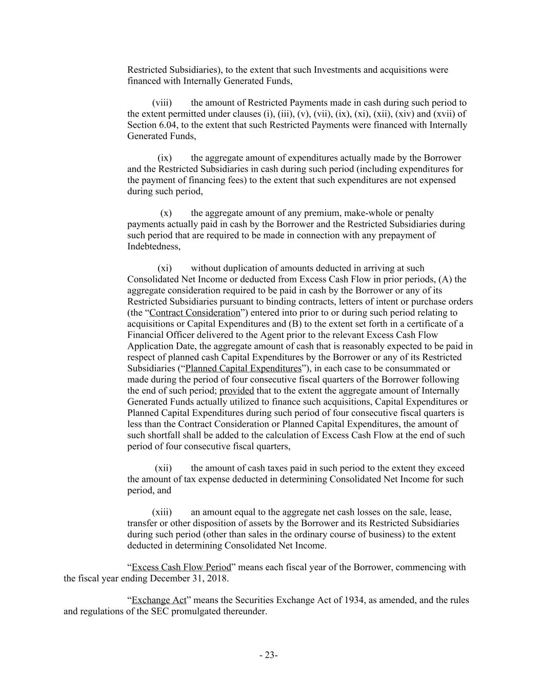 Restricted Subsidiaries), to the extent that such Investments and acquisitions were financed with Internally Generated Funds, (viii) the amount of Restricted Payments made in cash during such period to the extent permitted under clauses (i), (iii), (v), (vii), (ix), (xi), (xii), (xiv) and (xvii) of Section 6.04, to the extent that such Restricted Payments were financed with Internally Generated Funds, (ix) the aggregate amount of expenditures actually made by the Borrower and the Restricted Subsidiaries in cash during such period (including expenditures for the payment of financing fees) to the extent that such expenditures are not expensed during such period, (x) the aggregate amount of any premium, make-whole or penalty payments actually paid in cash by the Borrower and the Restricted Subsidiaries during such period that are required to be made in connection with any prepayment of Indebtedness, (xi) without duplication of amounts deducted in arriving at such Consolidated Net Income or deducted from Excess Cash Flow in prior periods, (A) the aggregate consideration required to be paid in cash by the Borrower or any of its Restricted Subsidiaries pursuant to binding contracts, letters of intent or purchase orders (the “Contract Consideration”) entered into prior to or during such period relating to acquisitions or Capital Expenditures and (B) to the extent set forth in a certificate of a Financial Officer delivered to the Agent prior to the relevant Excess Cash Flow Application Date, the aggregate amount of cash that is reasonably expected to be paid in respect of planned cash Capital Expenditures by the Borrower or any of its Restricted Subsidiaries (“Planned Capital Expenditures”), in each case to be consummated or made during the period of four consecutive fiscal quarters of the Borrower following the end of such period; provided that to the extent the aggregate amount of Internally Generated Funds actually utilized to finance such acquisitions, Capital Expenditures or Planned Capital Expenditures during such period of four consecutive fiscal quarters is less than the Contract Consideration or Planned Capital Expenditures, the amount of such shortfall shall be added to the calculation of Excess Cash Flow at the end of such period of four consecutive fiscal quarters, (xii) the amount of cash taxes paid in such period to the extent they exceed the amount of tax expense deducted in determining Consolidated Net Income for such period, and (xiii) an amount equal to the aggregate net cash losses on the sale, lease, transfer or other disposition of assets by the Borrower and its Restricted Subsidiaries during such period (other than sales in the ordinary course of business) to the extent deducted in determining Consolidated Net Income. “Excess Cash Flow Period” means each fiscal year of the Borrower, commencing with the fiscal year ending December 31, 2018. “Exchange Act” means the Securities Exchange Act of 1934, as amended, and the rules and regulations of the SEC promulgated thereunder. - 23-