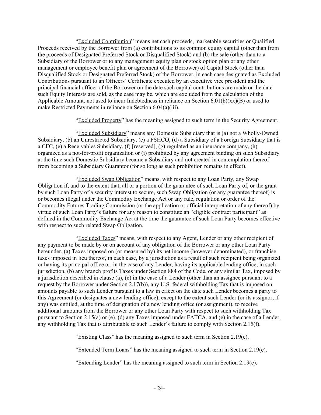 “Excluded Contribution” means net cash proceeds, marketable securities or Qualified Proceeds received by the Borrower from (a) contributions to its common equity capital (other than from the proceeds of Designated Preferred Stock or Disqualified Stock) and (b) the sale (other than to a Subsidiary of the Borrower or to any management equity plan or stock option plan or any other management or employee benefit plan or agreement of the Borrower) of Capital Stock (other than Disqualified Stock or Designated Preferred Stock) of the Borrower, in each case designated as Excluded Contributions pursuant to an Officers’ Certificate executed by an executive vice president and the principal financial officer of the Borrower on the date such capital contributions are made or the date such Equity Interests are sold, as the case may be, which are excluded from the calculation of the Applicable Amount, not used to incur Indebtedness in reliance on Section 6.01(b)(xx)(B) or used to make Restricted Payments in reliance on Section 6.04(a)(iii). “Excluded Property” has the meaning assigned to such term in the Security Agreement. “Excluded Subsidiary” means any Domestic Subsidiary that is (a) not a Wholly-Owned Subsidiary, (b) an Unrestricted Subsidiary, (c) a FSHCO, (d) a Subsidiary of a Foreign Subsidiary that is a CFC, (e) a Receivables Subsidiary, (f) [reserved], (g) regulated as an insurance company, (h) organized as a not-for-profit organization or (i) prohibited by any agreement binding on such Subsidiary at the time such Domestic Subsidiary became a Subsidiary and not created in contemplation thereof from becoming a Subsidiary Guarantor (for so long as such prohibition remains in effect). “Excluded Swap Obligation” means, with respect to any Loan Party, any Swap Obligation if, and to the extent that, all or a portion of the guarantee of such Loan Party of, or the grant by such Loan Party of a security interest to secure, such Swap Obligation (or any guarantee thereof) is or becomes illegal under the Commodity Exchange Act or any rule, regulation or order of the Commodity Futures Trading Commission (or the application or official interpretation of any thereof) by virtue of such Loan Party’s failure for any reason to constitute an “eligible contract participant” as defined in the Commodity Exchange Act at the time the guarantee of such Loan Party becomes effective with respect to such related Swap Obligation. “Excluded Taxes” means, with respect to any Agent, Lender or any other recipient of any payment to be made by or on account of any obligation of the Borrower or any other Loan Party hereunder, (a) Taxes imposed on (or measured by) its net income (however denominated), or franchise taxes imposed in lieu thereof, in each case, by a jurisdiction as a result of such recipient being organized or having its principal office or, in the case of any Lender, having its applicable lending office, in such jurisdiction, (b) any branch profits Taxes under Section 884 of the Code, or any similar Tax, imposed by a jurisdiction described in clause (a), (c) in the case of a Lender (other than an assignee pursuant to a request by the Borrower under Section 2.17(b)), any U.S. federal withholding Tax that is imposed on amounts payable to such Lender pursuant to a law in effect on the date such Lender becomes a party to this Agreement (or designates a new lending office), except to the extent such Lender (or its assignor, if any) was entitled, at the time of designation of a new lending office (or assignment), to receive additional amounts from the Borrower or any other Loan Party with respect to such withholding Tax pursuant to Section 2.15(a) or (e), (d) any Taxes imposed under FATCA, and (e) in the case of a Lender, any withholding Tax that is attributable to such Lender’s failure to comply with Section 2.15(f). “Existing Class” has the meaning assigned to such term in Section 2.19(e). “Extended Term Loans” has the meaning assigned to such term in Section 2.19(e). “Extending Lender” has the meaning assigned to such term in Section 2.19(e). - 24-