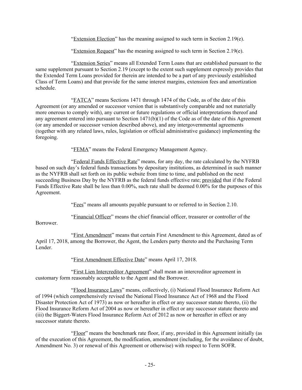 “Extension Election” has the meaning assigned to such term in Section 2.19(e). “Extension Request” has the meaning assigned to such term in Section 2.19(e). “Extension Series” means all Extended Term Loans that are established pursuant to the same supplement pursuant to Section 2.19 (except to the extent such supplement expressly provides that the Extended Term Loans provided for therein are intended to be a part of any previously established Class of Term Loans) and that provide for the same interest margins, extension fees and amortization schedule. “FATCA” means Sections 1471 through 1474 of the Code, as of the date of this Agreement (or any amended or successor version that is substantively comparable and not materially more onerous to comply with), any current or future regulations or official interpretations thereof and any agreement entered into pursuant to Section 1471(b)(1) of the Code as of the date of this Agreement (or any amended or successor version described above), and any intergovernmental agreements (together with any related laws, rules, legislation or official administrative guidance) implementing the foregoing. “FEMA” means the Federal Emergency Management Agency. “Federal Funds Effective Rate” means, for any day, the rate calculated by the NYFRB based on such day’s federal funds transactions by depositary institutions, as determined in such manner as the NYFRB shall set forth on its public website from time to time, and published on the next succeeding Business Day by the NYFRB as the federal funds effective rate; provided that if the Federal Funds Effective Rate shall be less than 0.00%, such rate shall be deemed 0.00% for the purposes of this Agreement. “Fees” means all amounts payable pursuant to or referred to in Section 2.10. “Financial Officer” means the chief financial officer, treasurer or controller of the Borrower. “First Amendment” means that certain First Amendment to this Agreement, dated as of April 17, 2018, among the Borrower, the Agent, the Lenders party thereto and the Purchasing Term Lender. “First Amendment Effective Date” means April 17, 2018. “First Lien Intercreditor Agreement” shall mean an intercreditor agreement in customary form reasonably acceptable to the Agent and the Borrower. “Flood Insurance Laws” means, collectively, (i) National Flood Insurance Reform Act of 1994 (which comprehensively revised the National Flood Insurance Act of 1968 and the Flood Disaster Protection Act of 1973) as now or hereafter in effect or any successor statute thereto, (ii) the Flood Insurance Reform Act of 2004 as now or hereafter in effect or any successor statute thereto and (iii) the Biggert-Waters Flood Insurance Reform Act of 2012 as now or hereafter in effect or any successor statute thereto. “Floor” means the benchmark rate floor, if any, provided in this Agreement initially (as of the execution of this Agreement, the modification, amendment (including, for the avoidance of doubt, Amendment No. 3) or renewal of this Agreement or otherwise) with respect to Term SOFR. - 25-