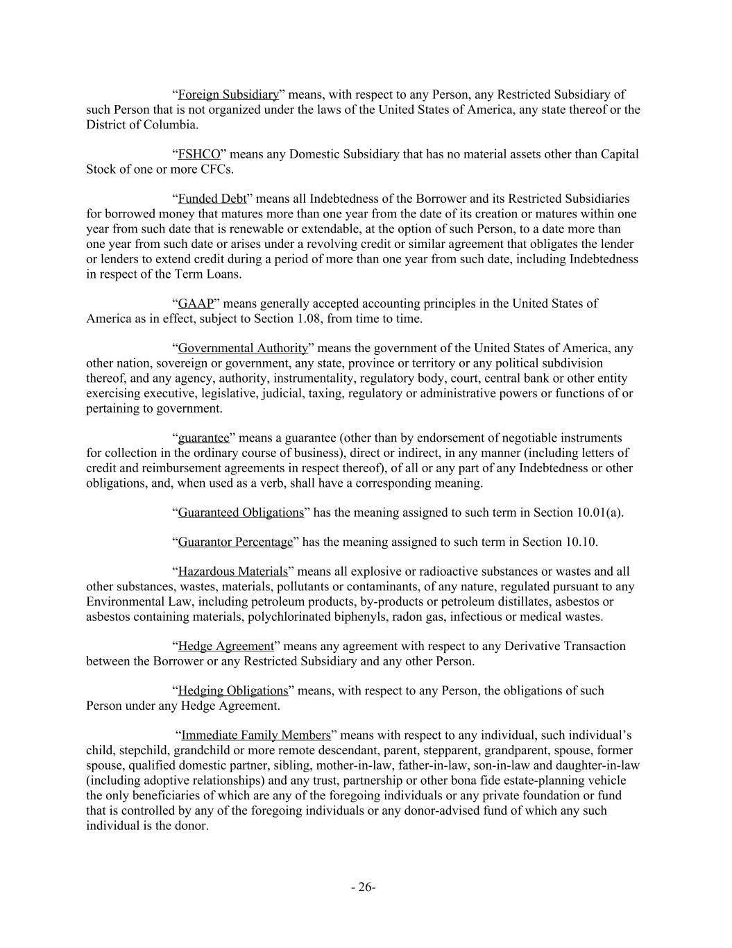 “Foreign Subsidiary” means, with respect to any Person, any Restricted Subsidiary of such Person that is not organized under the laws of the United States of America, any state thereof or the District of Columbia. “FSHCO” means any Domestic Subsidiary that has no material assets other than Capital Stock of one or more CFCs. “Funded Debt” means all Indebtedness of the Borrower and its Restricted Subsidiaries for borrowed money that matures more than one year from the date of its creation or matures within one year from such date that is renewable or extendable, at the option of such Person, to a date more than one year from such date or arises under a revolving credit or similar agreement that obligates the lender or lenders to extend credit during a period of more than one year from such date, including Indebtedness in respect of the Term Loans. “GAAP” means generally accepted accounting principles in the United States of America as in effect, subject to Section 1.08, from time to time. “Governmental Authority” means the government of the United States of America, any other nation, sovereign or government, any state, province or territory or any political subdivision thereof, and any agency, authority, instrumentality, regulatory body, court, central bank or other entity exercising executive, legislative, judicial, taxing, regulatory or administrative powers or functions of or pertaining to government. “guarantee” means a guarantee (other than by endorsement of negotiable instruments for collection in the ordinary course of business), direct or indirect, in any manner (including letters of credit and reimbursement agreements in respect thereof), of all or any part of any Indebtedness or other obligations, and, when used as a verb, shall have a corresponding meaning. “Guaranteed Obligations” has the meaning assigned to such term in Section 10.01(a). “Guarantor Percentage” has the meaning assigned to such term in Section 10.10. “Hazardous Materials” means all explosive or radioactive substances or wastes and all other substances, wastes, materials, pollutants or contaminants, of any nature, regulated pursuant to any Environmental Law, including petroleum products, by-products or petroleum distillates, asbestos or asbestos containing materials, polychlorinated biphenyls, radon gas, infectious or medical wastes. “Hedge Agreement” means any agreement with respect to any Derivative Transaction between the Borrower or any Restricted Subsidiary and any other Person. “Hedging Obligations” means, with respect to any Person, the obligations of such Person under any Hedge Agreement. “Immediate Family Members” means with respect to any individual, such individual’s child, stepchild, grandchild or more remote descendant, parent, stepparent, grandparent, spouse, former spouse, qualified domestic partner, sibling, mother-in-law, father-in-law, son-in-law and daughter-in-law (including adoptive relationships) and any trust, partnership or other bona fide estate-planning vehicle the only beneficiaries of which are any of the foregoing individuals or any private foundation or fund that is controlled by any of the foregoing individuals or any donor-advised fund of which any such individual is the donor. - 26-