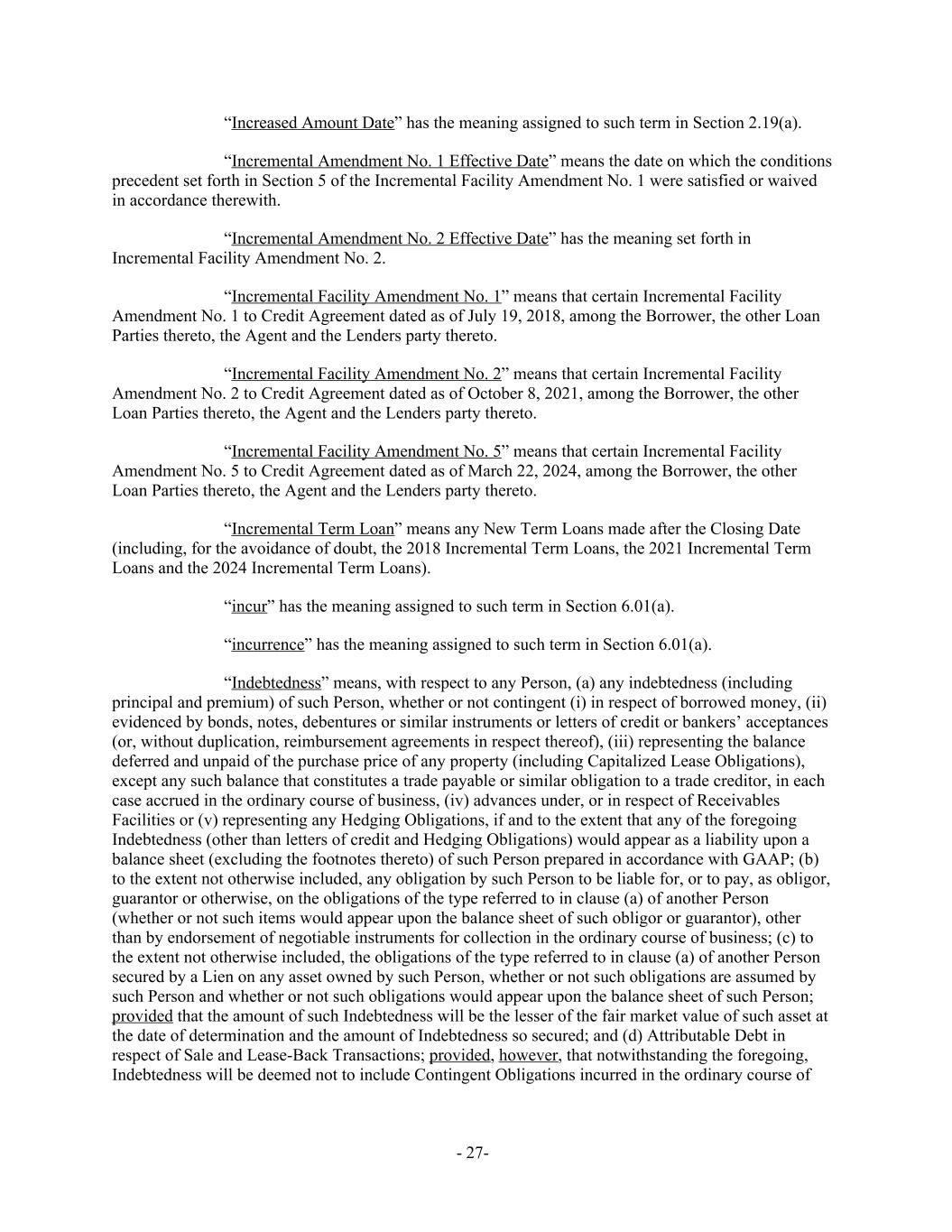 “Increased Amount Date” has the meaning assigned to such term in Section 2.19(a). “Incremental Amendment No. 1 Effective Date” means the date on which the conditions precedent set forth in Section 5 of the Incremental Facility Amendment No. 1 were satisfied or waived in accordance therewith. “Incremental Amendment No. 2 Effective Date” has the meaning set forth in Incremental Facility Amendment No. 2. “Incremental Facility Amendment No. 1” means that certain Incremental Facility Amendment No. 1 to Credit Agreement dated as of July 19, 2018, among the Borrower, the other Loan Parties thereto, the Agent and the Lenders party thereto. “Incremental Facility Amendment No. 2” means that certain Incremental Facility Amendment No. 2 to Credit Agreement dated as of October 8, 2021, among the Borrower, the other Loan Parties thereto, the Agent and the Lenders party thereto. “Incremental Facility Amendment No. 5” means that certain Incremental Facility Amendment No. 5 to Credit Agreement dated as of March 22, 2024, among the Borrower, the other Loan Parties thereto, the Agent and the Lenders party thereto. “Incremental Term Loan” means any New Term Loans made after the Closing Date (including, for the avoidance of doubt, the 2018 Incremental Term Loans, the 2021 Incremental Term Loans and the 2024 Incremental Term Loans). “incur” has the meaning assigned to such term in Section 6.01(a). “incurrence” has the meaning assigned to such term in Section 6.01(a). “Indebtedness” means, with respect to any Person, (a) any indebtedness (including principal and premium) of such Person, whether or not contingent (i) in respect of borrowed money, (ii) evidenced by bonds, notes, debentures or similar instruments or letters of credit or bankers’ acceptances (or, without duplication, reimbursement agreements in respect thereof), (iii) representing the balance deferred and unpaid of the purchase price of any property (including Capitalized Lease Obligations), except any such balance that constitutes a trade payable or similar obligation to a trade creditor, in each case accrued in the ordinary course of business, (iv) advances under, or in respect of Receivables Facilities or (v) representing any Hedging Obligations, if and to the extent that any of the foregoing Indebtedness (other than letters of credit and Hedging Obligations) would appear as a liability upon a balance sheet (excluding the footnotes thereto) of such Person prepared in accordance with GAAP; (b) to the extent not otherwise included, any obligation by such Person to be liable for, or to pay, as obligor, guarantor or otherwise, on the obligations of the type referred to in clause (a) of another Person (whether or not such items would appear upon the balance sheet of such obligor or guarantor), other than by endorsement of negotiable instruments for collection in the ordinary course of business; (c) to the extent not otherwise included, the obligations of the type referred to in clause (a) of another Person secured by a Lien on any asset owned by such Person, whether or not such obligations are assumed by such Person and whether or not such obligations would appear upon the balance sheet of such Person; provided that the amount of such Indebtedness will be the lesser of the fair market value of such asset at the date of determination and the amount of Indebtedness so secured; and (d) Attributable Debt in respect of Sale and Lease-Back Transactions; provided, however, that notwithstanding the foregoing, Indebtedness will be deemed not to include Contingent Obligations incurred in the ordinary course of - 27-