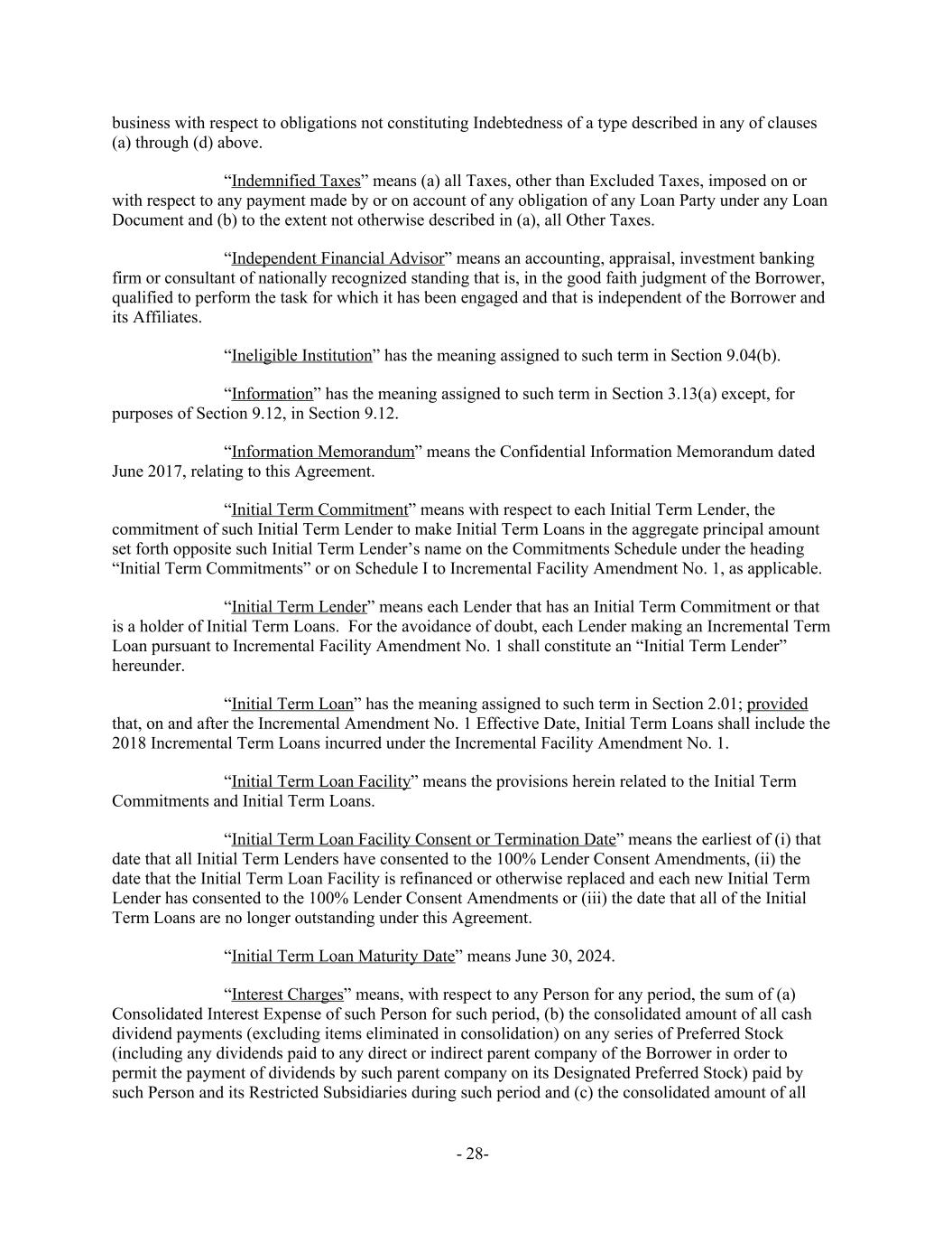 business with respect to obligations not constituting Indebtedness of a type described in any of clauses (a) through (d) above. “Indemnified Taxes” means (a) all Taxes, other than Excluded Taxes, imposed on or with respect to any payment made by or on account of any obligation of any Loan Party under any Loan Document and (b) to the extent not otherwise described in (a), all Other Taxes. “Independent Financial Advisor” means an accounting, appraisal, investment banking firm or consultant of nationally recognized standing that is, in the good faith judgment of the Borrower, qualified to perform the task for which it has been engaged and that is independent of the Borrower and its Affiliates. “Ineligible Institution” has the meaning assigned to such term in Section 9.04(b). “Information” has the meaning assigned to such term in Section 3.13(a) except, for purposes of Section 9.12, in Section 9.12. “Information Memorandum” means the Confidential Information Memorandum dated June 2017, relating to this Agreement. “Initial Term Commitment” means with respect to each Initial Term Lender, the commitment of such Initial Term Lender to make Initial Term Loans in the aggregate principal amount set forth opposite such Initial Term Lender’s name on the Commitments Schedule under the heading “Initial Term Commitments” or on Schedule I to Incremental Facility Amendment No. 1, as applicable. “Initial Term Lender” means each Lender that has an Initial Term Commitment or that is a holder of Initial Term Loans. For the avoidance of doubt, each Lender making an Incremental Term Loan pursuant to Incremental Facility Amendment No. 1 shall constitute an “Initial Term Lender” hereunder. “Initial Term Loan” has the meaning assigned to such term in Section 2.01; provided that, on and after the Incremental Amendment No. 1 Effective Date, Initial Term Loans shall include the 2018 Incremental Term Loans incurred under the Incremental Facility Amendment No. 1. “Initial Term Loan Facility” means the provisions herein related to the Initial Term Commitments and Initial Term Loans. “Initial Term Loan Facility Consent or Termination Date” means the earliest of (i) that date that all Initial Term Lenders have consented to the 100% Lender Consent Amendments, (ii) the date that the Initial Term Loan Facility is refinanced or otherwise replaced and each new Initial Term Lender has consented to the 100% Lender Consent Amendments or (iii) the date that all of the Initial Term Loans are no longer outstanding under this Agreement. “Initial Term Loan Maturity Date” means June 30, 2024. “Interest Charges” means, with respect to any Person for any period, the sum of (a) Consolidated Interest Expense of such Person for such period, (b) the consolidated amount of all cash dividend payments (excluding items eliminated in consolidation) on any series of Preferred Stock (including any dividends paid to any direct or indirect parent company of the Borrower in order to permit the payment of dividends by such parent company on its Designated Preferred Stock) paid by such Person and its Restricted Subsidiaries during such period and (c) the consolidated amount of all - 28-