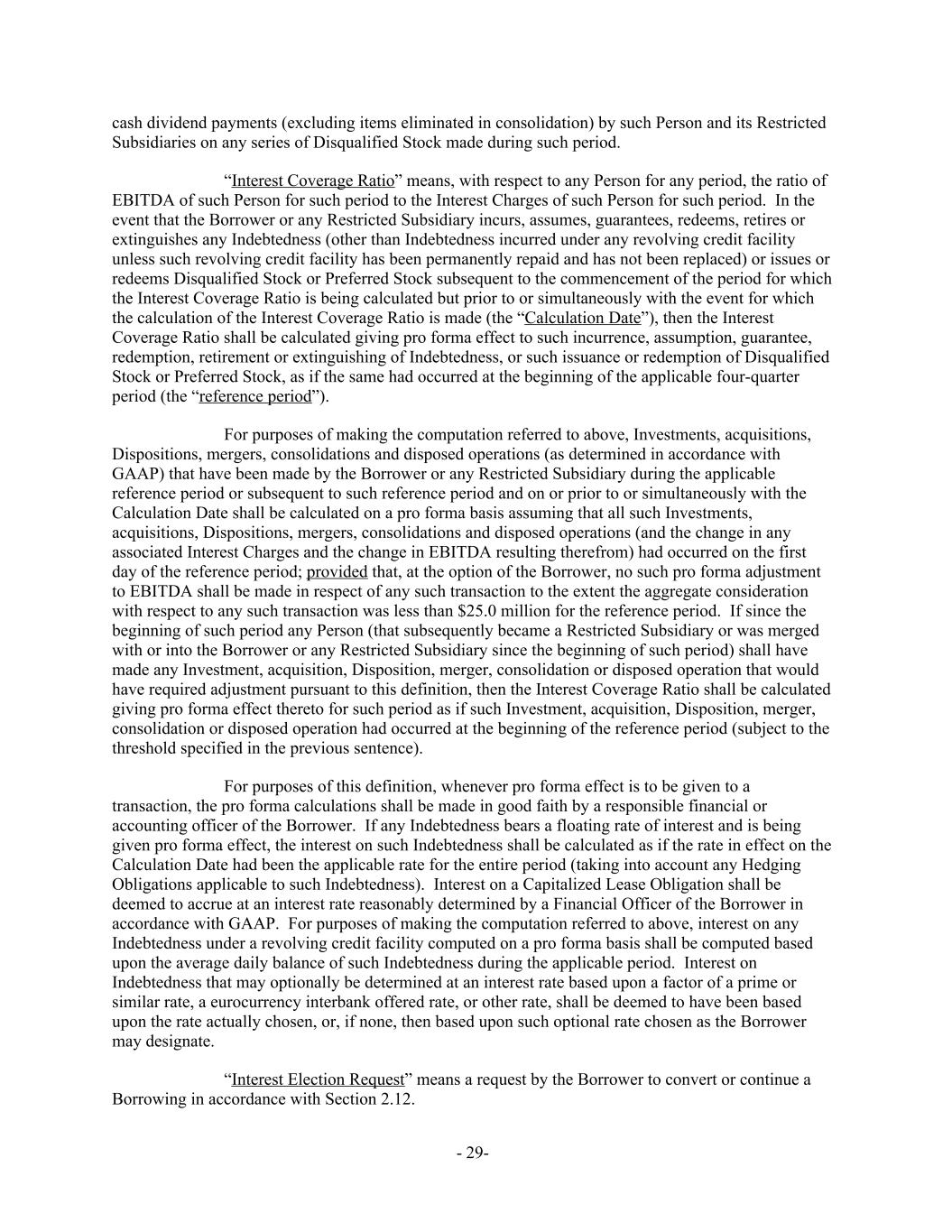 cash dividend payments (excluding items eliminated in consolidation) by such Person and its Restricted Subsidiaries on any series of Disqualified Stock made during such period. “Interest Coverage Ratio” means, with respect to any Person for any period, the ratio of EBITDA of such Person for such period to the Interest Charges of such Person for such period. In the event that the Borrower or any Restricted Subsidiary incurs, assumes, guarantees, redeems, retires or extinguishes any Indebtedness (other than Indebtedness incurred under any revolving credit facility unless such revolving credit facility has been permanently repaid and has not been replaced) or issues or redeems Disqualified Stock or Preferred Stock subsequent to the commencement of the period for which the Interest Coverage Ratio is being calculated but prior to or simultaneously with the event for which the calculation of the Interest Coverage Ratio is made (the “Calculation Date”), then the Interest Coverage Ratio shall be calculated giving pro forma effect to such incurrence, assumption, guarantee, redemption, retirement or extinguishing of Indebtedness, or such issuance or redemption of Disqualified Stock or Preferred Stock, as if the same had occurred at the beginning of the applicable four-quarter period (the “reference period”). For purposes of making the computation referred to above, Investments, acquisitions, Dispositions, mergers, consolidations and disposed operations (as determined in accordance with GAAP) that have been made by the Borrower or any Restricted Subsidiary during the applicable reference period or subsequent to such reference period and on or prior to or simultaneously with the Calculation Date shall be calculated on a pro forma basis assuming that all such Investments, acquisitions, Dispositions, mergers, consolidations and disposed operations (and the change in any associated Interest Charges and the change in EBITDA resulting therefrom) had occurred on the first day of the reference period; provided that, at the option of the Borrower, no such pro forma adjustment to EBITDA shall be made in respect of any such transaction to the extent the aggregate consideration with respect to any such transaction was less than $25.0 million for the reference period. If since the beginning of such period any Person (that subsequently became a Restricted Subsidiary or was merged with or into the Borrower or any Restricted Subsidiary since the beginning of such period) shall have made any Investment, acquisition, Disposition, merger, consolidation or disposed operation that would have required adjustment pursuant to this definition, then the Interest Coverage Ratio shall be calculated giving pro forma effect thereto for such period as if such Investment, acquisition, Disposition, merger, consolidation or disposed operation had occurred at the beginning of the reference period (subject to the threshold specified in the previous sentence). For purposes of this definition, whenever pro forma effect is to be given to a transaction, the pro forma calculations shall be made in good faith by a responsible financial or accounting officer of the Borrower. If any Indebtedness bears a floating rate of interest and is being given pro forma effect, the interest on such Indebtedness shall be calculated as if the rate in effect on the Calculation Date had been the applicable rate for the entire period (taking into account any Hedging Obligations applicable to such Indebtedness). Interest on a Capitalized Lease Obligation shall be deemed to accrue at an interest rate reasonably determined by a Financial Officer of the Borrower in accordance with GAAP. For purposes of making the computation referred to above, interest on any Indebtedness under a revolving credit facility computed on a pro forma basis shall be computed based upon the average daily balance of such Indebtedness during the applicable period. Interest on Indebtedness that may optionally be determined at an interest rate based upon a factor of a prime or similar rate, a eurocurrency interbank offered rate, or other rate, shall be deemed to have been based upon the rate actually chosen, or, if none, then based upon such optional rate chosen as the Borrower may designate. “Interest Election Request” means a request by the Borrower to convert or continue a Borrowing in accordance with Section 2.12. - 29-