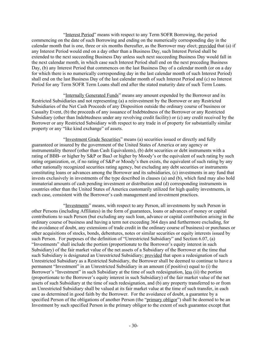 “Interest Period” means with respect to any Term SOFR Borrowing, the period commencing on the date of such Borrowing and ending on the numerically corresponding day in the calendar month that is one, three or six months thereafter, as the Borrower may elect; provided that (a) if any Interest Period would end on a day other than a Business Day, such Interest Period shall be extended to the next succeeding Business Day unless such next succeeding Business Day would fall in the next calendar month, in which case such Interest Period shall end on the next preceding Business Day, (b) any Interest Period that commences on the last Business Day of a calendar month (or on a day for which there is no numerically corresponding day in the last calendar month of such Interest Period) shall end on the last Business Day of the last calendar month of such Interest Period and (c) no Interest Period for any Term SOFR Term Loans shall end after the stated maturity date of such Term Loans. “Internally Generated Funds” means any amount expended by the Borrower and its Restricted Subsidiaries and not representing (a) a reinvestment by the Borrower or any Restricted Subsidiaries of the Net Cash Proceeds of any Disposition outside the ordinary course of business or Casualty Event, (b) the proceeds of any issuance of Indebtedness of the Borrower or any Restricted Subsidiary (other than Indebtedness under any revolving credit facility) or (c) any credit received by the Borrower or any Restricted Subsidiary with respect to any trade in of property for substantially similar property or any “like kind exchange” of assets. “Investment Grade Securities” means (a) securities issued or directly and fully guaranteed or insured by the government of the United States of America or any agency or instrumentality thereof (other than Cash Equivalents), (b) debt securities or debt instruments with a rating of BBB- or higher by S&P or Baa3 or higher by Moody’s or the equivalent of such rating by such rating organization, or, if no rating of S&P or Moody’s then exists, the equivalent of such rating by any other nationally recognized securities rating agency, but excluding any debt securities or instruments constituting loans or advances among the Borrower and its subsidiaries, (c) investments in any fund that invests exclusively in investments of the type described in clauses (a) and (b), which fund may also hold immaterial amounts of cash pending investment or distribution and (d) corresponding instruments in countries other than the United States of America customarily utilized for high quality investments, in each case, consistent with the Borrower’s cash management and investment practices. “Investments” means, with respect to any Person, all investments by such Person in other Persons (including Affiliates) in the form of guarantees, loans or advances of money or capital contributions to such Person (but excluding any such loan, advance or capital contribution arising in the ordinary course of business and having a term not exceeding 364 days and furthermore excluding, for the avoidance of doubt, any extensions of trade credit in the ordinary course of business) or purchases or other acquisitions of stocks, bonds, debentures, notes or similar securities or equity interests issued by such Person. For purposes of the definition of “Unrestricted Subsidiary” and Section 6.07, (a) “Investments” shall include the portion (proportionate to the Borrower’s equity interest in such Subsidiary) of the fair market value of the net assets of a Subsidiary of the Borrower at the time that such Subsidiary is designated an Unrestricted Subsidiary; provided that upon a redesignation of such Unrestricted Subsidiary as a Restricted Subsidiary, the Borrower shall be deemed to continue to have a permanent “Investment” in an Unrestricted Subsidiary in an amount (if positive) equal to (i) the Borrower’s “Investment” in such Subsidiary at the time of such redesignation, less (ii) the portion (proportionate to the Borrower’s equity interest in such Subsidiary) of the fair market value of the net assets of such Subsidiary at the time of such redesignation, and (b) any property transferred to or from an Unrestricted Subsidiary shall be valued at its fair market value at the time of such transfer, in each case as determined in good faith by the Borrower. For the avoidance of doubt, a guarantee by a specified Person of the obligations of another Person (the “primary obligor”) shall be deemed to be an Investment by such specified Person in the primary obligor to the extent of such guarantee except that - 30-