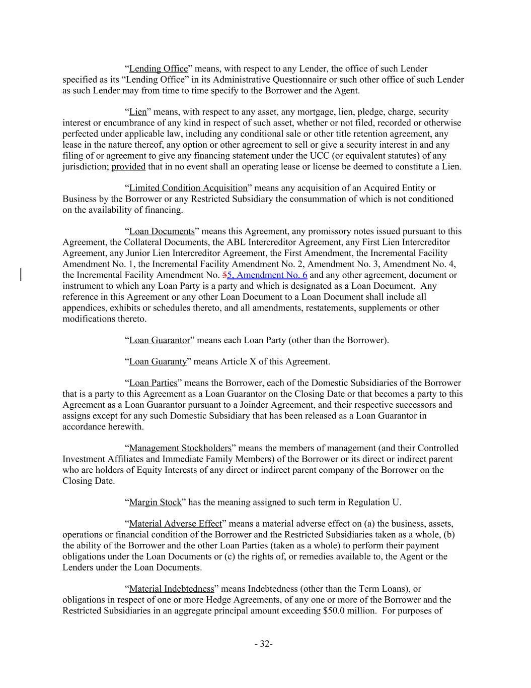 “Lending Office” means, with respect to any Lender, the office of such Lender specified as its “Lending Office” in its Administrative Questionnaire or such other office of such Lender as such Lender may from time to time specify to the Borrower and the Agent. “Lien” means, with respect to any asset, any mortgage, lien, pledge, charge, security interest or encumbrance of any kind in respect of such asset, whether or not filed, recorded or otherwise perfected under applicable law, including any conditional sale or other title retention agreement, any lease in the nature thereof, any option or other agreement to sell or give a security interest in and any filing of or agreement to give any financing statement under the UCC (or equivalent statutes) of any jurisdiction; provided that in no event shall an operating lease or license be deemed to constitute a Lien. “Limited Condition Acquisition” means any acquisition of an Acquired Entity or Business by the Borrower or any Restricted Subsidiary the consummation of which is not conditioned on the availability of financing. “Loan Documents” means this Agreement, any promissory notes issued pursuant to this Agreement, the Collateral Documents, the ABL Intercreditor Agreement, any First Lien Intercreditor Agreement, any Junior Lien Intercreditor Agreement, the First Amendment, the Incremental Facility Amendment No. 1, the Incremental Facility Amendment No. 2, Amendment No. 3, Amendment No. 4, the Incremental Facility Amendment No. 55, Amendment No. 6 and any other agreement, document or instrument to which any Loan Party is a party and which is designated as a Loan Document. Any reference in this Agreement or any other Loan Document to a Loan Document shall include all appendices, exhibits or schedules thereto, and all amendments, restatements, supplements or other modifications thereto. “Loan Guarantor” means each Loan Party (other than the Borrower). “Loan Guaranty” means Article X of this Agreement. “Loan Parties” means the Borrower, each of the Domestic Subsidiaries of the Borrower that is a party to this Agreement as a Loan Guarantor on the Closing Date or that becomes a party to this Agreement as a Loan Guarantor pursuant to a Joinder Agreement, and their respective successors and assigns except for any such Domestic Subsidiary that has been released as a Loan Guarantor in accordance herewith. “Management Stockholders” means the members of management (and their Controlled Investment Affiliates and Immediate Family Members) of the Borrower or its direct or indirect parent who are holders of Equity Interests of any direct or indirect parent company of the Borrower on the Closing Date. “Margin Stock” has the meaning assigned to such term in Regulation U. “Material Adverse Effect” means a material adverse effect on (a) the business, assets, operations or financial condition of the Borrower and the Restricted Subsidiaries taken as a whole, (b) the ability of the Borrower and the other Loan Parties (taken as a whole) to perform their payment obligations under the Loan Documents or (c) the rights of, or remedies available to, the Agent or the Lenders under the Loan Documents. “Material Indebtedness” means Indebtedness (other than the Term Loans), or obligations in respect of one or more Hedge Agreements, of any one or more of the Borrower and the Restricted Subsidiaries in an aggregate principal amount exceeding $50.0 million. For purposes of - 32-