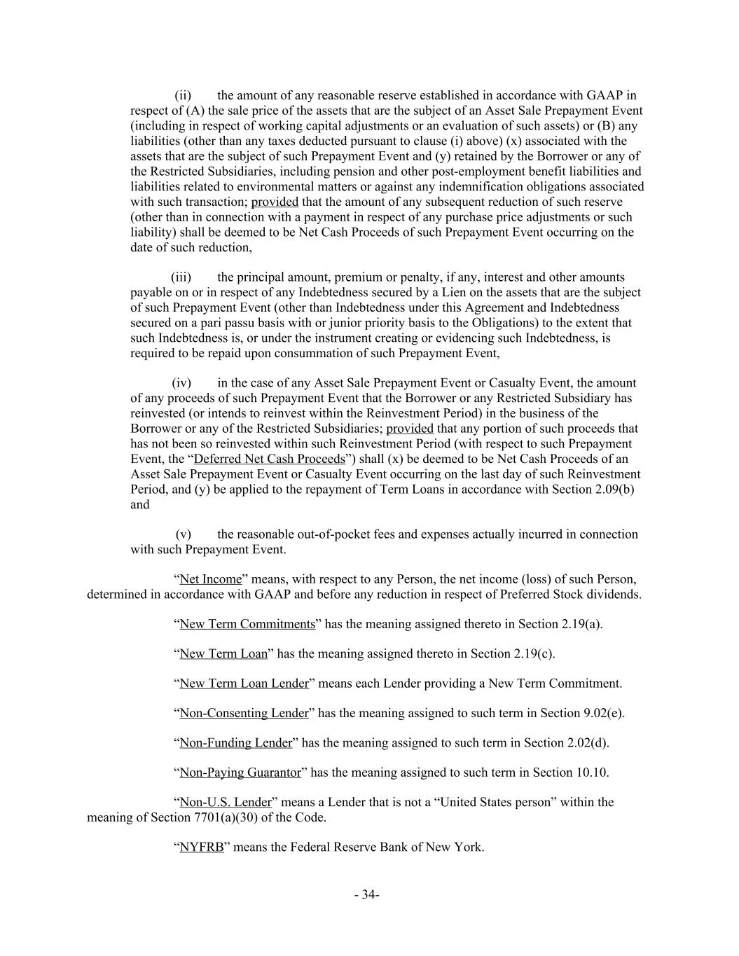 (ii) the amount of any reasonable reserve established in accordance with GAAP in respect of (A) the sale price of the assets that are the subject of an Asset Sale Prepayment Event (including in respect of working capital adjustments or an evaluation of such assets) or (B) any liabilities (other than any taxes deducted pursuant to clause (i) above) (x) associated with the assets that are the subject of such Prepayment Event and (y) retained by the Borrower or any of the Restricted Subsidiaries, including pension and other post-employment benefit liabilities and liabilities related to environmental matters or against any indemnification obligations associated with such transaction; provided that the amount of any subsequent reduction of such reserve (other than in connection with a payment in respect of any purchase price adjustments or such liability) shall be deemed to be Net Cash Proceeds of such Prepayment Event occurring on the date of such reduction, (iii) the principal amount, premium or penalty, if any, interest and other amounts payable on or in respect of any Indebtedness secured by a Lien on the assets that are the subject of such Prepayment Event (other than Indebtedness under this Agreement and Indebtedness secured on a pari passu basis with or junior priority basis to the Obligations) to the extent that such Indebtedness is, or under the instrument creating or evidencing such Indebtedness, is required to be repaid upon consummation of such Prepayment Event, (iv) in the case of any Asset Sale Prepayment Event or Casualty Event, the amount of any proceeds of such Prepayment Event that the Borrower or any Restricted Subsidiary has reinvested (or intends to reinvest within the Reinvestment Period) in the business of the Borrower or any of the Restricted Subsidiaries; provided that any portion of such proceeds that has not been so reinvested within such Reinvestment Period (with respect to such Prepayment Event, the “Deferred Net Cash Proceeds”) shall (x) be deemed to be Net Cash Proceeds of an Asset Sale Prepayment Event or Casualty Event occurring on the last day of such Reinvestment Period, and (y) be applied to the repayment of Term Loans in accordance with Section 2.09(b) and (v) the reasonable out-of-pocket fees and expenses actually incurred in connection with such Prepayment Event. “Net Income” means, with respect to any Person, the net income (loss) of such Person, determined in accordance with GAAP and before any reduction in respect of Preferred Stock dividends. “New Term Commitments” has the meaning assigned thereto in Section 2.19(a). “New Term Loan” has the meaning assigned thereto in Section 2.19(c). “New Term Loan Lender” means each Lender providing a New Term Commitment. “Non-Consenting Lender” has the meaning assigned to such term in Section 9.02(e). “Non-Funding Lender” has the meaning assigned to such term in Section 2.02(d). “Non-Paying Guarantor” has the meaning assigned to such term in Section 10.10. “Non-U.S. Lender” means a Lender that is not a “United States person” within the meaning of Section 7701(a)(30) of the Code. “NYFRB” means the Federal Reserve Bank of New York. - 34-