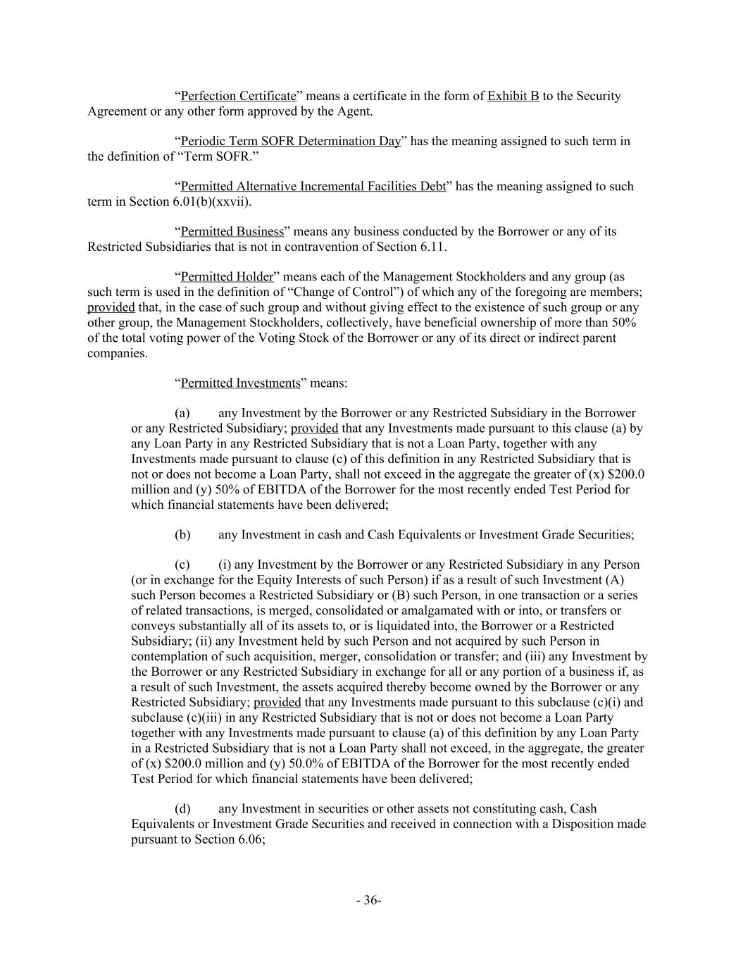 “Perfection Certificate” means a certificate in the form of Exhibit B to the Security Agreement or any other form approved by the Agent. “Periodic Term SOFR Determination Day” has the meaning assigned to such term in the definition of “Term SOFR.” “Permitted Alternative Incremental Facilities Debt” has the meaning assigned to such term in Section 6.01(b)(xxvii). “Permitted Business” means any business conducted by the Borrower or any of its Restricted Subsidiaries that is not in contravention of Section 6.11. “Permitted Holder” means each of the Management Stockholders and any group (as such term is used in the definition of “Change of Control”) of which any of the foregoing are members; provided that, in the case of such group and without giving effect to the existence of such group or any other group, the Management Stockholders, collectively, have beneficial ownership of more than 50% of the total voting power of the Voting Stock of the Borrower or any of its direct or indirect parent companies. “Permitted Investments” means: (a) any Investment by the Borrower or any Restricted Subsidiary in the Borrower or any Restricted Subsidiary; provided that any Investments made pursuant to this clause (a) by any Loan Party in any Restricted Subsidiary that is not a Loan Party, together with any Investments made pursuant to clause (c) of this definition in any Restricted Subsidiary that is not or does not become a Loan Party, shall not exceed in the aggregate the greater of (x) $200.0 million and (y) 50% of EBITDA of the Borrower for the most recently ended Test Period for which financial statements have been delivered; (b) any Investment in cash and Cash Equivalents or Investment Grade Securities; (c) (i) any Investment by the Borrower or any Restricted Subsidiary in any Person (or in exchange for the Equity Interests of such Person) if as a result of such Investment (A) such Person becomes a Restricted Subsidiary or (B) such Person, in one transaction or a series of related transactions, is merged, consolidated or amalgamated with or into, or transfers or conveys substantially all of its assets to, or is liquidated into, the Borrower or a Restricted Subsidiary; (ii) any Investment held by such Person and not acquired by such Person in contemplation of such acquisition, merger, consolidation or transfer; and (iii) any Investment by the Borrower or any Restricted Subsidiary in exchange for all or any portion of a business if, as a result of such Investment, the assets acquired thereby become owned by the Borrower or any Restricted Subsidiary; provided that any Investments made pursuant to this subclause (c)(i) and subclause (c)(iii) in any Restricted Subsidiary that is not or does not become a Loan Party together with any Investments made pursuant to clause (a) of this definition by any Loan Party in a Restricted Subsidiary that is not a Loan Party shall not exceed, in the aggregate, the greater of (x) $200.0 million and (y) 50.0% of EBITDA of the Borrower for the most recently ended Test Period for which financial statements have been delivered; (d) any Investment in securities or other assets not constituting cash, Cash Equivalents or Investment Grade Securities and received in connection with a Disposition made pursuant to Section 6.06; - 36-