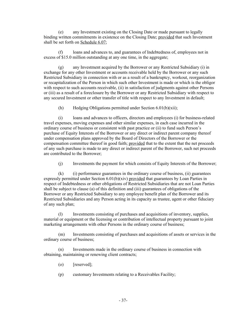 (e) any Investment existing on the Closing Date or made pursuant to legally binding written commitments in existence on the Closing Date; provided that such Investment shall be set forth on Schedule 6.07; (f) loans and advances to, and guarantees of Indebtedness of, employees not in excess of $15.0 million outstanding at any one time, in the aggregate; (g) any Investment acquired by the Borrower or any Restricted Subsidiary (i) in exchange for any other Investment or accounts receivable held by the Borrower or any such Restricted Subsidiary in connection with or as a result of a bankruptcy, workout, reorganization or recapitalization of the Person in which such other Investment is made or which is the obligor with respect to such accounts receivable, (ii) in satisfaction of judgments against other Persons or (iii) as a result of a foreclosure by the Borrower or any Restricted Subsidiary with respect to any secured Investment or other transfer of title with respect to any Investment in default; (h) Hedging Obligations permitted under Section 6.01(b)(xii); (i) loans and advances to officers, directors and employees (i) for business-related travel expenses, moving expenses and other similar expenses, in each case incurred in the ordinary course of business or consistent with past practice or (ii) to fund such Person’s purchase of Equity Interests of the Borrower or any direct or indirect parent company thereof under compensation plans approved by the Board of Directors of the Borrower or the compensation committee thereof in good faith; provided that to the extent that the net proceeds of any such purchase is made to any direct or indirect parent of the Borrower, such net proceeds are contributed to the Borrower; (j) Investments the payment for which consists of Equity Interests of the Borrower; (k) (i) performance guarantees in the ordinary course of business, (ii) guarantees expressly permitted under Section 6.01(b)(xiv) provided that guarantees by Loan Parties in respect of Indebtedness or other obligations of Restricted Subsidiaries that are not Loan Parties shall be subject to clause (a) of this definition and (iii) guarantees of obligations of the Borrower or any Restricted Subsidiary to any employee benefit plan of the Borrower and its Restricted Subsidiaries and any Person acting in its capacity as trustee, agent or other fiduciary of any such plan; (l) Investments consisting of purchases and acquisitions of inventory, supplies, material or equipment or the licensing or contribution of intellectual property pursuant to joint marketing arrangements with other Persons in the ordinary course of business; (m) Investments consisting of purchases and acquisitions of assets or services in the ordinary course of business; (n) Investments made in the ordinary course of business in connection with obtaining, maintaining or renewing client contracts; (o) [reserved]; (p) customary Investments relating to a Receivables Facility; - 37-