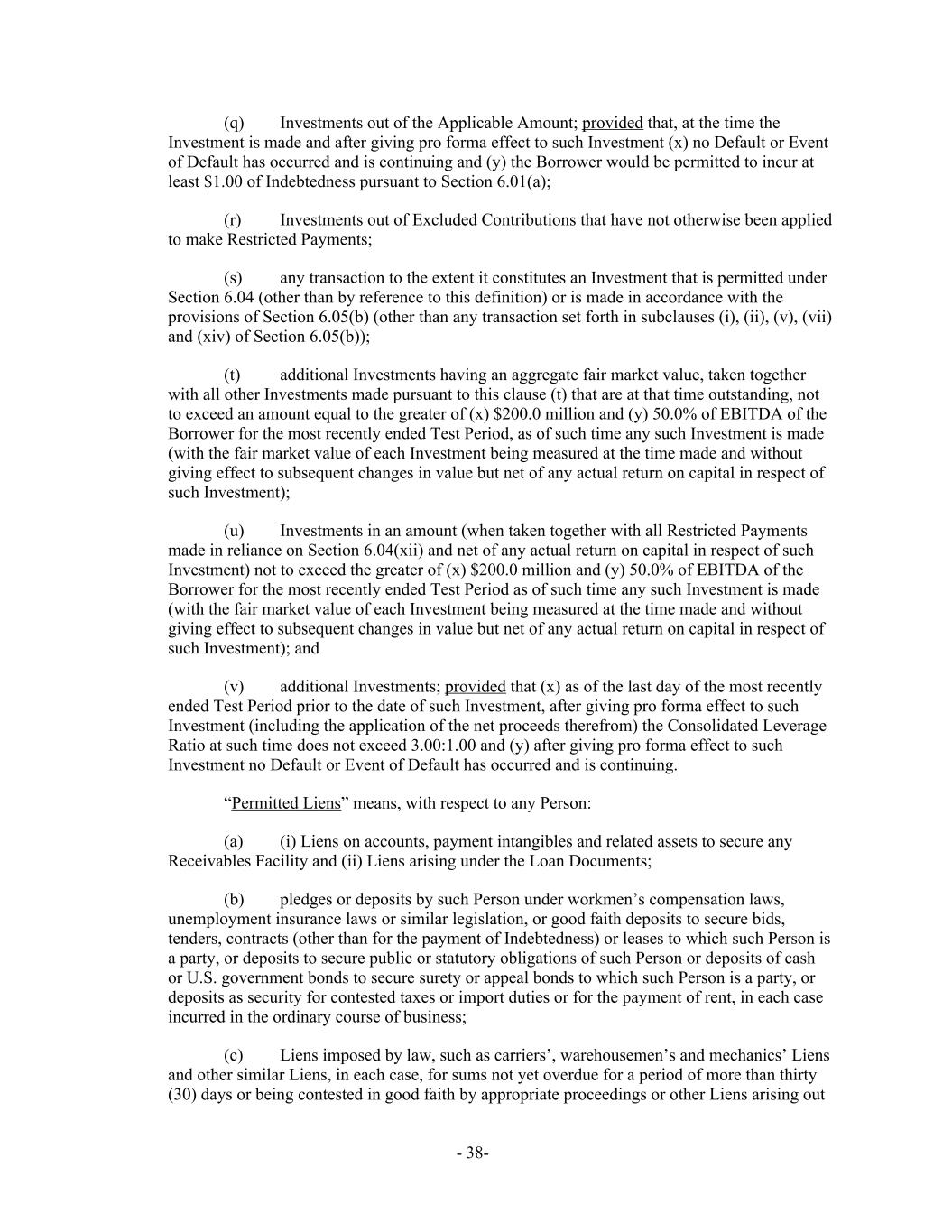(q) Investments out of the Applicable Amount; provided that, at the time the Investment is made and after giving pro forma effect to such Investment (x) no Default or Event of Default has occurred and is continuing and (y) the Borrower would be permitted to incur at least $1.00 of Indebtedness pursuant to Section 6.01(a); (r) Investments out of Excluded Contributions that have not otherwise been applied to make Restricted Payments; (s) any transaction to the extent it constitutes an Investment that is permitted under Section 6.04 (other than by reference to this definition) or is made in accordance with the provisions of Section 6.05(b) (other than any transaction set forth in subclauses (i), (ii), (v), (vii) and (xiv) of Section 6.05(b)); (t) additional Investments having an aggregate fair market value, taken together with all other Investments made pursuant to this clause (t) that are at that time outstanding, not to exceed an amount equal to the greater of (x) $200.0 million and (y) 50.0% of EBITDA of the Borrower for the most recently ended Test Period, as of such time any such Investment is made (with the fair market value of each Investment being measured at the time made and without giving effect to subsequent changes in value but net of any actual return on capital in respect of such Investment); (u) Investments in an amount (when taken together with all Restricted Payments made in reliance on Section 6.04(xii) and net of any actual return on capital in respect of such Investment) not to exceed the greater of (x) $200.0 million and (y) 50.0% of EBITDA of the Borrower for the most recently ended Test Period as of such time any such Investment is made (with the fair market value of each Investment being measured at the time made and without giving effect to subsequent changes in value but net of any actual return on capital in respect of such Investment); and (v) additional Investments; provided that (x) as of the last day of the most recently ended Test Period prior to the date of such Investment, after giving pro forma effect to such Investment (including the application of the net proceeds therefrom) the Consolidated Leverage Ratio at such time does not exceed 3.00:1.00 and (y) after giving pro forma effect to such Investment no Default or Event of Default has occurred and is continuing. “Permitted Liens” means, with respect to any Person: (a) (i) Liens on accounts, payment intangibles and related assets to secure any Receivables Facility and (ii) Liens arising under the Loan Documents; (b) pledges or deposits by such Person under workmen’s compensation laws, unemployment insurance laws or similar legislation, or good faith deposits to secure bids, tenders, contracts (other than for the payment of Indebtedness) or leases to which such Person is a party, or deposits to secure public or statutory obligations of such Person or deposits of cash or U.S. government bonds to secure surety or appeal bonds to which such Person is a party, or deposits as security for contested taxes or import duties or for the payment of rent, in each case incurred in the ordinary course of business; (c) Liens imposed by law, such as carriers’, warehousemen’s and mechanics’ Liens and other similar Liens, in each case, for sums not yet overdue for a period of more than thirty (30) days or being contested in good faith by appropriate proceedings or other Liens arising out - 38-