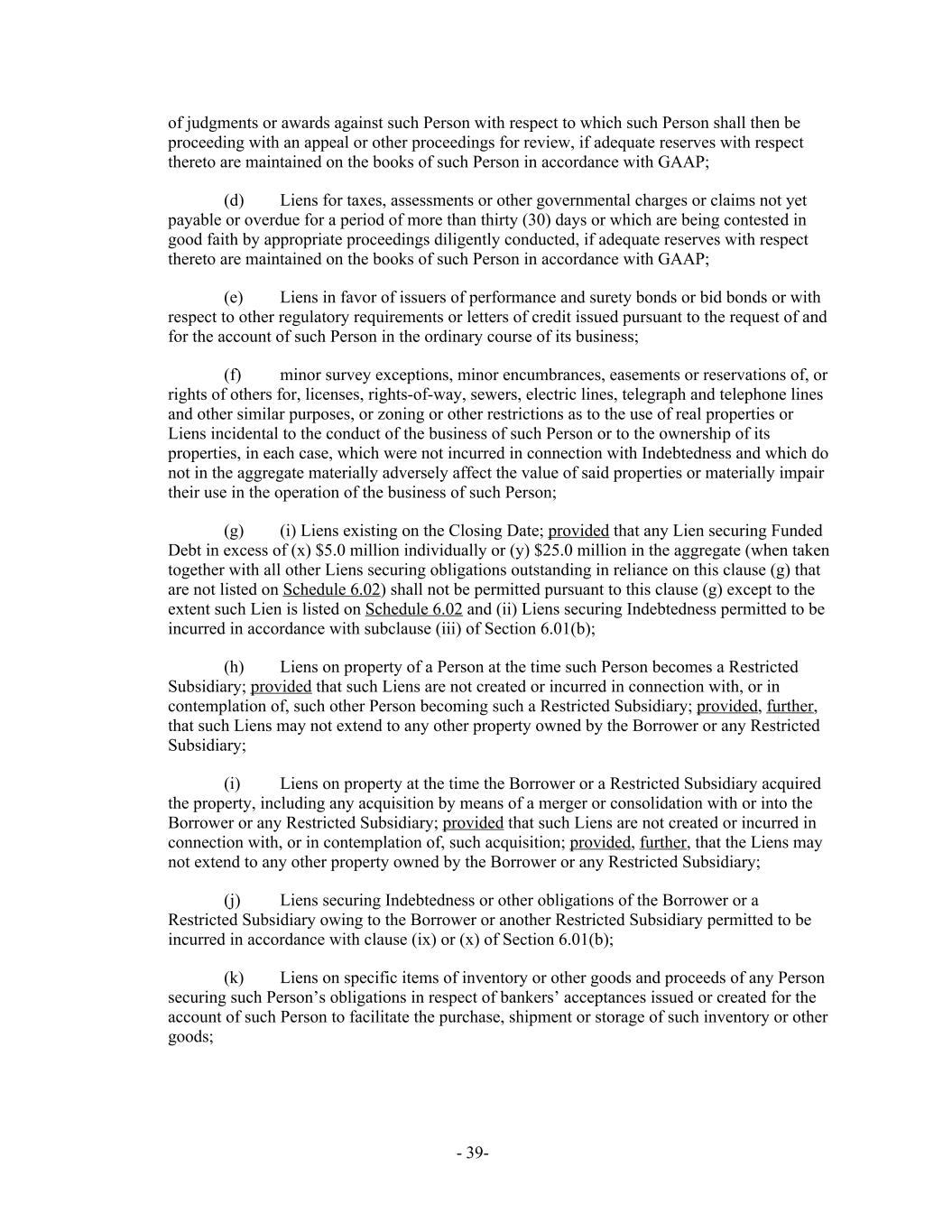 of judgments or awards against such Person with respect to which such Person shall then be proceeding with an appeal or other proceedings for review, if adequate reserves with respect thereto are maintained on the books of such Person in accordance with GAAP; (d) Liens for taxes, assessments or other governmental charges or claims not yet payable or overdue for a period of more than thirty (30) days or which are being contested in good faith by appropriate proceedings diligently conducted, if adequate reserves with respect thereto are maintained on the books of such Person in accordance with GAAP; (e) Liens in favor of issuers of performance and surety bonds or bid bonds or with respect to other regulatory requirements or letters of credit issued pursuant to the request of and for the account of such Person in the ordinary course of its business; (f) minor survey exceptions, minor encumbrances, easements or reservations of, or rights of others for, licenses, rights-of-way, sewers, electric lines, telegraph and telephone lines and other similar purposes, or zoning or other restrictions as to the use of real properties or Liens incidental to the conduct of the business of such Person or to the ownership of its properties, in each case, which were not incurred in connection with Indebtedness and which do not in the aggregate materially adversely affect the value of said properties or materially impair their use in the operation of the business of such Person; (g) (i) Liens existing on the Closing Date; provided that any Lien securing Funded Debt in excess of (x) $5.0 million individually or (y) $25.0 million in the aggregate (when taken together with all other Liens securing obligations outstanding in reliance on this clause (g) that are not listed on Schedule 6.02) shall not be permitted pursuant to this clause (g) except to the extent such Lien is listed on Schedule 6.02 and (ii) Liens securing Indebtedness permitted to be incurred in accordance with subclause (iii) of Section 6.01(b); (h) Liens on property of a Person at the time such Person becomes a Restricted Subsidiary; provided that such Liens are not created or incurred in connection with, or in contemplation of, such other Person becoming such a Restricted Subsidiary; provided, further, that such Liens may not extend to any other property owned by the Borrower or any Restricted Subsidiary; (i) Liens on property at the time the Borrower or a Restricted Subsidiary acquired the property, including any acquisition by means of a merger or consolidation with or into the Borrower or any Restricted Subsidiary; provided that such Liens are not created or incurred in connection with, or in contemplation of, such acquisition; provided, further, that the Liens may not extend to any other property owned by the Borrower or any Restricted Subsidiary; (j) Liens securing Indebtedness or other obligations of the Borrower or a Restricted Subsidiary owing to the Borrower or another Restricted Subsidiary permitted to be incurred in accordance with clause (ix) or (x) of Section 6.01(b); (k) Liens on specific items of inventory or other goods and proceeds of any Person securing such Person’s obligations in respect of bankers’ acceptances issued or created for the account of such Person to facilitate the purchase, shipment or storage of such inventory or other goods; - 39-